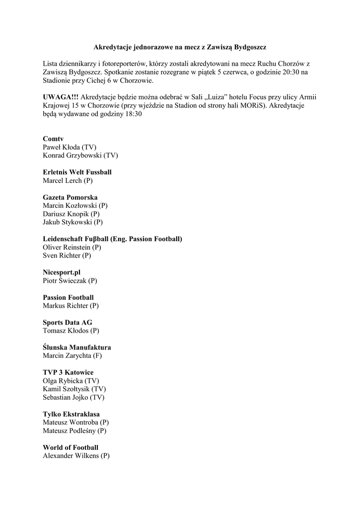 Akredytacje jednorazowe na mecz z Zawiszą Bydgoszcz Lista dziennikarzy i fotoreporterów, którzy zostali akredytowani na mecz Ruchu Chorzów z Zawiszą Bydgoszcz. Spotkanie zostanie rozegrane w piątek 5 czerwca, o godzinie 20:30 na Stadionie przy Cichej 6 w Chorzowie. UWAGA!!! Akredytacje będzie można odebrać w Sali „Luiza” hotelu Focus przy ulicy Armii Krajowej 15 w Chorzowie (przy wjeździe na Stadion od strony hali MORiS). Akredytacje będą wydawane od godziny 18:30 Comtv Paweł Kłoda (TV) Konrad Grzybowski (TV) Erletnis Welt Fussball Marcel Lerch (P) Gazeta Pomorska Marcin Kozłowski (P) Dariusz Knopik (P) Jakub Stykowski (P) Leidenschaft Fuβball (Eng. Passion Football) Oliver Reinstein (P) Sven Richter (P) Nicesport.pl Piotr Świeczak (P) Passion Football Markus Richter (P) Sports Data AG Tomasz Kłodos (P) Ślunska Manufaktura Marcin Zarychta (F) TVP 3 Katowice Olga Rybicka (TV) Kamil Szołtysik (TV) Sebastian Jojko (TV) Tylko Ekstraklasa Mateusz Wontroba (P) Mateusz Podleśny (P) World of Football Alexander Wilkens (P) Sebastian Westermann (P)