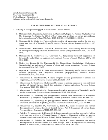 Dr hab. Szymon Matuszewski Pracownia Kryminalistyki Wydział Prawa i Administracji Uniwersytet im. Adama Mickiewicza w Poznaniu WYKAZ OPUBLIKOWANYCH PRAC NAUKOWYCH I. Artykuły w czasopismach ujętych w bazie Journal Citation Reports 1. Matuszewski S., Frątczak K., Konwerski S., Bajerlein D., Szpila K., Jarmusz M., Szafałowicz M., Grzywacz A., Mądra A., Effect of body mass and clothing on carrion entomofauna, International Journal of Legal Medicine 2015. DOI 10.1007/s00414-015-1145-y 2. Matuszewski S., Mądra A., Factors affecting quality of temperature models for the preappearance interval of forensically useful insects, Forensic Science International 2015, 247: 28-35. 3. Matuszewski S., Konwerski S., Frątczak K., Szafałowicz M., Effect of body mass and clothing on decomposition of pig carcasses, International Journal of Legal Medicine 2014, 128: 10391048. 4. Matuszewski S., Szafałowicz M., Grzywacz A., Temperature-dependent appearance of forensically useful flies on carcasses, International Journal of Legal Medicine 2014, 128: 1013-1020. 5. Mądra A., Konwerski S., Matuszewski S., Necrophilous Staphylininae (Coleoptera: Staphylinidae) as indicators of season of death and corpse relocation, Forensic Science International 2014, 242: 32-37. 6. Frątczak K., Matuszewski S., Instar determination in forensically useful beetles Necrodes littoralis (Silphidae) and Creophilus maxillosus (Staphylinidae), Forensic Science International 2014, 241: 20-26. 7. Matuszewski S., Szafałowicz M., A simple computer-assisted quantification of contrast in a fingerprint, Journal of Forensic Sciences 2013, 58: 1310-1313. 8. Matuszewski S., Szafałowicz M., Jarmusz M., Insects colonising carcasses in open and forest habitats of Central Europe: Search for indicators of corpse relocation, Forensic Science International 2013, 231: 234-239. 9. Matuszewski S., Szafałowicz M., Temperature-dependent appearance of forensically useful beetles on carcasses, Forensic Science International 2013, 229: 92-99. 10. Matuszewski S., Estimating the preappearance interval from temperature in Creophilus maxillosus L. (Coleoptera: Staphylinidae), Journal of Forensic Sciences 2012, 57: 136-145. 11. Matuszewski S., Estimating the pre-appearance interval from temperature in Necrodes littoralis L. (Coleoptera: Silphidae), Forensic Science International 2011, 212: 180-188. 12. Matuszewski S., Bajerlein D., Konwerski S., Szpila K., Insect succession and carrion decomposition in selected forests of Central Europe. Part 3: Succession of carrion fauna, Forensic Science International 2011, 207: 150-163. 13. Bajerlein D., Matuszewski S., Konwerski S., Insect succession on carrion: seasonality, habitat preference and residency of histerid beetles (Coleoptera: Histeridae) visiting pig carrion exposed in various forests (Western Poland), Polish Journal of Ecology 2011, 59: 787-797. 14. Matuszewski S., Bajerlein D., Konwerski S., Szpila K., Insect succession and carrion decomposition in selected forests of Central Europe. Part 2: Composition and residency patterns of carrion fauna, Forensic Science International 2010, 195: 42-51. 15. Matuszewski S., Bajerlein D., Konwerski S., Szpila K., Insect succession and carrion decomposition in selected forests of Central Europe. Part 1: Pattern and rate of decomposition, Forensic Science International 2010, 194: 85-93. 16. Matuszewski S., Bajerlein D., Konwerski S., Szpila K., An initial study of insect succession and carrion decomposition in various forest habitats of Central Europe, Forensic Science International 2008, 180: 61-69. II. Artykuły w innych czasopismach 17. Matuszewski S., Types of handwriting samples, Problems of Forensic Sciences 2011, 87: 181192. 18. Matuszewski S., Katalog owadów przydatnych do ustalania czasu śmierci w lasach Polski. Część 1: Wprowadzenie, Problemy Kryminalistyki 2010, 267: 5-17. 19. Matuszewski S., Szpila K., Katalog owadów przydatnych do ustalania czasu śmierci w lasach Polski. Część 2: Muchówki (Insecta: Diptera), Problemy Kryminalistyki 2010, 268: 26-38. 20. Matuszewski S., Bajerlein D., Konwerski S., Katalog owadów przydatnych do ustalania czasu śmierci w lasach Polski. Część 3: Chrząszcze (Insecta: Coleoptera), Problemy Kryminalistyki 2010, 269: 5-21. 21. Szpila K., Matuszewski S., Bajerlein D., Konwerski S., Chrysomya albiceps (Wiedemann, 1819), a forensically important blowfly (Diptera: Calliphoridae) new for the Polish fauna, Polskie Pismo Entomologiczne 2008, 77: 351-355. 22. Matuszewski S., Maciaszek J., Natural variation in length of signature components, Problems of Forensic Sciences 2008, 74: 182-189. 23. Matuszewski S., Bajerlein D., Konwerski S., Szpila K., Entomologia sądowa w Polsce, Wiadomości Entomologiczne 2008, 27: 49-52. 24. Szpila K., Grzywacz A., Matuszewski S., Bajerlein D., Konwerski S., Muscidae (Diptera) w sukcesji zwłok świni domowej w różnych typach lasów - wyniki wstępne, Dipteron 2007, 23: 62-64. 25. Szpila K., Matuszewski S., Bajerlein D., Konwerski S., Muchówki (Diptera) w badaniach sukcesji zwłok świni domowej w różnych typach lasu - wyniki wstępne, Dipteron 2006, 22: 40-41. 26. Matuszewski S., Co-occurence of natural variants of constructional features in female signatures, Problems of Forensic Sciences 2004, 60: 78-103. 27. Matuszewski S., Natural variation in selected constructional features of female signatures, Problems of Forensic Sciences 2004, 57: 24-43. 28. Matuszewski S., Kategoryczność (pewność) wypowiedzi świadka a jej prawdziwość, Problemy Współczesnej Kryminalistyki 2002, Tom V, s. 145-150. III. Rozdziały w książkach 29. Bajerlein D., Konwerski S., Matuszewski S., Szpila K., History, accomplishments, and challenges of forensic entomology in Europe. Poland (w:) Tomberlin J.K., Benbow M.E., Forensic Entomology. International Dimensions and Frontiers, CRC Press, Boca Raton 2015, s. 81-88. 30. Matuszewski S., Ocena uszkodzeń i zabrudzeń podłoża jako dowodów naklejenia i 