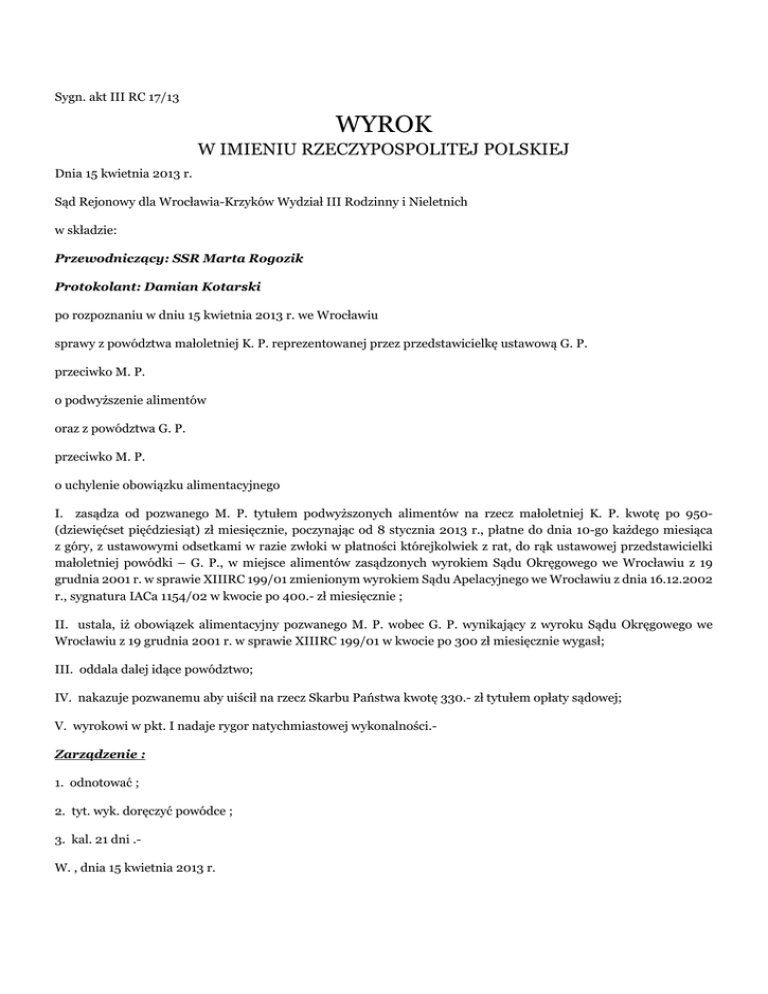 Sygn. akt III RC 17/13 WYROK W IMIENIU RZECZYPOSPOLITEJ POLSKIEJ Dnia 15 kwietnia 2013 r. Sąd Rejonowy dla Wrocławia-Krzyków Wydział III Rodzinny i Nieletnich w składzie: Przewodniczący: SSR Marta Rogozik Protokolant: Damian Kotarski po rozpoznaniu w dniu 15 kwietnia 2013 r. we Wrocławiu sprawy z powództwa małoletniej K. P. reprezentowanej przez przedstawicielkę ustawową G. P. przeciwko M. P. o podwyższenie alimentów oraz z powództwa G. P. przeciwko M. P. o uchylenie obowiązku alimentacyjnego I. zasądza od pozwanego M. P. tytułem podwyższonych alimentów na rzecz małoletniej K. P. kwotę po 950(dziewięćset pięćdziesiąt) zł miesięcznie, poczynając od 8 stycznia 2013 r., płatne do dnia 10-go każdego miesiąca z góry, z ustawowymi odsetkami w razie zwłoki w płatności którejkolwiek z rat, do rąk ustawowej przedstawicielki małoletniej powódki – G. P., w miejsce alimentów zasądzonych wyrokiem Sądu Okręgowego we Wrocławiu z 19 grudnia 2001 r. w sprawie XIIIRC 199/01 zmienionym wyrokiem Sądu Apelacyjnego we Wrocławiu z dnia 16.12.2002 r., sygnatura IACa 1154/02 w kwocie po 400.- zł miesięcznie ; II. ustala, iż obowiązek alimentacyjny pozwanego M. P. wobec G. P. wynikający z wyroku Sądu Okręgowego we Wrocławiu z 19 grudnia 2001 r. w sprawie XIIIRC 199/01 w kwocie po 300 zł miesięcznie wygasł; III. oddala dalej idące powództwo; IV. nakazuje pozwanemu aby uiścił na rzecz Skarbu Państwa kwotę 330.- zł tytułem opłaty sądowej; V. wyrokowi w pkt. I nadaje rygor natychmiastowej wykonalności.Zarządzenie : 1. odnotować ; 2. tyt. wyk. doręczyć powódce ; 3. kal. 21 dni .W. , dnia 15 kwietnia 2013 r. ..................................................... podpis Sędziego Sygn. akt IIIRC 17 /13 UZASADNIENIE G. P., przedstawicielka ustawowa małoletniej powódki K. P., wniosła o podwyższenie alimentów na jej rzecz od pozwanego M. P. z kwoty po 400 zł miesięcznie do kwoty po 1.200 zł miesięcznie, jednocześnie żądała uchylenia nałożonego na jej rzecz od pozwanego obowiązku alimentacyjnego. Na uzasadnienie żądania podała, że kwota alimentów płaconych przez pozwanego na rzecz małoletniej powódki jest niewystarczająca z uwagi na wzrost kosztów jej utrzymania, a w odniesieniu do swojego żądania przyznała, że rezygnuje z alimentów od byłego męża z uwagi na to, że podjęła pracę. Pozwany M. P. na rozprawie w dniu 30.01.2013r. uznał powództwo w części dotyczącej uchylenia jego obowiązku alimentacyjnego na byłą żonę i uznał powództwo o zasądzenie alimentów na małoletnią powódkę do kwoty po 700 zł miesięcznie, wnosząc jednocześnie o jego oddalenie w pozostałej części. Sąd ustalił następujący stan faktyczny: Wyrokiem z dnia 19.12.2001r. Sąd Okręgowy we Wrocławiu rozwiązał małżeństwo G. i M. P. z winy obu stron i nałożył na pozwanego obowiązek alimentowania byłej żony kwotą po 300 zł miesięcznie, a córki K. P. kwotą po 700 zł miesięcznie. W wyniku apelacji wyrok w części zasądzającej alimenty na rzecz małoletniej został przez Sąd Apelacyjny wyrokiem z dnia 16.12.2002r. zmieniony i obowiązek ten obniżono do kwoty po 400 zł miesięcznie. W tym czasie małoletnia powódka mieszkała z rodzicami w mieszkaniu stanowiącym ich współwłasność. Na zakup tego mieszkania zaciągnęli kredyt, którego spłatą byli obciążeni. Koszt utrzymania mieszkania wynosił ok. 570 zł miesięcznie i koszt ten pokrywał pozwany. Dziewczynka miała wówczas 4 lata. Chorowała i w związku z tym pozostawała pod opieką: Poradni Gastroenterologicznej, wymagała diety bezglutenowej; Poradni Nefrologicznej z powodu częstych infekcji układu moczowego; Poradni Zaburzeń Odporności (...) Centrum Pediatrycznego z powodu głębokiego niedoboru IgA. W nagłych przypadkach powódka korzystała z prywatnej pomocy lekarskiej. Małoletnia nie mogła z powodu stanu zdrowia chodzić do przedszkola, co między innymi skutkowało pozostawaniem jej matki bez zatrudnienia. G. P. od stycznia 2002r. pozostawała na urlopie wychowawczym, otrzymywała zasiłek pielęgnacyjny na dziecko w kwocie 130 zł oraz zasiłek wychowawczy i rodzinny w łącznej kwocie 485 zł, co dawało miesięcznie 615 zł. Sąd Apelacyjny koszt utrzymania małoletniej powódki określił wówczas na kwotę 400 zł miesięcznie. Pozwany był zatrudniony w Jednostce Wojskowej we W. jako żołnierz zawodowy, gdzie zarabiał ok. 2540 zł brutto, netto 2115 zł miesięcznie. Prowadził też działalność gospodarczą polegającą na udzielaniu instrukcji jazdy samochodowej, z czego dochód netto osiągał w wysokości ok. 200 zł miesięcznie (dowód: akta związkowe XIIIRC 199/01). Obecnie małoletnia ma 15 lat, nadal mieszka wraz z matką, w tym samym mieszkaniu dwupokojowym, stanowiącym własność G. P.. Udział pozwanego w tym mieszkaniu wykupiła powódka, wpłacając na jego rzecz w 2005r. 60.000 zł. Powódce pozostał do spłacenia kredyt zaciągnięty wspólnie z pozwanym, którego ratę pokrywa obecnie w wysokości 360 zł miesięcznie wraz z kosztami ubezpieczenia kredytu. Koszt utrzymania mieszkania wynosi ok. 1.000 zł miesięcznie (w tym ok. 660 zł opłata czynszowa). Powódka zaciągnęła na remont mieszkania pożyczkę w pracy na łączną kwotę 5.000 zł, którą spłaca po 210 zł miesięcznie. Zakupiła też pralkę na raty, którą spłaca po 178 zł miesięcznie (dowód: 1. rachunki uiszczonych należności, k. 51, 32; 2. rozliczenie liczników, k. 55; 3. zawiadomienie o wymiarze opłat, k.56, 58; 4. zeznania powódki, k.63). Małoletnia powódka nadal choruje. Ma zdiagnozowany brak odporności, alergię, chore nerki, ma zaburzenia wchłaniania, problemy gastrologiczne. Dodatkowo pojawiły się problemy dermatologiczne i wada wzroku. Ma zaleconą dietę bezmleczną, bez mięsa wieprzowego, warzyw i owoców. Z uwagi na stan zdrowia małoletnia musi przyjmować specjalną żywność ekologiczną, co p