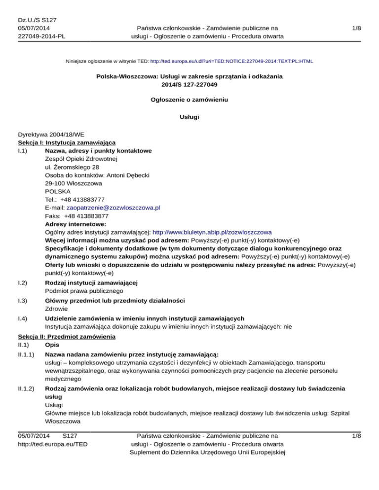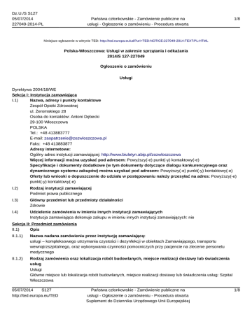 Dz.U./S S127 05/07/2014 227049-2014-PL Państwa członkowskie - Zamówienie publiczne na usługi - Ogłoszenie o zamówieniu - Procedura otwarta 1/8 Niniejsze ogłoszenie w witrynie TED: http://ted.europa.eu/udl?uri=TED:NOTICE:227049-2014:TEXT:PL:HTML Polska-Włoszczowa: Usługi w zakresie sprzątania i odkażania 2014/S 127-227049 Ogłoszenie o zamówieniu Usługi Dyrektywa 2004/18/WE Sekcja I: Instytucja zamawiająca I.1) Nazwa, adresy i punkty kontaktowe Zespół Opieki Zdrowotnej ul. Żeromskiego 28 Osoba do kontaktów: Antoni Dębecki 29-100 Włoszczowa POLSKA Tel.: +48 413883777 E-mail: [email protected] Faks: +48 413883877 Adresy internetowe: Ogólny adres instytucji zamawiającej: http://www.biuletyn.abip.pl/zozwloszczowa Więcej informacji można uzyskać pod adresem: Powyższy(-e) punkt(-y) kontaktowy(-e) Specyfikacje i dokumenty dodatkowe (w tym dokumenty dotyczące dialogu konkurencyjnego oraz dynamicznego systemu zakupów) można uzyskać pod adresem: Powyższy(-e) punkt(-y) kontaktowy(-e) Oferty lub wnioski o dopuszczenie do udziału w postępowaniu należy przesyłać na adres: Powyższy(-e) punkt(-y) kontaktowy(-e) I.2) Rodzaj instytucji zamawiającej Podmiot prawa publicznego I.3) Główny przedmiot lub przedmioty działalności Zdrowie I.4) Udzielenie zamówienia w imieniu innych instytucji zamawiających Instytucja zamawiająca dokonuje zakupu w imieniu innych instytucji zamawiających: nie Sekcja II: Przedmiot zamówienia II.1) Opis II.1.1) Nazwa nadana zamówieniu przez instytucję zamawiającą: usługi – kompleksowego utrzymania czystości i dezynfekcji w obiektach Zamawiającego, transportu wewnątrzszpitalnego, oraz wykonywania czynności pomocniczych przy pacjencie na zlecenie personelu medycznego II.1.2) Rodzaj zamówienia oraz lokalizacja robót budowlanych, miejsce realizacji dostawy lub świadczenia usług Usługi Główne miejsce lub lokalizacja robót budowlanych, miejsce realizacji dostawy lub świadczenia usług: Szpital Włoszczowa 05/07/2014 S127 http://ted.europa.eu/TED Państwa członkowskie - Zamówienie publiczne na usługi - Ogłoszenie o zamówieniu - Procedura otwarta Suplement do Dziennika Urzędowego Unii Europejskiej 1/8 Dz.U./S S127 05/07/2014 227049-2014-PL Państwa członkowskie - Zamówienie publiczne na usługi - Ogłoszenie o zamówieniu - Procedura otwarta 2/8 Kod NUTS PL331 II.1.3) Informacje na temat zamówienia publicznego, umowy ramowej lub dynamicznego systemu zakupów (DSZ) Ogłoszenie dotyczy zamówienia publicznego II.1.4) Informacje na temat umowy ramowej II.1.5) Krótki opis zamówienia lub zakupu Usługi w zakresie kompleksowego utrzymania czystości i dezynfekcji w obiektach Zamawiającego Usługi w zakresie transportu wewnątrzszpitalnego oraz wykonywWymagania ogólne stawiane wykonawcom w zakresie sprzątania i dezynfekcji Dobór środków dezynfekcyjnych stosowanych przez firmę powinien być uzgodniony ze Szpitalem. Dopuszczone są wszystkie preparaty antyseptyczne posiadające świadectwo rejestracji preparatów dezynfekcyjnych przeznaczonych do stosowania w zakładach opieki zdrowotnej zgodnie z Obwieszczeniem Ministra Zdrowia z dnia 20 grudnia 2007 roku w sprawie wykazu substancji czynnych dozwolonych do stosowania w produktach biobójczych (MP Nr 100 poz. 1091 ) i ustawą o produktach biobójczych ( tekst jednolity Dz. U. z 2007 r Nr 39 poz. 252 ) Wykonawca zobowiązany jest do przedstawienia pełnej liczby środków myjąco – czyszczących, które będą stosowane podczas wykonywania usług w zakresie sprzątania wraz z deklaracją CE i kartą charakterystyki. Wykonawca zobowiązany jest do codziennego sporządzania roztworów środków dezynfekcyjnych do dezynfekcji basenów i powierzchni. Pracownicy ( personel) Wykonawcy zobowiązani są do posiadania: - orzeczenia lekarskiego wydanego przez lekarza Medycyny Pracy o przydatności do pracy jako salowa w zakładach opieki zdrowotnej, - orzeczenia lekarskiego do celów sanitarno- epidemiologicznych. Pracownicy (personel) Wykonawcy są zobowiązani do używania odzieży ochronnej i środków ochrony osobistej, dbać o swój wygląd zachować zwyczajowo przyjęte zasady kultury podczas wykonywania pracy w szpitalu. Wszystkie osoby zatrudnione przez Wykonawcę przy wykonywaniu sprzątania w szpitalu (personel) obowiązuje dokładna znajomość przepisów w zakresie dezynfekcji szpitalnej i właściwego sposobu sprzątania pomieszczeń szpitalnych według opracowanych przez Wykonawcę procedur. Do zadań Wykonawcy należy : 1. Wyposażenie koszy w worki foliowe z atestem na odpady: a/ odpady komunalne worki koloru niebieskiego: – małe 90 opakowań po 100 szt./ miesiąc, – duże 1700 szt./ miesiąc, b/ odpady medyczne przeznaczone do utylizacji worki koloru czerwonego: pojemności 120 l - 900 szt. / miesiąc, pojemności 60 l - 70 opakowań po 100 szt./ miesiąc, oraz worki na bieliznę: a) bielizna brudna worki koloru czarnego około 1800 szt./ miesiąc, b) bielizna czysta worki koloru niebieskiego 800 szt. / miesiąc, 2. Zapewnienie pojemniki do dezynfekcji basenów. 3. Zapewnienie w węzłach sanitarnych : - papieru toaletowego około 900 szt/miesiąc, - ręczników jednorazowych w listkach około 1500 opakowań jednostkowych/miesiąc, - mydła w płynie około 90 l/miesiąc, - odświeżaczy powietrza. 05/07/2014 S127 http://ted.europa.eu/TED Państwa członkowskie - Zamówienie publiczne na usługi - Ogłoszenie o zamówieniu - Procedura otwarta Suplement do Dziennika Urzędowego Unii Europejskiej 2/8 Dz.U./S S127 05/07/2014 227049-2014-PL Państwa członkowskie - Zamówienie publiczne na usługi - Ogłoszenie o zamówieniu - Procedura otwarta 3/8 4. Systematyczne uzupełnianie ręczników jednorazowych, mydła w płynie oraz środków dezynfekcyjnych do rąk w gabinetach zabiegowych, punktach pielęgniarskich, pokojach lekarskich i socjalnych oraz kuchenkach oddziałowych, salach chorych, pomieszczeniach bloku operacyjnego i brudownikach: - ręczniki jednor
