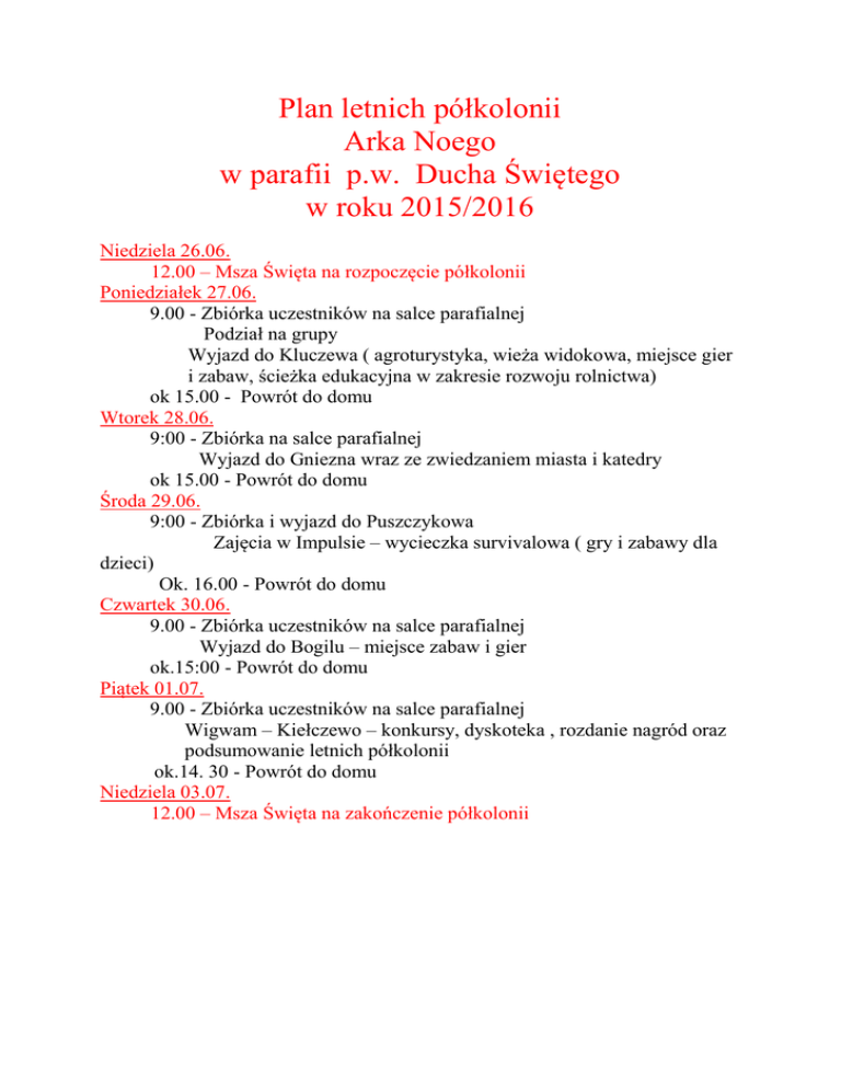 Plan letnich półkolonii Arka Noego w parafii p.w. Ducha Świętego w roku 2015/2016 Niedziela 26.06. 12.00 – Msza Święta na rozpoczęcie półkolonii Poniedziałek 27.06. 9.00 - Zbiórka uczestników na salce parafialnej Podział na grupy Wyjazd do Kluczewa ( agroturystyka, wieża widokowa, miejsce gier i zabaw, ścieżka edukacyjna w zakresie rozwoju rolnictwa) ok 15.00 - Powrót do domu Wtorek 28.06. 9:00 - Zbiórka na salce parafialnej Wyjazd do Gniezna wraz ze zwiedzaniem miasta i katedry ok 15.00 - Powrót do domu Środa 29.06. 9:00 - Zbiórka i wyjazd do Puszczykowa Zajęcia w Impulsie – wycieczka survivalowa ( gry i zabawy dla dzieci) Ok. 16.00 - Powrót do domu Czwartek 30.06. 9.00 - Zbiórka uczestników na salce parafialnej Wyjazd do Bogilu – miejsce zabaw i gier ok.15:00 - Powrót do domu Piątek 01.07. 9.00 - Zbiórka uczestników na salce parafialnej Wigwam – Kiełczewo – konkursy, dyskoteka , rozdanie nagród oraz podsumowanie letnich półkolonii ok.14. 30 - Powrót do domu Niedziela 03.07. 12.00 – Msza Święta na zakończenie półkolonii
