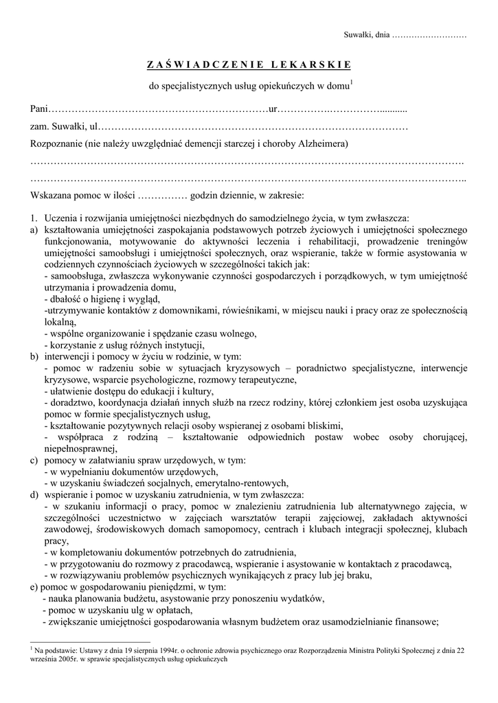 Suwałki, dnia ……………………… ZAŚWIADCZENIE LEKARSKIE do specjalistycznych usług opiekuńczych w domu1 Pani…………………………………………………………ur…………….……………........... zam. Suwałki, ul………………………………………………………………………………… Rozpoznanie (nie należy uwzględniać demencji starczej i choroby Alzheimera) …………………………………………………………………………………………………………………. ………………………………………………………………………………………………………………….. Wskazana pomoc w ilości …………… godzin dziennie, w zakresie: 1. Uczenia i rozwijania umiejętności niezbędnych do samodzielnego życia, w tym zwłaszcza: a) kształtowania umiejętności zaspokajania podstawowych potrzeb życiowych i umiejętności społecznego funkcjonowania, motywowanie do aktywności leczenia i rehabilitacji, prowadzenie treningów umiejętności samoobsługi i umiejętności społecznych, oraz wspieranie, także w formie asystowania w codziennych czynnościach życiowych w szczególności takich jak: - samoobsługa, zwłaszcza wykonywanie czynności gospodarczych i porządkowych, w tym umiejętność utrzymania i prowadzenia domu, - dbałość o higienę i wygląd, -utrzymywanie kontaktów z domownikami, rówieśnikami, w miejscu nauki i pracy oraz ze społecznością lokalną, - wspólne organizowanie i spędzanie czasu wolnego, - korzystanie z usług różnych instytucji, b) interwencji i pomocy w życiu w rodzinie, w tym: - pomoc w radzeniu sobie w sytuacjach kryzysowych – poradnictwo specjalistyczne, interwencje kryzysowe, wsparcie psychologiczne, rozmowy terapeutyczne, - ułatwienie dostępu do edukacji i kultury, - doradztwo, koordynacja działań innych służb na rzecz rodziny, której członkiem jest osoba uzyskująca pomoc w formie specjalistycznych usług, - kształtowanie pozytywnych relacji osoby wspieranej z osobami bliskimi, - współpraca z rodziną – kształtowanie odpowiednich postaw wobec osoby chorującej, niepełnosprawnej, c) pomocy w załatwianiu spraw urzędowych, w tym: - w wypełnianiu dokumentów urzędowych, - w uzyskaniu świadczeń socjalnych, emerytalno-rentowych, d) wspieranie i pomoc w uzyskaniu zatrudnienia, w tym zwłaszcza: - w szukaniu informacji o pracy, pomoc w znalezieniu zatrudnienia lub alternatywnego zajęcia, w szczególności uczestnictwo w zajęciach warsztatów terapii zajęciowej, zakładach aktywności zawodowej, środowiskowych domach samopomocy, centrach i klubach integracji społecznej, klubach pracy, - w kompletowaniu dokumentów potrzebnych do zatrudnienia, - w przygotowaniu do rozmowy z pracodawcą, wspieranie i asystowanie w kontaktach z pracodawcą, - w rozwiązywaniu problemów psychicznych wynikających z pracy lub jej braku, e) pomoc w gospodarowaniu pieniędzmi, w tym: - nauka planowania budżetu, asystowanie przy ponoszeniu wydatków, - pomoc w uzyskaniu ulg w opłatach, - zwiększanie umiejętności gospodarowania własnym budżetem oraz usamodzielnianie finansowe; 1 Na podstawie: Ustawy z dnia 19 sierpnia 1994r. o ochronie zdrowia psychicznego oraz Rozporządzenia Ministra Polityki Społecznej z dnia 22 września 2005r. w sprawie specjalistycznych usług opiekuńczych 2. a) b) c) d) e) f) 3. a) b) 4. a) b) c) 5. 6. Pielęgnacja - jako wspieranie procesu leczenia, w tym: pomoc w dostępie do świadczeń zdrowotnych, uzgadnianie i pilnowanie terminów wizyt lekarskich, badań diagnostycznych, pomoc w wykupywaniu lub zamawianiu leków w aptece, pilnowanie przyjmowania leków oraz obserwowanie ewentualnych skutków ubocznych ich stosowania, w szczególnie uzasadnionych przypadkach zmiana opatrunków, pomoc w użyciu środków pomocniczych i materiałów medycznych, przedmiotów ortopedycznych, a także w utrzymaniu higieny, pomoc w dotarciu do placówek służby zdrowia i/lub rehabilitacyjnych Rehabilitacji fizycznej i usprawnianie zaburzonych funkcji organizmu w zakresie nieobjętym przepisami ustawy z dnia 27 sierpnia 2004r. o świadczeniach opieki zdrowotnej finansowanych ze środków publicznych: w zakresie rehabilitacji ruchowej i fizjoterapii .............................................................. ................................................................................................................................................. aktywizacji w zakresie psychologiczno – pedagogicznym, edukacyjno-terapeutycznym poprzez współpracę z ................................................................................................................................................. ................................................................................................................................................. Pomocy mieszkaniowej, w tym: w uzyskaniu mieszkania, negocjowaniu i wnoszeniu opłat, w organizacji drobnych remontów, adaptacji, napraw, likwidacji barier architektonicznych, kształtowanie właściwych relacji osoby uzyskującej pomoc z sąsiadami i gospodarzem domu; Zapewnienia dostępu do zajęć rehabilitacyjnych i rewalidacyjno – wychowawczych (dotyczy dzieci i młodzieży z zaburzeniami psychicznymi), jeżeli nie mają możliwości uzyskania dostępu do zajęć, o których mowa w art. 7 ustawy z dnia 19 sierpnia 1994 r. o ochronie zdrowia psychicznego. Inne (jakie………………………………………………………………………………………… ..………………………………………………………………………………………………… ……………………………. /podpis i pieczęć lekarza/