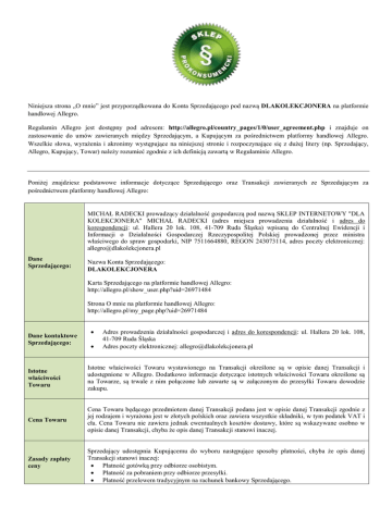 Niniejsza strona „O mnie” jest przyporządkowana do Konta Sprzedającego pod nazwą DLAKOLEKCJONERA na platformie handlowej Allegro. Regulamin Allegro jest dostępny pod adresem: http://allegro.pl/country_pages/1/0/user_agreement.php i znajduje on zastosowanie do umów zawieranych między Sprzedającym, a Kupującym za pośrednictwem platformy handlowej Allegro. Wszelkie słowa, wyrażenia i akronimy występujące na niniejszej stronie i rozpoczynające się z dużej litery (np. Sprzedający, Allegro, Kupujący, Towar) należy rozumieć zgodnie z ich definicją zawartą w Regulaminie Allegro. Poniżej znajdziesz podstawowe informacje dotyczące Sprzedającego oraz Transakcji zawieranych ze Sprzedającym za pośrednictwem platformy handlowej Allegro: MICHAŁ RADECKI prowadzący działalność gospodarczą pod nazwą SKLEP INTERNETOWY "DLA KOLEKCJONERA" MICHAŁ RADECKI (adres miejsca prowadzenia działalność i adres do korespondencji: ul. Hallera 20 lok. 108, 41-709 Ruda Śląska) wpisaną do Centralnej Ewidencji i Informacji o Działalności Gospodarczej Rzeczypospolitej Polskiej prowadzonej przez ministra właściwego do spraw gospodarki, NIP 7511664880, REGON 243073114, adres poczty elektronicznej: [email protected] Dane Sprzedającego: Nazwa Konta Sprzedającego: DLAKOLEKCJONERA Karta Sprzedającego na platformie handlowej Allegro: http://allegro.pl/show_user.php?uid=26971484 Strona O mnie na platformie handlowej Allegro: http://allegro.pl/my_page.php?uid=26971484 Dane kontaktowe Sprzedającego: Adres prowadzenia działalności gospodarczej i adres do korespondencji: ul. Hallera 20 lok. 108, 41-709 Ruda Śląska Adres poczty elektronicznej: [email protected] Istotne właściwości Towaru Istotne właściwości Towaru wystawionego na Transakcji określone są w opisie danej Transakcji i udostępnione w Allegro. Dodatkowo informacje dotyczące istotnych właściwości Towaru określone są na Towarze, są trwale z nim połączone lub zawarte są w załączonym do przesyłki Towaru dowodzie zakupu. Cena Towaru Cena Towaru będącego przedmiotem danej Transakcji podana jest w opisie danej Transakcji zgodnie z jej rodzajem i wyrażona jest w złotych polskich oraz zawiera wszystkie składniki, w tym podatek VAT i cła. Cena Towaru nie zawiera jednak ewentualnych kosztów dostawy, które są wskazywane osobno w opisie danej Transakcji, chyba że opis danej Transakcji stanowi inaczej. Zasady zapłaty ceny Sprzedający udostępnia Kupującemu do wyboru następujące sposoby płatności, chyba że opis danej Transakcji stanowi inaczej: Płatność gotówką przy odbiorze osobistym. Płatność za pobraniem przy odbiorze przesyłki. Płatność przelewem tradycyjnym na rachunek bankowy Sprzedającego. Płatności elektroniczne za pośrednictwem serwisu PayU.pl Informacje dot. rachunku bankowego Sprzedającego: Bank: ALIOR BANK SA Numer rachunku: 27249000050000453095978865. Dostępne metody płatności elektronicznych poprzez http://www.payu.pl/dla-sklepow/szeroki-wachlarz-uslug PayU.pl wskazane są na stronie Kupujący jest obowiązany do zapłaty ceny za Towar zgodnie z wybranym sposobem płatności. W wypadku wyboru sposobu płatności innego niż za pobraniem, Kupujący obowiązany jest dokonać płatności w terminie 7 dni od dnia zawarcia umowy sprzedaży zgodnie z Regulaminem Allegro, chyba że opis danej Transakcji stanowi inaczej. W przypadku płatności przelewem tradycyjnym na rachunek bankowy Sprzedającego zalecamy podawanie w tytule przelewu nazwy Konta oraz nazwiska Użytkownika w platformie handlowej Allegro oraz numeru Transakcji – ułatwi to nam i przyspieszy księgowanie płatności. W wypadku Kupujących nie będących jednocześnie konsumentami Sprzedający ma prawo ograniczyć dostępne sposoby płatności, w tym także wymagać dokonania przedpłaty w całości albo części. Koszt dostawy: koszt dostawy Towaru jest wskazany w opisie danej Transakcji. Koszt oraz termin i sposób dostawy Termin dostawy: Termin dostawy Towaru do Kupującego wynosi do 14 dni roboczych (od poniedziałku do piątku z wyłączeniem dni ustawowo wolnych od pracy), chyba że w opisie danej Transakcji podano krótszy termin. Termin ten należy liczyć w następujący sposób: W przypadku wyboru przez Kupującego sposobu płatności przelewem lub płatności elektroniczne od dnia uznania rachunku bankowego lub konta rozliczeniowego Sprzedającego. W przypadku wyboru przez Kupującego sposobu płatności za pobraniem – od dnia zawarcia umowy sprzedaży. Dostępne sposoby dostawy, chyba że opis danej Transakcji stanowi inaczej: Przesyłka pocztowa; przesyłka pocztowa za pobraniem; Przesyłka kurierska; przesyłka kurierska za pobraniem; Odbiór osobisty pod adresem: ul. Hallera 20 lok. 108, 41-709 Ruda Śląska, od poniedziałku do niedzieli, w godzinach 10:00-18:00 – po uprzednim ustaleniu terminu odbioru. Dostawa Towaru dostępna jest na terytorium Rzeczypospolitej Polskiej. Kupujący będący jednocześnie konsumentem, który zawarł umowę na odległość, może od niej odstąpić bez podania przyczyn, składając stosowne oświadczenie na piśmie w terminie dziesięciu dni. Do zachowania tego terminu wystarczy wysłanie oświadczenia przed jego upływem. Oświadczenie można wysłać na następujący adres Sprzedającego: ul. Hallera 20 lok. 108, 41-709 Ruda Śląska Prawo odstąpienia od umowy w terminie 10 dni, ze wskazaniem wyjątków Zasady dotyczące odstąpienia: 1. W razie odstąpienia od umowy umowa jest uważana za niezawartą, a Kupujący jest zwolniony z wszelkich zobowiązań. To, co strony świadczyły, ulega zwrotowi w stanie niezmienionym, chyba że zmiana była konieczna w granicach zwykłego zarządu. Zwrot powinien nastąpić niezwłocznie, nie później niż w terminie czternastu dni. Jeżeli konsument dokonał jakichkolwiek przedpłat, należą się od nich odsetki ustawowe od daty dokonania przedpłaty. 2. Sprzedający dokona zwrotu na wskazany przez Kupującego 