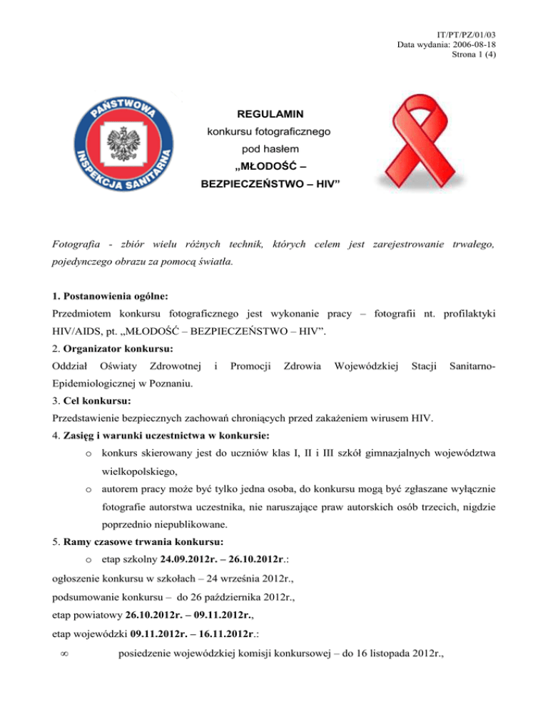IT/PT/PZ/01/03 Data wydania: 2006-08-18 Strona 1 (4) REGULAMIN konkursu fotograficznego pod hasłem „MŁODOŚĆ – BEZPIECZEŃSTWO – HIV” Fotografia - zbiór wielu róŜnych technik, których celem jest zarejestrowanie trwałego, pojedynczego obrazu za pomocą światła. 1. Postanowienia ogólne: Przedmiotem konkursu fotograficznego jest wykonanie pracy – fotografii nt. profilaktyki HIV/AIDS, pt. „MŁODOŚĆ – BEZPIECZEŃSTWO – HIV”. 2. Organizator konkursu: Oddział Oświaty Zdrowotnej i Promocji Zdrowia Wojewódzkiej Stacji Sanitarno- Epidemiologicznej w Poznaniu. 3. Cel konkursu: Przedstawienie bezpiecznych zachowań chroniących przed zakaŜeniem wirusem HIV. 4. Zasięg i warunki uczestnictwa w konkursie: o konkurs skierowany jest do uczniów klas I, II i III szkół gimnazjalnych województwa wielkopolskiego, o autorem pracy moŜe być tylko jedna osoba, do konkursu mogą być zgłaszane wyłącznie fotografie autorstwa uczestnika, nie naruszające praw autorskich osób trzecich, nigdzie poprzednio niepublikowane. 5. Ramy czasowe trwania konkursu: o etap szkolny 24.09.2012r. – 26.10.2012r.: ogłoszenie konkursu w szkołach – 24 września 2012r., podsumowanie konkursu – do 26 października 2012r., etap powiatowy 26.10.2012r. – 09.11.2012r., etap wojewódzki 09.11.2012r. – 16.11.2012r.: • posiedzenie wojewódzkiej komisji konkursowej – do 16 listopada 2012r., IT/PT/PZ/01/03 Data wydania: 2006-08-18 Strona 2 (4) • ogłoszenie wyników na stronie internetowej WSSE w Poznaniu, • wręczenie nagród laureatom konkursu. 6. Zakres tematyczny: Konkurs skierowany jest do młodzieŜy klas I, II i III szkół gimnazjalnych. Zadanie konkursowe polega na wykonaniu przez młodzieŜ tematycznej fotografii. Autorzy fotografii mają przedstawić bezpieczne zachowania chroniące przez zakaŜeniem HIV. Prace konkursowe nie mogą wzbudzać agresji i nietolerancji. 7. Zasady przeprowadzenia konkursu: zadania dla uczestników konkursu: • wykonanie fotografii barwnej lub czarno-białej o wymiarze 10 x 15 (wywołanej oraz nagranej na płycie CD) odzwierciedlającej hasło konkursowe, • uczestnik moŜe zgłosić tylko jedno zdjęcie. o liczba etapów konkursu - konkurs składa się z trzech etapów: • szkolnego, • powiatowego, • wojewódzkiego. osoby odpowiedzialne /zespoły organizacyjne/ za przeprowadzenie o poszczególnych etapów: • etap szkolny: szkolny koordynatorzy wychowania zdrowotnego, nauczyciele, wychowawcy klas, przedstawiciele medycyny szkolnej, • etap powiatowy: pracownicy oświaty zdrowotnej i promocji zdrowia powiatowych stacji sanitarno-epidemiologicznych województwa wielkopolskiego, • etap wojewódzki: pracownicy Oddziału Oświaty Zdrowotnej i Promocji Zdrowia Wojewódzkiej Stacji Sanitarno-Epidemiologicznej w Poznaniu. o liczba uczestników przechodzących do dalszych etapów konkursu: • z etapu szkolnego do etapu powiatowego: laureaci I miejsca z poszczególnych szkół, • z etapu powiatowego do etapu wojewódzkiego: laureaci I miejsca z powiatów. o sposób zgłaszania uczestników: • uczestnicy ze szkół wielkopolskiego rekrutują się samodzielnie. gimnazjalnych województwa IT/PT/PZ/01/03 Data wydania: 2006-08-18 Strona 3 (4) sposób opisania prac konkursowych: • dołączyć kopertę, w której naleŜy umieścić dokładne i czytelne dane autora: imię i nazwisko, adres szkoły, numer telefonu szkoły, załącznik F/IT/PT/PZ/01/03/02 - zgodę opiekunów na udział dziecka w konkursie oraz zgodę na publikacje wizerunku osób znajdujących się na zdjęciu (zgoda osoby dorosłej). prace naleŜy przesłać: • etap powiatowy – właściwa powiatowa stacja sanitarno- epidemiologiczna, • etap wojewódzki – Wojewódzka Stacja Sanitarno- Epidemiologiczna w Poznaniu, Oddział Oświaty Zdrowotnej i Promocji Zdrowia, os. Przyjaźni 118, 61-680 Poznań. 8. Zasady oceny oraz skład komisji konkursowej: oceniane będą tylko indywidualne, własnoręcznie wykonane fotografie, sposób oceny: • zgodność z regulaminem, • poprawność merytoryczna, • pomysłowość, • czytelność przekazu, skład komisji konkursowej: • etap szkolny: dyrektor szkoły, nauczyciel sztuki, przedstawiciel medycyny szkolnej, • etap powiatowy: pracownik ds. oświaty zdrowotnej i promocji zdrowia powiatowej stacji sanitarno-epidemiologicznej, nauczyciel sztuki, pracownik słuŜby zdrowia, przedstawiciel starostwa powiatowego, urzędu miast i gmin, • etap wojewódzki: pracownik Oddziału Oświaty Zdrowotnej i Promocji Zdrowia Wojewódzkiej Stacji Sanitarno-Epidemiologicznej w Poznaniu, przedstawiciel władz rządowych/samorządowych, przedstawiciel Kuratorium Oświaty w Poznaniu, plastyk, pracownik słuŜby zdrowia. 9. Zasady nagradzania: o fundatorzy nagród: • etap IT/PT/PZ/01/03 Data wydania: 2006-08-18 Strona 4 (4) powiatowy: powiatowe stacje sanitarno – epidemiologiczne województwa wielkopolskiego, starostwa powiatowe, urzędy miast i gmin, partnerzy, • etap wojewódzki: Wojewódzka Stacja Sanitarno – Epidemiologiczna w Poznaniu, Urząd Marszałkowski Województwa Wielkopolskiego, Wielkopolski Urząd Wojewódzki, partnerzy. liczba laureatów: • etap szkolny – I, II, III miejsce, • etap powiatowy – I, II, III miejsce, • etap wojewódzki – I, II, III miejsce i trzy wyróŜnienia. o rodzaj nagród - nagrody rzeczowe. 10. Organizatorzy zastrzegają sobie prawo: o innego podziału nagród i wyróŜnień, o wykorzystania prac konkursowych w działaniach informacyjno-edukacyjnych, opublikowania ich w całości lub we fragmentach w wydawnictwach okolicznościowych, materiałach prasowych, internecie lub w inny sposób. IT/PT/PZ/01/03 Data wydania: 2006-08-18 Strona 5 (4) M.S.K./H.W.