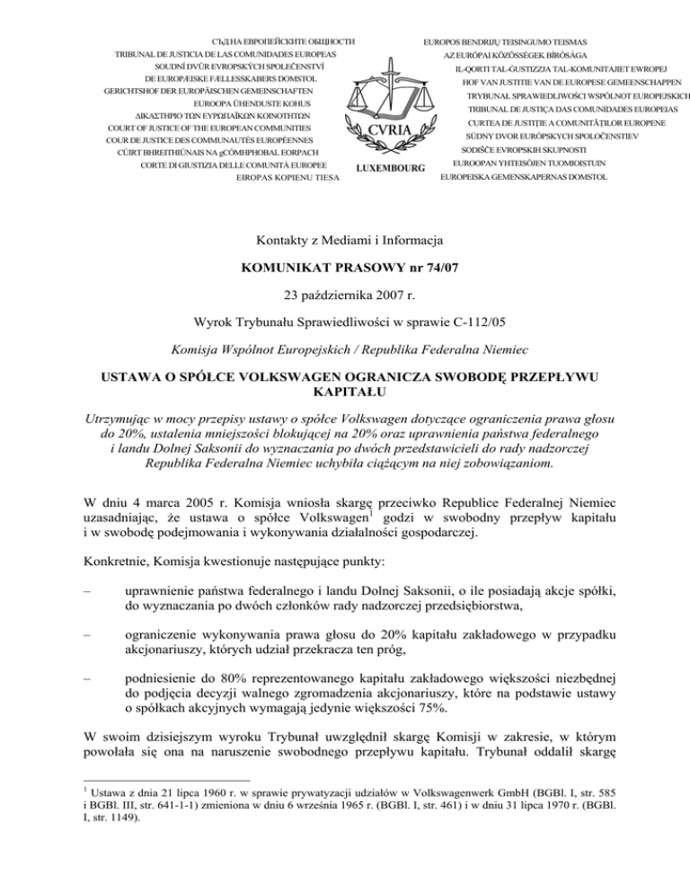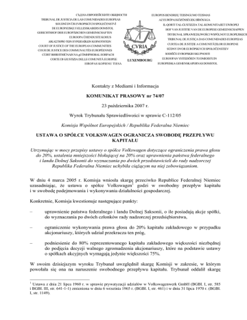 СЪД НА ЕВРОПЕЙСКИТЕ ОБЩНОСТИ EUROPOS BENDRIJŲ TEISINGUMO TEISMAS TRIBUNAL DE JUSTICIA DE LAS COMUNIDADES EUROPEAS AZ EURÓPAI KÖZÖSSÉGEK BÍRÓSÁGA SOUDNÍ DVŮR EVROPSKÝCH SPOLEČENSTVÍ IL-QORTI TAL-ĠUSTIZZJA TAL-KOMUNITAJIET EWROPEJ DE EUROPÆISKE FÆLLESSKABERS DOMSTOL HOF VAN JUSTITIE VAN DE EUROPESE GEMEENSCHAPPEN GERICHTSHOF DER EUROPÄISCHEN GEMEINSCHAFTEN TRYBUNAŁ SPRAWIEDLIWOŚCI WSPÓLNOT EUROPEJSKICH EUROOPA ÜHENDUSTE KOHUS TRIBUNAL DE JUSTIÇA DAS COMUNIDADES EUROPEIAS ∆ΙΚΑΣΤΗΡΙΟ ΤΩΝ ΕΥΡΩΠΑΪΚΩΝ ΚΟΙΝΟΤΗΤΩΝ CURTEA DE JUSTIŢIE A COMUNITĂŢILOR EUROPENE COURT OF JUSTICE OF THE EUROPEAN COMMUNITIES SÚDNY DVOR EURÓPSKYCH SPOLOČENSTIEV COUR DE JUSTICE DES COMMUNAUTÉS EUROPÉENNES SODIŠČE EVROPSKIH SKUPNOSTI CÚIRT BHREITHIÚNAIS NA gCÓMHPHOBAL EORPACH EUROOPAN YHTEISÖJEN TUOMIOISTUIN CORTE DI GIUSTIZIA DELLE COMUNITÀ EUROPEE EIROPAS KOPIENU TIESA EUROPEISKA GEMENSKAPERNAS DOMSTOL Kontakty z Mediami i Informacja KOMUNIKAT PRASOWY nr 74/07 23 października 2007 r. Wyrok Trybunału Sprawiedliwości w sprawie C-112/05 Komisja Wspólnot Europejskich / Republika Federalna Niemiec USTAWA O SPÓŁCE VOLKSWAGEN OGRANICZA SWOBODĘ PRZEPŁYWU KAPITAŁU Utrzymując w mocy przepisy ustawy o spółce Volkswagen dotyczące ograniczenia prawa głosu do 20%, ustalenia mniejszości blokującej na 20% oraz uprawnienia państwa federalnego i landu Dolnej Saksonii do wyznaczania po dwóch przedstawicieli do rady nadzorczej Republika Federalna Niemiec uchybiła ciążącym na niej zobowiązaniom. W dniu 4 marca 2005 r. Komisja wniosła skargę przeciwko Republice Federalnej Niemiec uzasadniając, że ustawa o spółce Volkswagen1 godzi w swobodny przepływ kapitału i w swobodę podejmowania i wykonywania działalności gospodarczej. Konkretnie, Komisja kwestionuje następujące punkty: – uprawnienie państwa federalnego i landu Dolnej Saksonii, o ile posiadają akcje spółki, do wyznaczania po dwóch członków rady nadzorczej przedsiębiorstwa, – ograniczenie wykonywania prawa głosu do 20% kapitału zakładowego w przypadku akcjonariuszy, których udział przekracza ten próg, – podniesienie do 80% reprezentowanego kapitału zakładowego większości niezbędnej do podjęcia decyzji walnego zgromadzenia akcjonariuszy, które na podstawie ustawy o spółkach akcyjnych wymagają jedynie większości 75%. W swoim dzisiejszym wyroku Trybunał uwzględnił skargę Komisji w zakresie, w którym powołała się ona na naruszenie swobodnego przepływu kapitału. Trybunał oddalił skargę 1 Ustawa z dnia 21 lipca 1960 r. w sprawie prywatyzacji udziałów w Volkswagenwerk GmbH (BGBl. I, str. 585 i BGBl. III, str. 641-1-1) zmieniona w dniu 6 września 1965 r. (BGBl. I, str. 461) i w dniu 31 lipca 1970 r. (BGBl. I, str. 1149). w odniesieniu do zarzucanego przez Komisję naruszenia swobody podejmowania i wykonywania działalności gospodarczej, ze względu na brak szczególnej argumentacji Komisji w tym zakresie. Ograniczenia swobody przepływu kapitału Trybunał podniósł, że ustawa dotycząca spółki Volkswagen, jako wyraz ustawodawczych kompetencji państwa, stanowi przepis krajowy. Za sporne regulacje tej ustawy odpowiedzialne jest państwo, ponieważ tylko ono, jak ustawodawca, jest w stanie je zmienić. Trybunał przypomniał, że traktat WE zakazuje wszelkich ograniczeń swobodnego przepływu kapitału między państwami członkowskimi. Takim ograniczeniem jest przepis krajowy, który może zniechęcać do inwestycji bezpośrednich przez ograniczanie akcjonariuszom możliwości udziału w spółce celem ustanowienia lub utrzymania trwałych i bezpośrednich powiązań gospodarczych ze spółką, umożliwiających efektywny udział w zarządzaniu nią lub w sprawowaniu nad nią kontroli. Trybunał stwierdził, że omawiane przepisy mogą mieć tego rodzaju zniechęcający skutek. Ograniczenie prawa głosu do 20% i ustalenie mniejszości blokującej na 20% Trybunał nie wykluczył, że oba te przepisy, rozpatrywane odrębnie, mogą równie dobrze działać na korzyść, jak i na niekorzyść wszystkich akcjonariuszy spółki. Jednakże Trybunał przypomniał, że w chwili uchwalania ustawy o spółce Volkswagen państwo federalne i land Dolnej Saksonii byli głównymi akcjonariuszami nowosprywatyzowanej spółki, w której posiadali po 20% kapitału, oraz że land Dolnej Saksonii w dalszym ciągu zachowuje udział w takiej wysokości. Trybunał stwierdził, że omawiane przepisy rozpatrywane łącznie umożliwiają państwu federalnemu i landowi Dolnej Saksonii wywieranie na spółkę Volkswagen istotnego wpływu w oparciu o mniejszy udział inwestycyjny niż wymagany przez prawo powszechne. Sytuacja ta może zniechęcać inwestorów bezpośrednich z innych państw członkowskich. Prawo do wyznaczania dwóch przedstawicieli do rady nadzorczej Przysługująca państwu federalnemu i landowi Dolnej Saksonii – o ile są akcjonariuszami spółki – możliwość wyznaczania po dwóch przedstawicieli do rady nadzorczej uprzywilejowuje owych akcjonariuszy publicznych na tle przepisów powszechnego prawa spółek, na mocy którego mieliby oni prawo do nie więcej niż trzech przedstawicieli. Co więcej, uprawnienie to przysługuje im, jeśli posiadają akcje spółki, niezależnie od wielkości ich udziału w kapitale. Państwo federalne i land Dolnej Saksonii mają więc możliwość wywierania na spółkę wpływu przekraczającego zakres ich inwestycji, a przez to zmniejszania wpływu innych akcjonariuszy poniżej zakresu ich inwestycji. Ograniczenia swobodnego przepływu kapitału nie są uzasadnione Trybunał przypomniał, że swobodny przepływ kapitału może być ograniczony na mocy przepisów krajowych służących uzasadnionym interesom. Niemniej jednak, Republika Federalna Niemiec w niniejszej sprawie nie wykazała – poza przytoczeniem ogólnych rozważań dotyczących konieczności ochrony przed akcjonariuszem 