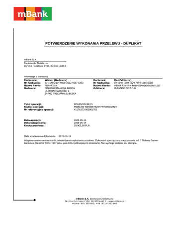 POTWIERDZENIE WYKONANIA PRZELEWU - DUPLIKAT mBank S.A. Bankowość Detaliczna Skrytka Pocztowa 2108, 90-959 Łódź 2 Informacje o transakcji Rachunek: Nr Rachunku: Nazwa Banku: Nadawca: Winien (Nadawca) 87 1140 2004 0000 3502 4157 6373 MBANK S.A. MAŁGORZATA ANNA BRODA UL.BRONIEWSKIEGO 6 64-980 TRZCIANKA LUBUSKA Rachunek: Nr Rachunku: Nazwa Banku: Odbiorca: Ma (Odbiorca) 69 1140 1690 1529 7854 1566 6000 mBank F. nr 8 w Łodzi O/Korporacyjny Łódź MLEASING SP Z O.O. Tytuł operacji: Rodzaj operacji: Nr referencyjny operacji: SFR/05/02248/15 PRZELEW WEWNĘTRZNY WYCHODZĄCY 41576373-000001792 Data operacji: Data księgowania: Kwota przelewu: 2015-05-14 2015-05-14 28 905,00 PLN Data wystawienia dokumentu: 2015-05-14 Wygenerowane elektronicznie potwierdzenie wykonania przelewu. Dokument sporządzony na podstawie art. 7 Ustawy Prawo Bankowe (Dz.U.Nr 140 z 1997 roku, poz.939 z późniejszymi zmianami). Nie wymaga podpisu ani stempla. mBank S.A. Bankowość Detaliczna Skrytka Pocztowa 2108, 90-959 Łódź 2 . www.mBank.pl mLinia: 801 300 800, +48 (42) 6 300 800