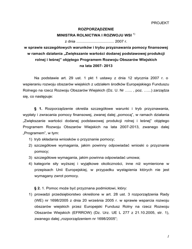 PROJEKT ROZPORZĄDZENIE MINISTRA ROLNICTWA I ROZWOJU WSI 1) z dnia ................................... 2007 r. w sprawie szczegóáowych warunków i trybu przyznawania pomocy finansowej w ramach dziaáania „ZwiĊkszanie wartoĞci dodanej podstawowej produkcji rolnej i leĞnej” objĊtego Programem Rozwoju Obszarów Wiejskich na lata 2007- 2013 Na podstawie art. 29 ust. 1 pkt 1 ustawy z dnia 12 stycznia 2007 r. o wspieraniu rozwoju obszarów wiejskich z udziaáem Ğrodków Europejskiego Funduszu Rolnego na rzecz Rozwoju Obszarów Wiejskich (Dz. U. Nr …... , poz. …...) zarządza siĊ, co nastĊpuje: § 1. Rozporządzenie okreĞla szczegóáowe warunki i tryb przyznawania, wypáaty i zwracania pomocy finansowej, zwanej dalej „pomocą”, w ramach dziaáania „ZwiĊkszanie wartoĞci dodanej podstawowej produkcji rolnej i leĞnej” objĊtego Programem Rozwoju Obszarów Wiejskich na lata 2007-2013, zwanego dalej „Programem”, w tym: 1) tryb skáadania wniosków o przyznanie pomocy; 2) szczegóáowe wymagania, jakim powinny odpowiadaü wnioski o przyznanie pomocy; 3) szczegóáowe wymagania, jakim powinna odpowiadaü umowa; 4) kategorie siáy wyĪszej i wyjątkowe okolicznoĞci, inne niĪ wymienione w przepisach Unii Europejskiej, w przypadku wystąpienia których nie jest wymagany zwrot pomocy. § 2. 1. Pomoc moĪe byü przyznana podmiotowi, który: 1) prowadzi przedsiĊbiorstwo okreĞlone w art. 28 ust. 3 rozporządzenia Rady (WE) nr 1698/2005 z dnia 20 wrzeĞnia 2005 r. w sprawie wsparcia rozwoju obszarów wiejskich przez Europejski Fundusz Rolny na rzecz Rozwoju Obszarów Wiejskich (EFRROW) (Dz. Urz. UE L 277 z 21.10.2005, str. 1), zwanego dalej „rozporządzeniem nr 1698/2005”; 1 2) wykonuje dziaáalnoĞü, o której mowa w art. 28 ust. 1 lit. b tiret pierwsze rozporządzenia nr 1698/2005, w zakresie okreĞlonym w zaáączniku nr 1 do rozporządzenia; 3) nie podlega wykluczeniu z ubiegania siĊ o przyznanie pomocy; 4) zostaá wpisany do ewidencji producentów, stanowiącej czĊĞü krajowego systemu ewidencji producentów, ewidencji gospodarstw rolnych oraz ewidencji wniosków o przyznanie páatnoĞci. 2. WysokoĞü obrotu wyraĪona w euro dla przedsiĊbiorstw wymienionych w art. 28 ust. 3 rozporządzenia nr 1698/2005 przelicza siĊ na záote wedáug Ğredniego kursu ogáaszanego przez Narodowy Bank Polski w ostatnim dniu roku obrotowego wybranego do okreĞlania statusu przedsiĊbiorcy. § 3. 1. Pomoc moĪe byü przyznana na operacjĊ: 1) speániającą wymagania okreĞlone w Programie; 2) która nie jest finansowana z udziaáem innych Ğrodków publicznych; 3) obejmującą wyáącznie inwestycje związane z prowadzeniem dziaáalnoĞci, o której mowa w art. 28 ust. 1 lit. b tiret pierwsze rozporządzenia nr 1698/2005, w zakresie okreĞlonym w zaáączniku nr 1 do rozporządzenia; 4) obejmującą koszty mogące podlegaü refundacji; 5) dla której wniosek o páatnoĞü ostateczną zostanie záoĪony do 30 czerwca 2015 r. 2. Pomoc moĪe byü przyznana jeĪeli zostaáy speánione warunki okreĞlone w rozporządzeniu oraz innych przepisach, które mają zastosowanie do inwestycji objĊtych operacją. § 4. 1. Operacja objĊta pomocą jest realizowana w nie wiĊcej niĪ: 1) czterech etapach; 2) dwóch etapach – w przypadku operacji, w których kwota pomocy nie przekracza 10 mln záotych. 2. ZáoĪenie pierwszego wniosku o páatnoĞü lub, w przypadku operacji realizowanych w jednym etapie, wniosku o páatnoĞü ostateczną, nastĊpuje nie póĨniej niĪ w terminie 24 miesiĊcy od dnia zawarcia umowy. 2 3. ZakoĔczenie realizacji operacji i záoĪenie wniosku o páatnoĞü ostateczną w przypadku operacji realizowanych w kilku etapach nastĊpuje w terminie 36 miesiĊcy od dnia zawarcia umowy. 4. W ramach páatnoĞci ostatecznej moĪna ubiegaü siĊ o nie mniej niĪ 25% áącznej planowanej kwoty pomocy, z wyáączeniem nabycia rzeczy objĊtych operacją bĊdących przedmiotem leasingu. § 5. 1. Operacja obejmująca nabycie rzeczy bĊdących przedmiotem leasingu moĪe byü realizowana w nie wiĊcej niĪ 10 etapach. 2. W przypadku operacji, o której mowa w ust. 1: 1) wniosek o páatnoĞü moĪe byü skáadany nie czĊĞciej niĪ dwa razy w roku po zakoĔczeniu realizacji poszczególnych etapów; 2) zakoĔczenie realizacji operacji i záoĪenie wniosku o páatnoĞü ostateczną nastĊpuje w terminie 60 miesiĊcy od dnia zawarcia umowy. § 6. 1. Refundacji w ramach pomocy mogą podlegaü koszty, które: 1) są okreĞlone w zaáączniku nr 2 do rozporządzenia, 2) zostaáy poniesione: a) po dniu, w którym zostaá záoĪony wniosek o przyznanie pomocy, do dnia upáywu terminu realizacji operacji okreĞlonego w umowie, a w przypadku kosztów stanowiących koszty ogólne – zostaáy poniesione nie wczeĞniej niĪ 1 stycznia 2007 r., b) w formie rozliczenia bezgotówkowego przeprowadzonego poleceniem przelewu, poleceniem zapáaty lub czekiem rozrachunkowym - zwane dalej „kosztami kwalifikowalnymi”. 2. Refundacji podlega: 1) 40% kosztów kwalifikowalnych – w przypadku operacji realizowanej przez beneficjenta prowadzącego mikro, maáe lub Ğrednie przedsiĊbiorstwo; 2) 50% kosztów kwalifikowalnych – w przypadku operacji realizowanej przez beneficjenta prowadzącego mikro, maáe lub Ğrednie przedsiĊbiorstwo, który co najmniej 25% ogólnej iloĞci produktów rolnych, o których mowa w art. 28 ust. 1 lit. b tiret pierwsze rozporządzenia nr 1698/2005, nabywa na podstawie umów zawartych, na co najmniej rok, z grupami producentów rolnych lub wstĊpnie uznanymi, lub uznanymi organizacjami producentów owoców i warzyw; 3 3) 25% kosztów kwalifikowalnych – w przypadku operacji realizowanej przez beneficjenta, który nie jest mikro, maáym lub Ğrednim przedsiĊbiorcą. 4. Pomoc przyznana jednemu beneficjentowi w ramach dziaáania „ZwiĊkszanie wartoĞci dodanej podstawowej produkcji rolnej i leĞnej” w okresie realizacji Programu nie moĪe przekroczyü 20 mln záotych, 
