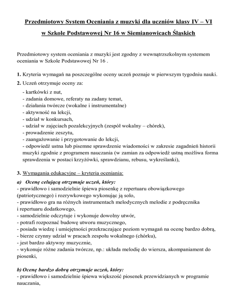Przedmiotowy System Oceniania z muzyki dla uczniów klasy IV – VI w Szkole Podstawowej Nr 16 w Siemianowicach Śląskich Przedmiotowy system oceniania z muzyki jest zgodny z wewnątrzszkolnym systemem oceniania w Szkole Podstawowej Nr 16 . 1. Kryteria wymagań na poszczególne oceny uczeń poznaje w pierwszym tygodniu nauki. 2. Uczeń otrzymuje oceny za: - kartkówki z nut, - zadania domowe, referaty na zadany temat, - działania twórcze (wokalne i instrumentalne) - aktywność na lekcji, - udział w konkursach, - udział w zajęciach pozalekcyjnych (zespół wokalny – chórek), - prowadzenie zeszytu, - zaangażowanie i przygotowanie do lekcji, - odpowiedź ustna lub pisemne sprawdzenie wiadomości w zakresie zagadnień historii muzyki zgodnie z programem nauczania (w zamian za odpowiedź ustną możliwa forma sprawdzenia w postaci krzyżówki, sprawdzianu, rebusu, wykreślanki), 3. Wymagania edukacyjne – kryteria oceniania: a) Ocenę celującą otrzymuje uczeń, który: - prawidłowo i samodzielnie śpiewa piosenkę z repertuaru obowiązkowego (patriotycznego) i rozrywkowego wykonując ją solo, - prawidłowo gra na różnych instrumentach melodycznych melodie z podręcznika i repertuaru dodatkowego, - samodzielnie odczytuje i wykonuje dowolny utwór, - potrafi rozpoznać budowę utworu muzycznego, - posiada wiedzę i umiejętności przekraczające poziom wymagań na ocenę bardzo dobrą, - bierze czynny udział w pracach zespołu wokalnego (chórku), - jest bardzo aktywny muzycznie, - wykonuje różne zadania twórcze, np.: układa melodię do wiersza, akompaniament do piosenki, b) Ocenę bardzo dobrą otrzymuje uczeń, który: - prawidłowo i samodzielnie śpiewa większość piosenek przewidzianych w programie nauczania, - prawidłowo i samodzielnie gra na instrumentach melodycznych większość melodii przewidzianych w programie nauczania, - umie bezbłędnie wykonywać rytmy, - rozumie zapis nutowy i potrafi się nim posługiwać, - zna podstawowe terminy muzyczne omawiane w danej klasie, - podaje nazwiska wybitnych kompozytorów z programu danej klasy, c) Ocenę dobrą otrzymuje uczeń, który: - poprawnie i z niewielką pomocą nauczyciela śpiewa pieśni obowiązkowe i piosenki rozrywkowe, - poprawnie i z niewielką pomocą nauczyciela gra kilka melodii oraz akompaniamentów do piosenek na używanym na lekcjach instrumencie melodycznym, - wykonuje proste rytmy, - zna podstawowe terminy muzyczne omawiane w danej klasie i wie, co one oznaczają, - prowadzi systematycznie i starannie zeszyt przedmiotowy, d) Ocenę dostateczną otrzymuje uczeń, który: - niezbyt poprawnie, z pomocą tekstu i z dużą pomocą nauczyciela śpiewa niektóre piosenki przewidziane w programie nauczania, - niezbyt poprawnie i z dużą pomocą nauczyciela gra na używanym na lekcjach instrumencie melodycznym niektóre melodie przewidziane w programie nauczania, - wykonuje najprostsze ćwiczenia rytmiczne, - zna tylko niektóre terminy muzyczne, - prowadzi zeszyt niesystematycznie i niestarannie, e) Ocenę dopuszczającą otrzymuje uczeń, który: - niedbale, nie starając się poprawić błędów śpiewa kilka najprostszych piosenek przewidzianych w programie nauczania, - niedbale, nie starając się poprawić błędów gra na instrumencie melodycznym gamę i kilka najprostszych utworów przewidzianych w programie nauczania, - niechętnie podejmuje działania muzyczne, - myli terminy muzyczne, - dysponuje tylko fragmentaryczną wiedzą, - najprostsze polecenia nauczyciela – ćwiczenia rytmiczne – wykonuje z pomocą nauczyciela, f) Ocenę niedostateczną otrzymuje uczeń: - tylko w sytuacjach wyjątkowych, np.: gdy, mimo usilnych starań nauczyciela, wykazuje negatywny stosunek do przedmiotu , - ma bardzo duże braki w zakresie podstawowych wymagań edukacyjnych dotyczących wiadomości i umiejętności przewidzianych dla danej klasy, - nie prowadzi zeszytu przedmiotowego, 4. Inne postanowienia: - ocena śródroczna i końcowo roczna nie jest średnią arytmetyczną ocen cząstkowych, - uczeń zobowiązany jest do prowadzenia zeszytu, który podlega ocenie przynajmniej raz w roku szkolnym, - w ciągu semestru uczeń może zgłosić dwa razy nieprzygotowanie, - uczeń otrzymuje minus (-) za brak zeszytu, książki, instrumentu czy innych materiałów potrzebnych na lekcji; za trzy minusy uczeń otrzymuje ocenę niedostateczną, mgr Aleksandra Stano