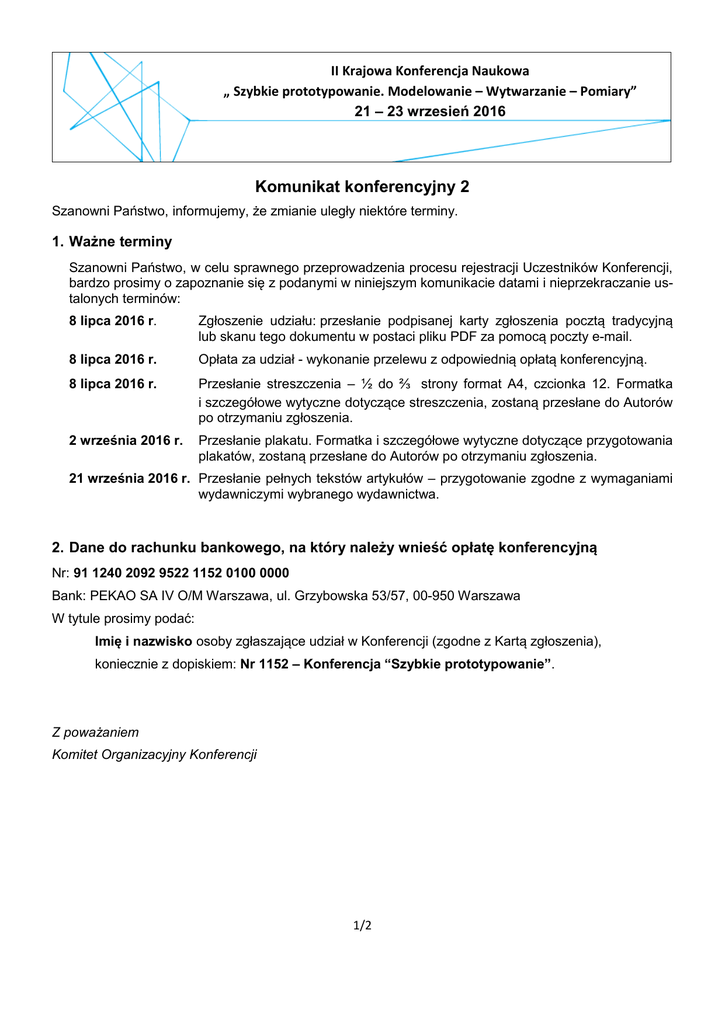 II Krajowa Konferencja Naukowa „ Szybkie prototypowanie. Modelowanie – Wytwarzanie – Pomiary” 21 – 23 wrzesień 2016 Komunikat konferencyjny 2 Szanowni Państwo, informujemy, że zmianie uległy niektóre terminy. 1. Ważne terminy Szanowni Państwo, w celu sprawnego przeprowadzenia procesu rejestracji Uczestników Konferencji, bardzo prosimy o zapoznanie się z podanymi w niniejszym komunikacie datami i nieprzekraczanie ustalonych terminów: 8 lipca 2016 r. Zgłoszenie udziału: przesłanie podpisanej karty zgłoszenia pocztą tradycyjną lub skanu tego dokumentu w postaci pliku PDF za pomocą poczty e-mail. 8 lipca 2016 r. Opłata za udział - wykonanie przelewu z odpowiednią opłatą konferencyjną. 8 lipca 2016 r. Przesłanie streszczenia – ½ do ⅔ strony format A4, czcionka 12. Formatka i szczegółowe wytyczne dotyczące streszczenia, zostaną przesłane do Autorów po otrzymaniu zgłoszenia. 2 września 2016 r. Przesłanie plakatu. Formatka i szczegółowe wytyczne dotyczące przygotowania plakatów, zostaną przesłane do Autorów po otrzymaniu zgłoszenia. 21 września 2016 r. Przesłanie pełnych tekstów artykułów – przygotowanie zgodne z wymaganiami wydawniczymi wybranego wydawnictwa. 2. Dane do rachunku bankowego, na który należy wnieść opłatę konferencyjną Nr: 91 1240 2092 9522 1152 0100 0000 Bank: PEKAO SA IV O/M Warszawa, ul. Grzybowska 53/57, 00-950 Warszawa W tytule prosimy podać: Imię i nazwisko osoby zgłaszające udział w Konferencji (zgodne z Kartą zgłoszenia), koniecznie z dopiskiem: Nr 1152 – Konferencja “Szybkie prototypowanie”. Z poważaniem Komitet Organizacyjny Konferencji 1/2