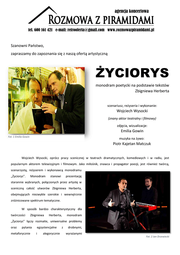 Szanowni Państwo, zapraszamy do zapoznania się z naszą ofertą artystyczną ŻYCIORYS monodram poetycki na podstawie tekstów Zbigniewa Herberta scenariusz, reżyseria i wykonanie: Wojciech Wysocki (znany aktor teatralny i filmowy) zdjęcia, wizualizacje: Emilia Gowin Fot. 1 Emilia Gowin muzyka na żywo: Piotr Kajetan Matczuk Wojciech Wysocki, oprócz pracy scenicznej w teatrach dramatycznych, komediowych i w radiu, jest popularnym aktorem telewizyjnym i filmowym. Jako miłośnik, znawca i propagator poezji, jest również twórcą, scenarzystą, reżyserem i wykonawcą monodramu „Życiorys”. Monodram stanowi prezentację starannie wybranych, połączonych przez artystę w sceniczną całość utworów Zbigniewa Herberta, obejmujących niezwykle szerokie i wewnętrznie zróżnicowane spektrum tematyczne. W sposób bardzo charakterystyczny dla twórczości Zbigniewa Herberta, monodram „Życiorys” łączy rozmaite, uniwersalne problemy oraz pytania metaforycznie egzystencjalne i alegorycznie z drobnymi, wyrażanymi Fot. 2 Jan Drzewiecki obserwacjami i opowiastkami o życiu godziwym i niegodziwym, ludzi, zwierząt oraz o otaczających nas przedmiotach. Monodram wykonywany jest z muzyką na żywo w kompozycjach Piotra Kajetana Matczuka. Opcjonalnie - na całość przedsięwzięcia składa się także plenerowa wystawa wielkoformatowych, artystycznych fotografii autorstwa Emilii Gowin z dobranymi i wkomponowanymi w nie literniczo cytatami z utworów poetyckich Zbigniewa Herberta. Te wielkoformatowe fotogramy o wymiarach 1m x 1,4 m są naklejone na lekkie plansze zdjęciowe i tekstowe, zafoliowane, odporne na zmienne warunki atmosferyczne, łatwe do transportu oraz montażu. Mogą być instalowane i eksponowane w przestrzeni publicznej, by zaskakiwać i przyciągać uwagę widzów. ZAPRASZAMY DO WSPÓŁPRACY ARTYSTYCZNEJ • Szczegóły techniczne oraz finansowe: Monodram trwa ok. 60 minut. Do realizacji spektaklu potrzebne jest oświetlenie i nagłośnienie dostosowane do parametrów sali, projektor multimedialny z ekranem oraz przykryty ciemnym obrusem stolik i krzesło. Po spektaklu możliwe jest także ewentualne spotkanie autorskie z Wojciechem Wysockim. Istnieje dodatkowo możliwość wypożyczenia w promocyjnej cenie naszego nagłośnienia do przeprowadzenia i realizacji spektaklu. W celu ustalenia szczegółów prosimy o kontakt. Dodatkowo istnieje możliwość czasowego wypożyczenia wystawy zdjęć autorstwa Emilii Gowin, 26 fotogramów o wymiarach 1m x 1,4 m. Więcej informacji nt. wystawy i monodramu znajduje się w serwisie Youtube pod adresem: https://www.youtube.com/watch?v=gZVeIv37DWg KONTAKT: ROZMOWA Z PIRAMIDAMI agencja koncertowa W sprawie organizacji spektaklu: tel. 600 161 421 lub e-mail: [email protected] www.rozmowazpiramidami.pl