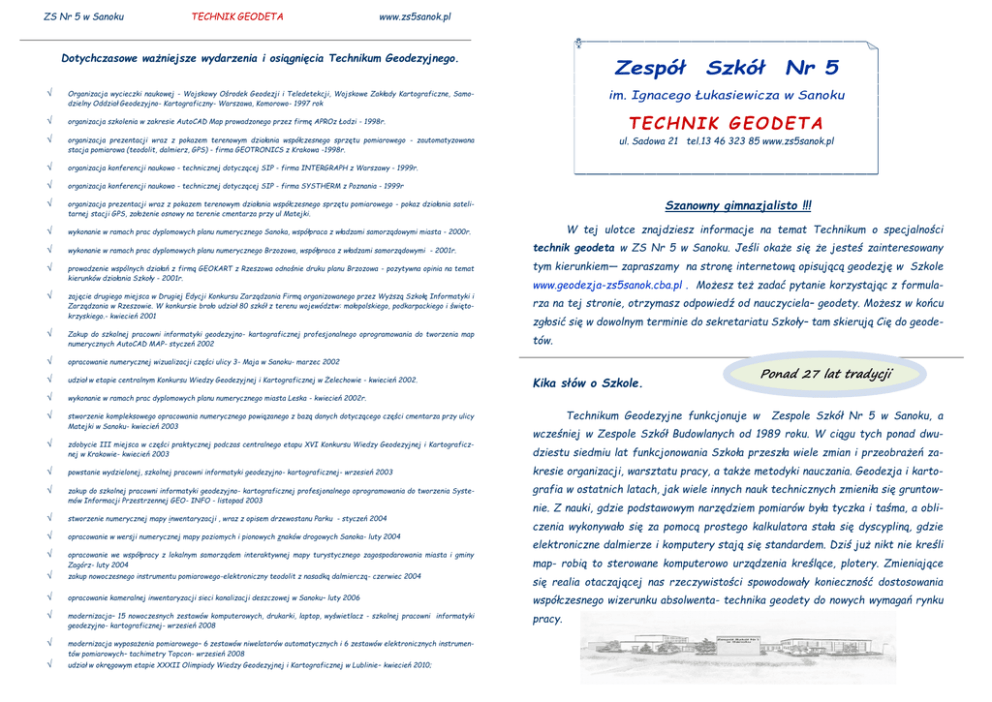 ZS Nr 5 w Sanoku TECHNIK GEODETA www.zs5sanok.pl Dotychczasowe ważniejsze wydarzenia i osiągnięcia Technikum Geodezyjnego. Organizacja wycieczki naukowej - Wojskowy Ośrodek Geodezji i Teledetekcji, Wojskowe Zakłady Kartograficzne, Samodzielny Oddział Geodezyjno- Kartograficzny- Warszawa, Komorowo- 1997 rok organizacja szkolenia w zakresie AutoCAD Map prowadzonego przez firmę APROz Łodzi - 1998r. organizacja prezentacji wraz z pokazem terenowym działania współczesnego sprzętu pomiarowego - zautomatyzowana stacja pomiarowa (teodolit, dalmierz, GPS) - firma GEOTRONICS z Krakowa -1998r. organizacja konferencji naukowo - technicznej dotyczącej SIP - firma INTERGRAPH z Warszawy - 1999r. organizacja konferencji naukowo - technicznej dotyczącej SIP - firma SYSTHERM z Poznania - 1999r organizacja prezentacji wraz z pokazem terenowym działania współczesnego sprzętu pomiarowego - pokaz działania satelitarnej stacji GPS, założenie osnowy na terenie cmentarza przy ul Matejki. wykonanie w ramach prac dyplomowych planu numerycznego Sanoka, współpraca z władzami samorządowymi miasta - 2000r. wykonanie w ramach prac dyplomowych planu numerycznego Brzozowa, współpraca z władzami samorządowymi - 2001r. prowadzenie wspólnych działań z firmą GEOKART z Rzeszowa odnośnie druku planu Brzozowa - pozytywna opinia na temat kierunków działania Szkoły - 2001r. zajęcie drugiego miejsca w Drugiej Edycji Konkursu Zarządzania Firmą organizowanego przez Wyższą Szkołę Informatyki i Zarządzania w Rzeszowie. W konkursie brało udział 80 szkół z terenu województw: małopolskiego, podkarpackiego i świętokrzyskiego.- kwiecień 2001 Zakup do szkolnej pracowni informatyki geodezyjno- kartograficznej profesjonalnego oprogramowania do tworzenia map numerycznych AutoCAD MAP- styczeń 2002 opracowanie numerycznej wizualizacji części ulicy 3- Maja w Sanoku- marzec 2002 udział w etapie centralnym Konkursu Wiedzy Geodezyjnej i Kartograficznej w Żelechowie - kwiecień 2002. wykonanie w ramach prac dyplomowych planu numerycznego miasta Leska - kwiecień 2002r. stworzenie kompleksowego opracowania numerycznego powiązanego z bazą danych dotyczącego części cmentarza przy ulicy Matejki w Sanoku- kwiecień 2003 zdobycie III miejsca w części praktycznej podczas centralnego etapu XVI Konkursu Wiedzy Geodezyjnej i Kartograficznej w Krakowie- kwiecień 2003 powstanie wydzielonej, szkolnej pracowni informatyki geodezyjno- kartograficznej- wrzesień 2003 zakup do szkolnej pracowni informatyki geodezyjno- kartograficznej profesjonalnego oprogramowania do tworzenia Systemów Informacji Przestrzennej GEO- INFO - listopad 2003 stworzenie numerycznej mapy inwentaryzacji , wraz z opisem drzewostanu Parku - styczeń 2004 opracowanie w wersji numerycznej mapy poziomych i pionowych znaków drogowych Sanoka- luty 2004 opracowanie we współpracy z lokalnym samorządem interaktywnej mapy turystycznego zagospodarowania miasta i gminy Zagórz- luty 2004 Zespół Szkół Nr 5 im. Ignacego Łukasiewicza w Sanoku TECHNIK GEODETA ul. Sadowa 21 tel.13 46 323 85 www.zs5sanok.pl Szanowny gimnazjalisto !!! W tej ulotce znajdziesz informacje na temat Technikum o specjalności technik geodeta w ZS Nr 5 w Sanoku. Jeśli okaże się że jesteś zainteresowany tym kierunkiem— zapraszamy na stronę internetową opisującą geodezję w Szkole www.geodezja-zs5sanok.cba.pl . Możesz też zadać pytanie korzystając z formularza na tej stronie, otrzymasz odpowiedź od nauczyciela– geodety. Możesz w końcu zgłosić się w dowolnym terminie do sekretariatu Szkoły– tam skierują Cię do geodetów. Kika słów o Szkole. Ponad 27 lat tradycji Technikum Geodezyjne funkcjonuje w Zespole Szkół Nr 5 w Sanoku, a wcześniej w Zespole Szkół Budowlanych od 1989 roku. W ciągu tych ponad dwudziestu siedmiu lat funkcjonowania Szkoła przeszła wiele zmian i przeobrażeń zakresie organizacji, warsztatu pracy, a także metodyki nauczania. Geodezja i kartografia w ostatnich latach, jak wiele innych nauk technicznych zmieniła się gruntownie. Z nauki, gdzie podstawowym narzędziem pomiarów była tyczka i taśma, a obliczenia wykonywało się za pomocą prostego kalkulatora stała się dyscypliną, gdzie elektroniczne dalmierze i komputery stają się standardem. Dziś już nikt nie kreśli map- robią to sterowane komputerowo urządzenia kreślące, plotery. Zmieniające zakup nowoczesnego instrumentu pomiarowego-elektroniczny teodolit z nasadką dalmierczą- czerwiec 2004 się realia otaczającej nas rzeczywistości spowodowały konieczność dostosowania opracowanie kameralnej inwentaryzacji sieci kanalizacji deszczowej w Sanoku– luty 2006 współczesnego wizerunku absolwenta- technika geodety do nowych wymagań rynku modernizacja– 15 nowoczesnych zestawów komputerowych, drukarki, laptop, wyświetlacz - szkolnej pracowni informatyki geodezyjno- kartograficznej- wrzesień 2008 pracy. modernizacja wyposażenia pomiarowego– 6 zestawów niwelatorów automatycznych i 6 zestawów elektronicznych instrumentów pomiarowych– tachimetry Topcon- wrzesień 2008 udział w okręgowym etapie XXXII Olimpiady Wiedzy Geodezyjnej i Kartograficznej w Lublinie- kwiecień 2010; ZS Nr 5 w Sanoku TECHNIK GEODETA www.zs5sanok.pl Praca technika geodety. ZS Nr 5 w Sanoku TECHNIK GEODETA www.zs5sanok.pl Technik Geodeta- nauka trwa 4 lata. We współczesnych formach organizacji prac geodezyjnych są w zasadzie stosowane dwa typowe rozwiązania. W zespołach wieloosobowych decydującą rolę pełni inżynier. Kierując zespołem, rozwiązuje najtrudniejsze problemy, programuje i organizuje pracę. Technik wykonuje większość czynności produkcyjnych. Przy wykonywaniu prostych, typowych, krótkotrwałych robót, w których występują powtarzalne czynności, kierownikiem zespołu i wykonawcą jest zazwyczaj technik. Technik geodeta pracuje także w administracji, w urzędach, ośrodkach dokumentacji geodezyjnej i kartograficznej. Rolę te