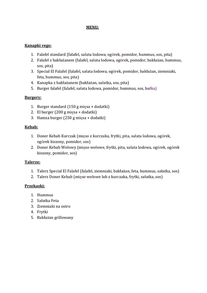 MENU: Kanapki vege: 1. Falafel standard (falafel, sałata lodowa, ogórek, pomidor, hummus, sos, pita) 2. Falafel z bakłażanem (falafel, sałata lodowa, ogórek, pomidor, bakłażan, hummus, sos, pita) 3. Special El Falafel (falafel, sałata lodowa, ogórek, pomidor, bakłażan, ziemniaki, feta, hummus, sos, pita) 4. Kanapka z bakłażanem (bakłażan, sałatka, sos, pita) 5. Burger falafel (falafel, sałata lodowa, pomidor, hummus, sos, bułka) Burgery: 1. Burger standard (150 g mięsa + dodatki) 2. El burger (200 g mięsa + dodatki) 3. Hamza burger (250 g mięsa + dodatki) Kebab: 1. Doner Kebab Kurczak (mięso z kurczaka, frytki, pita, sałata lodowa, ogórek, ogórek kiszony, pomidor, sos) 2. Doner Kebab Wołowy (mięso wołowe, frytki, pita, sałata lodowa, ogórek, ogórek kiszony, pomidor, sos) Talerze: 1. Talerz Special El Falafel (falafel, ziemniaki, bakłażan, feta, hummus, sałatka, sos) 2. Talerz Doner Kebab (mięso wołowe lub z kurczaka, frytki, sałatka, sos) Przekaski: 1. 2. 3. 4. 5. Hummus Sałatka Feta Ziemniaki na ostro Frytki Bakłażan grillowany