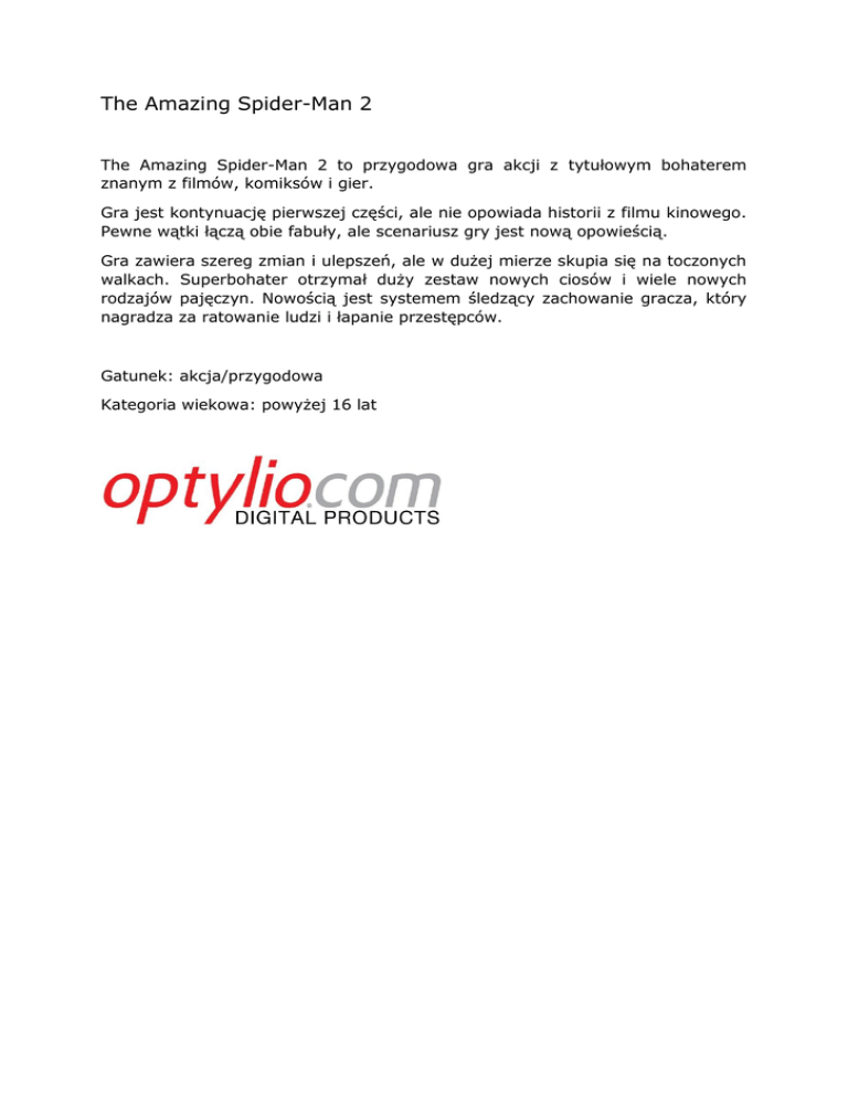 The Amazing Spider-Man 2 The Amazing Spider-Man 2 to przygodowa gra akcji z tytułowym bohaterem znanym z filmów, komiksów i gier. Gra jest kontynuację pierwszej części, ale nie opowiada historii z filmu kinowego. Pewne wątki łączą obie fabuły, ale scenariusz gry jest nową opowieścią. Gra zawiera szereg zmian i ulepszeń, ale w dużej mierze skupia się na toczonych walkach. Superbohater otrzymał duży zestaw nowych ciosów i wiele nowych rodzajów pajęczyn. Nowością jest systemem śledzący zachowanie gracza, który nagradza za ratowanie ludzi i łapanie przestępców. Gatunek: akcja/przygodowa Kategoria wiekowa: powyżej 16 lat