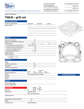 Kolonia Warszawska Al. Krakowska 96A 05-552 Wólka Kosowska [email protected] www.plastservicepack.pl Producent wiader i pojemników z tworzyw sztucznych tel. +48 (022) 756 15 86 756 15 44 756 17 07 fax: +48 (022) 756 17 02 KARTA TECHNICZNA TWŁN - grill set DANE PODSTAWOWE Składowe opakowania Numery form: pojemnik - pokrywa - uchwyt - WIADRO Pojemność właściwa Pojemność całkowita do pokrywy Waga wiadra ¹ a - wymiary korony zewnętrzne ² b - wymiary korony wewnętrzne ² c - wymiary zewnętrzne dna ² h - wysokość opakowania ² Waga uchwytu Rodzaj uchwytu - ml a - ml 113 g / g/ g/ g 285 x 290 mm F - mm F - mm 27- mm a g - 1 tolerancja +/- 3 % 2 tolerancja +/- 1 mm PRZEKRÓJ F-F POKRYWA Waga Wymiar zewnętrzny Wysokość *Pokrywa pod zgrzew PAKOWANIE Sposób pakowania: Wiadra Pokrywy Kratka -g - mm - mm -g Paleta Euro duży 800x400x620 Kartony średni 900x400x310 wg. indywidualnych ustaleń. NADRUK Wiadro Offset/IML Pokrywa Offset/IML - DODATKOWE Materiał Kolorystyka PP Standard biały kolor na zamówienie Zabezpieczenie Maksymalny nacisk przy 20oC Kratka Przeznaczenie - kg - g Zestaw grillowy mały 400x400x310 UŁOŻENIE NA PALECIE