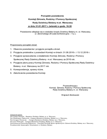 Porządek posiedzenia Komisji Zdrowia, Rodziny i Pomocy Społecznej Rady Dzielnicy Bielany m.st. Warszawy w dniu 31.01.2017 r. (wtorek) o godz. 16.30 Posiedzenie odbędzie się w siedzibie Urzędu Dzielnicy Bielany m. st. Warszawy, ul. Żeromskiego 29 (sala konferencyjna – V p.). Proponowany porządek obrad: 1. Otwarcie posiedzenia i przyjęcie porządku obrad. 2. Przyjęcie protokołów z posiedzeń Komisji w dniach: 31.08.2016 r. i 13.12.2016 r. 3. Przyjęcie sprawozdania z działalności Komisji Zdrowia, Rodziny i Pomocy Społecznej Rady Dzielnicy Bielany m.st. Warszawy za 2016 rok. 4. Przyjęcie planu pracy Komisji Zdrowia, Rodziny i Pomocy Społecznej Rady Dzielnicy Bielany m.st. Warszawy na 2017 rok. 5. Korespondencja, sprawy różne. 6. Zakończenie posiedzenia Komisji. Przewodniczący Komisji Zdrowia, Rodziny i Pomocy Społecznej Rady Dzielnicy Bielany m. st. Warszawy Wojciech Borkowski Zaproszeni goście: Pan Tomasz M encina – Burmistrz Dzielnicy Bielany m. st. Warszawy, Pan Włodzimierz Piątkowski - Zastępca Burmistrza Dzielnicy Bielany m. st. Warszawy, Pan Grzegorz Pietruczuk – Zastępca Burmistrza Dzielnicy Bielany m.st. Warszawy, Pan Artur Wołczacki – Zastępca Burmistrza Dzielnicy Bielany m. st. Warszawy, Pani Katarzyna Piotrowska-Radziewicz - Naczelnik Wydziału Spraw Społecznych i Zdrowia Dzielnicy Bielany m.st. Warszawy, Przedstawiciele Samorządów M ieszkańców w Dzielnicy Bielany.