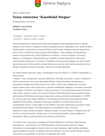 Piątek, 1 kwietnia 2016 Trasa rowerowa "Kaszëbskô Stegna" Przebieg trasy rowerowej Długość trasy 20 km Trudność trasy : Szymbark – Krzeszna bardzo trudna Krzeszna – Stężyca średnio trudna Trasa prowadzi przez malownicze tereny Kaszubskiego Parku Krajobrazowego w gminie Stężyca. Są to tereny o wybitnych walorach krajobrazowych, obejmujące m.in. pasmo Wzgórz Szymbarskich z najwyższym szczytem Wieżycą (329 m npm charakteryzują się bogactwem jezior, lasów, stąd bierze swój początek rzeka Radunia. Tutaj znajdują się najciekawsze miejsca na Kaszubach jak: Wieża Widokowa na Wieżycy, Centrum Edukacji i Promocji Regionu w Szymbarku, Ogród Botaniczny w Gołubiu, dworek Wybickich w Sikorzynie, cmentarzysko kurhanowe w Uniradze. W pobliżu trasy rowerowej znajduje się sporo kwater agroturystycznych, które oprócz noclegu oferują też smaczne dnia kuchni regionalnej. Są to idealne warunki do rozwoju turystyki, zwłaszcza turystyki aktywnej. Na trasie zostały ustawione mapy z przebiegiem trasy-na Wieżycy, w CEiPR w Szymbarku, w Pierszczewie i Stężycy. Trasę oznakowano z pomocą tabliczek z sylwetką rowerzysty i roweru i paskiem w kolorze czerwonym oraz nazwą Kaszebsko Stegna. Tabliczki zostały umieszczone na wszystkich ważniejszych skrzyżowaniach na trasie. Oprócz tego zaplanowano na trasie miejsca odpoczynku, które oznaczono za pomocą niebieskich trójkątów z sylwetką rowerzysty i kierunkiem w kolorze czerwonym i nazwą przystanku. W tych miejscach zostały ustawione stoły, ławki, stojaki na rowery Na odcinku Wieżyca-CEPR Szymbark trasa prowadzi ścieżką przyrodniczą Pod Wieżycą (na mapie oznaczono z pomocą zielonych prostokątów). Z CEPR do wsi trasa prowadzi droga asfaltową. Z Szymbarka do Krzesznej trasa prowadzi żółtym szlakiem turystycznym. Następnie czerwonym szlakiem w stronę Pierszczewka do przydrożnego krzyża. Z tego miejsca aż do Stężycy trasa jest oznakowana za pomocą wyżej przedstawionych znaków. Na mapie pokazane są dodatkowe trasy rowerowe. Dojechać do trasy można pociągiem, najlepiej wysiąść na stacji Wieżyca, stamtąd szosą nad torami w stronę Krzesznej, i drugą szosą w lewo pod górę( bardzo stromy podjazd) do Szymbarka i dalej na parking pod wieżę widokową na Wieżycy. * Początek trasy rowerowej z parkingu pod Wieżą Widokową na Wieżycy-dalej Ścieżką Przyrodniczą -,,Pod Wieżycą” do CEPR Szymbark. Droga prowadzi przez las. Zanim wyruszymy na szlak,najpierw musimy wejść na wieżę widokową, skąd możemy podziwiać piękno krajobrazu Kaszub. W pobliżu wieży jest położony rezerwat,,Szczyt Wieżyca”.Rower zostawiamy na przystanku rowerowym na parkingu pod wieżą. Droga do CEPR w Szymbarku prowadzi ścieżką przyrodniczą do szosy,a dalej w lewo i następna droga w prawo. Koniecznie należy się tutaj zatrzymać, aby zwiedzić to miejsce z Najdłuższą Deską Świata, Dom Sybiraka, Dom do Góry Nogami itp. Czas zwiedzania około 1,5 godz. Odległość z parkingu do CEPR- 2,4 km. Tuż za wejściem na teren ośrodka są ustawione stojaki na rowery. W roku 2012 zostanie tutaj uruchomiona wypożyczalna rowerów. * Z CEPR w stronę wsi Szymbark, zjeżdżamy w dół szosą, przecinamy drogę powiatową i jedziemy koło kapliczki w stronę Patuł żółtym szlakiem,ulicami Sportową, Rzemieślniczą a następnie Spacerową w stronę Krzesznej. Zjazd od ulicy Spacerowej do Krzesznej charakteryzuje się dużymi spadkami terenu, bez dobrych hamulców nie da się bezpiecznie zjechać z tych wzniesień. Droga prowadzi polami, dojeżdżamy do pierwszych zabudowań i skręcamy lekko w lewo pod górkę, po prawej żywopłot z modrzewia a po lewej transformator, zjeżdżając z góry docieramy do Krzesznej. Kierujemy się w lewo na wiadukt kolejowy, jedziemy z górki czerwonym szlakiem do krzyża i skręcamy w prawo w stronę Nowych Czapli. Od skrzyżowania poruszamy się oznaczoną trasą rowerową. Po lewej stronie drogi mamy jezioro Patulskie, dojeżdżamy do starej chaty kaszubskiej w Pierszczewku, w prawo prowadzi czerwony szlak pieszy którym dojedziemy do jeziora Ostrzyckiego, a dalej do rezerwatu,,Ostrzycki Las”. Nad jeziorem Ostrzyckim jest wypożyczalnia sprzętu wodnego. Odległość CEPR Szymbark-Krzeszna-3,6 km * Wracamy na szlak rowerowy jedziemy droga polną nad jeziorem Patulskim przez Pierszczewko. W tej miejscowości po lewej stronie drogi zobaczymy ciekawe zbiory oraz kamienie o historii Kaszub. Są to prywatne zbiory Państwa Schymichowskich. Dalej i skręcamy w prawo pod górę. Po lewej stronie zostawiamy jezioro Patulskie. Drogą polną przez las dojeżdżamy do skrzyżowania dróg, po lewej stronie mamy las modrzewiowy, a po prawej las świerkowy. Jedziemy w lewo pod górkę w stronę Pierszczewa przez Kamyszki. W Pierszczewie znajduje się jeden z przystanków na trasie rowerowej. Tutaj możemy odpocząć, zapoznać się z historią miejscowości,zostawić rower i zejść nad jezioro Patulskie( około 300 m). Odległość Krzeszna-Pierszczewo 3,6 km *Z tego przystanku jedziemy pod górę w stronę jeziora i grodziska Zamkowisko. W tym miejscu jest następny przystanek na trasie. Tutaj można się wykąpać w krystalicznie czystej wodzie jeziora Zamkowisko, zapoznać się z historią tego miejsca. *Stąd jedziemy w prawo pod górkę, na skrzyżowaniu dróg skręcamy w stronę Starych Czapli, droga prowadzi przez las, za lasem w lewo, w drugą drogę. Jedziemy w stronę Smokowa, dojeżdżamy do kapliczki,na tym skrzyżowaniu dróg jedziemy prosto, dojeżdżamy do krzyża i tu też prosto w stronę leśniczówki Uniradze. Za leśniczówką przy drodze znajduje się następny przystanek na tej trasie. W tym miejscu znajdą Państwo informacje o historii cmentarzyska kurhanowego. Trasa ze Smokowa do Stężycy prowadzi głównie przez las. Odległość Pierszczewo- Uniradze - 6,4 km, Uniradze –Stężyca 4,3 km * Z Uniradze do Stężycy przez las zgodnie z oznaczeni