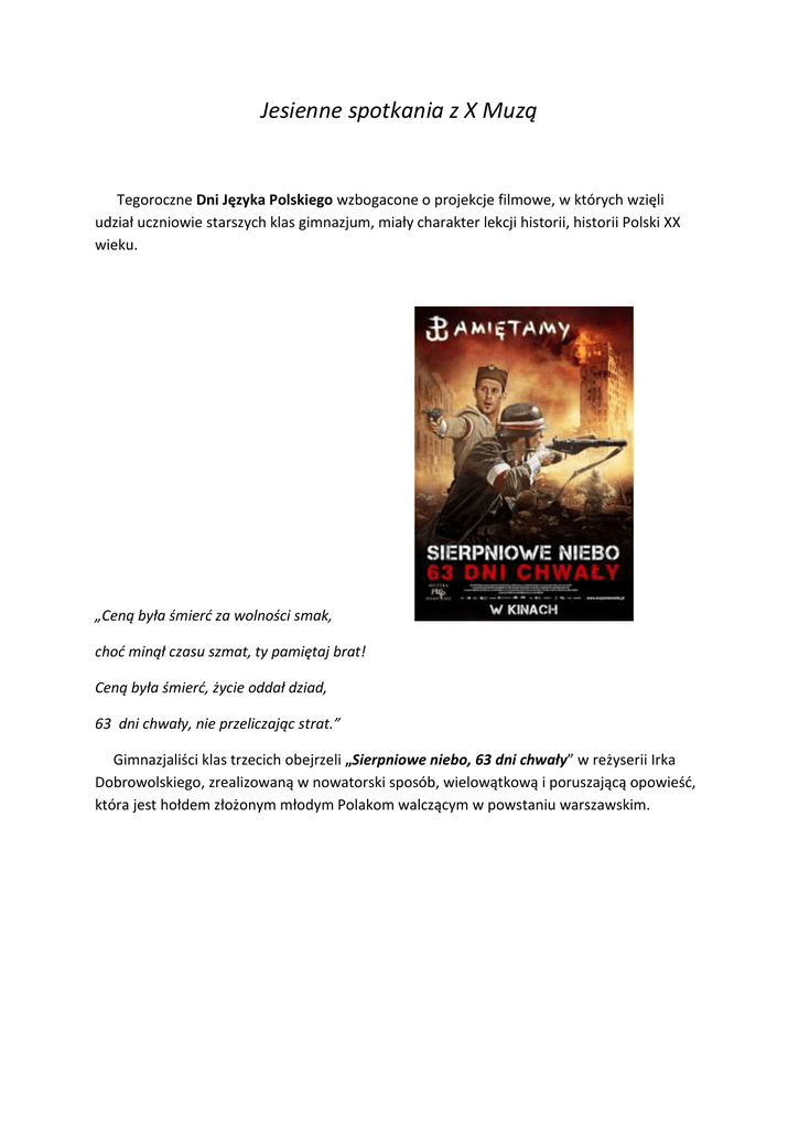 Jesienne spotkania z X Muzą Tegoroczne Dni Języka Polskiego wzbogacone o projekcje filmowe, w których wzięli udział uczniowie starszych klas gimnazjum, miały charakter lekcji historii, historii Polski XX wieku. „Ceną była śmierć za wolności smak, choć minął czasu szmat, ty pamiętaj brat! Ceną była śmierć, życie oddał dziad, 63 dni chwały, nie przeliczając strat.” Gimnazjaliści klas trzecich obejrzeli „Sierpniowe niebo, 63 dni chwały” w reżyserii Irka Dobrowolskiego, zrealizowaną w nowatorski sposób, wielowątkową i poruszającą opowieść, która jest hołdem złożonym młodym Polakom walczącym w powstaniu warszawskim. „Wolność kocham i rozumiem Wolności oddać nie umiem.” Nad historią wielkich przemian, która przetoczyła się nie tylko przez zebrania partyjne, wiece i Okrągły Stół, ale także przez jedno z gdańskich mieszkań, zadumali się – mamy nadzieję – refleksyjni gimnazjaliści, oglądając biograficzną opowieść filmową Andrzeja Wajdy pt. „Wałęsa. Człowiek z nadziei”. Obydwa filmy, zgodnie z maksymą „Historia magistra vitae est”, stanowią uzupełnienie edukacji historycznej i obywatelskiej młodych kinomanów i pozwolą zrozumieć „fenomen Polaka” – powstańca, warszawiaka, patrioty, robotnika, przywódcy…
