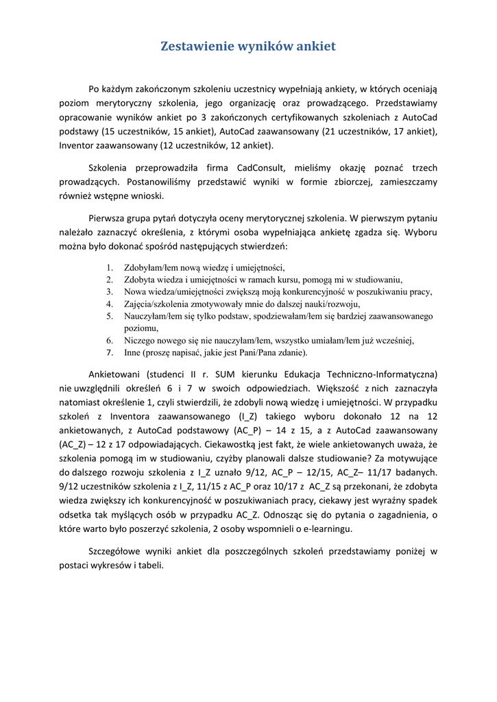 Zestawienie wyników ankiet Po każdym zakończonym szkoleniu uczestnicy wypełniają ankiety, w których oceniają poziom merytoryczny szkolenia, jego organizację oraz prowadzącego. Przedstawiamy opracowanie wyników ankiet po 3 zakończonych certyfikowanych szkoleniach z AutoCad podstawy (15 uczestników, 15 ankiet), AutoCad zaawansowany (21 uczestników, 17 ankiet), Inventor zaawansowany (12 uczestników, 12 ankiet). Szkolenia przeprowadziła firma CadConsult, mieliśmy okazję poznać trzech prowadzących. Postanowiliśmy przedstawić wyniki w formie zbiorczej, zamieszczamy również wstępne wnioski. Pierwsza grupa pytań dotyczyła oceny merytorycznej szkolenia. W pierwszym pytaniu należało zaznaczyć określenia, z którymi osoba wypełniająca ankietę zgadza się. Wyboru można było dokonać spośród następujących stwierdzeń: 1. 2. 3. 4. 5. 6. 7. Zdobyłam/łem nową wiedzę i umiejętności, Zdobyta wiedza i umiejętności w ramach kursu, pomogą mi w studiowaniu, Nowa wiedza/umiejętności zwiększą moją konkurencyjność w poszukiwaniu pracy, Zajęcia/szkolenia zmotywowały mnie do dalszej nauki/rozwoju, Nauczyłam/łem się tylko podstaw, spodziewałam/łem się bardziej zaawansowanego poziomu, Niczego nowego się nie nauczyłam/łem, wszystko umiałam/łem już wcześniej, Inne (proszę napisać, jakie jest Pani/Pana zdanie). Ankietowani (studenci II r. SUM kierunku Edukacja Techniczno-Informatyczna) nie uwzględnili określeń 6 i 7 w swoich odpowiedziach. Większość z nich zaznaczyła natomiast określenie 1, czyli stwierdzili, że zdobyli nową wiedzę i umiejętności. W przypadku szkoleń z Inventora zaawansowanego (I_Z) takiego wyboru dokonało 12 na 12 ankietowanych, z AutoCad podstawowy (AC_P) – 14 z 15, a z AutoCad zaawansowany (AC_Z) – 12 z 17 odpowiadających. Ciekawostką jest fakt, że wiele ankietowanych uważa, że szkolenia pomogą im w studiowaniu, czyżby planowali dalsze studiowanie? Za motywujące do dalszego rozwoju szkolenia z I_Z uznało 9/12, AC_P – 12/15, AC_Z– 11/17 badanych. 9/12 uczestników szkolenia z I_Z, 11/15 z AC_P oraz 10/17 z AC_Z są przekonani, że zdobyta wiedza zwiększy ich konkurencyjność w poszukiwaniach pracy, ciekawy jest wyraźny spadek odsetka tak myślących osób w przypadku AC_Z. Odnosząc się do pytania o zagadnienia, o które warto było poszerzyć szkolenia, 2 osoby wspomnieli o e-learningu. Szczegółowe wyniki ankiet dla poszczególnych szkoleń przedstawiamy poniżej w postaci wykresów i tabeli. Inventor zaawansowany Pytanie1. Proszę wybrać określenia z którymi się Pani/Pan zgadza zdobyłam/łem nową wiedzę i umiejętności, 9 zdobyta wiedza i umiejętności w ramach kursu, pomogą mi w studiowaniu 9 nowa wiedza/umiejętności zwiększą moją konkurencyjność w poszukiwaniu pracy 4 zajęcia/szkolenia zmotywowały mnie do dalszej nauki/rozwoju 12 0 2 4 6 8 10 12 14 AutoCad podstawy Pytanie1. Proszę wybrać określenia z którymi się Pani/Pan zgadza zdobyłam/łem nową wiedzę i umiejętności, 1 zdobyta wiedza i umiejętności w ramach kursu, pomogą mi w studiowaniu 12 nowa wiedza/umiejętności zwiększą moją konkurencyjność w poszukiwaniu pracy 11 zajęcia/szkolenia zmotywowały mnie do dalszej nauki/rozwoju 7 nauczyłam/łem się tylko podstaw, spodziewałam/łem się bardziej zaawansowanego poziomu 14 0 5 10 15 AutoCad zaawansowany Pytanie1. Proszę wybrać określenia z którymi się Pani/Pan zgadza Zdobyłam/łem nową wiedzę i umiejętności, 1 Zdobyta wiedza i umiejętności w ramach kursu, pomogą mi w studiowaniu Nowa wiedza/umiejętności zwiększą moją konkurencyjność w poszukiwaniu pracy Zajęcia/szkolenia zmotywowały mnie do dalszej nauki/rozwoju 11 10 8 Nauczyłam/łem się tylko podstaw, spodziewałam/łem się bardziej zaawansowanego poziomu 12 0 2 4 6 8 10 12 14 Oceniając tempo prowadzenia zajęć, ankietowani mieli do wyboru odpowiedzi: 1. 2. 3. 4. 5. 6. Za wolne Wolne Dobre Najlepiej dostosowane Dość szybkie Za szybkie Pytanie 3. Tempo prowadzenia szkolenia I_Z 17% 50% 33% dobre najlepiej dostosowane dość szybkie Pytanie 3. Tempo prowadzenia szkolenia AC_P 7% 40% 53% wolne dobre najlepiej dostosowane Pytanie 3. Tempo prowadzenia szkolenia AC_Z Wolne 6% 13% 12% Dobre 13% Najlepiej dostosowane 56% Dość szybkie Za szybkie W ocenie szkolących się, najbardziej odpowiadało im tempo zajęć z Inventora, największy rozrzut odpowiedzi obserwowany był na AutoCad zaawansowany. Odpowiadając na pozostałe odpowiedzi, ankietowani mieli do wyboru jedną z ocen: 1 pkt. – Bardzo słabo 2 pkt. – Słabo 3 pkt. – Przeciętnie 4 pkt. – Dobrze 5 pkt. – Bardzo dobrze Każdej z udzielonych odpowiedzi przyznaliśmy punktację według powyższego klucza, na podstawie zaznaczonych odpowiedzi obliczyliśmy średnie oceny poszczególnych szkoleń według kategorii/pytań. Zestawienie przedstawiamy w postaci tabeli. Tabela 1. Zestawienie ocen szkoleń według kategorii/pytań N 1. 2. Grupa pytań/pytanie Ocena merytoryczna W jakim stopniu zakres treści szkolenia odpowiada Pana/Pani oczekiwaniom? W jakim stopniu stosowane metody nauczania spełniały Pani/Pana oczekiwania? Średnia ocen Ocena organizacji szkolenia 1. 2. 3. Warunki lokalowe Czas trwania szkolenia Program merytoryczny szkolenia Średnia ocen Ocena prowadzącego/-ej 1. 2. 3. 4. Sposób prowadzenia szkolenia Zaangażowanie w prowadzenie szkolenia Przygotowanie szkolenia- poziom merytoryczny Postawa wobec słuchaczy Średnia ocen Inventor AutoCad_P AutoCad_Z 4,4 4,8 3,8 4,8 4,6 5 4,9 3,8 3,8 4,9 4,3 4,9 4,7 4,8 5 5 4,9 3,5 3,8 4 3,8 4,9 4,9 4,9 4,9 4 4,5 5 4,9 4,9 4,9 5 4,9 4,6 4,4 4,4 Najwyżej ocenionym szkoleniem było szkolenie z AutoCad podstawy, najniższe oceny we wszystkich kategoriach otrzymało szkolenie z AutoCad zaawansowany. Niektóre wyniki były zaskakujące – na przykład oceniając sale 10 w Instytucie Techniki, w której odbywały się szkolenia z AC_P i AC_Z, jedna grupa oceni