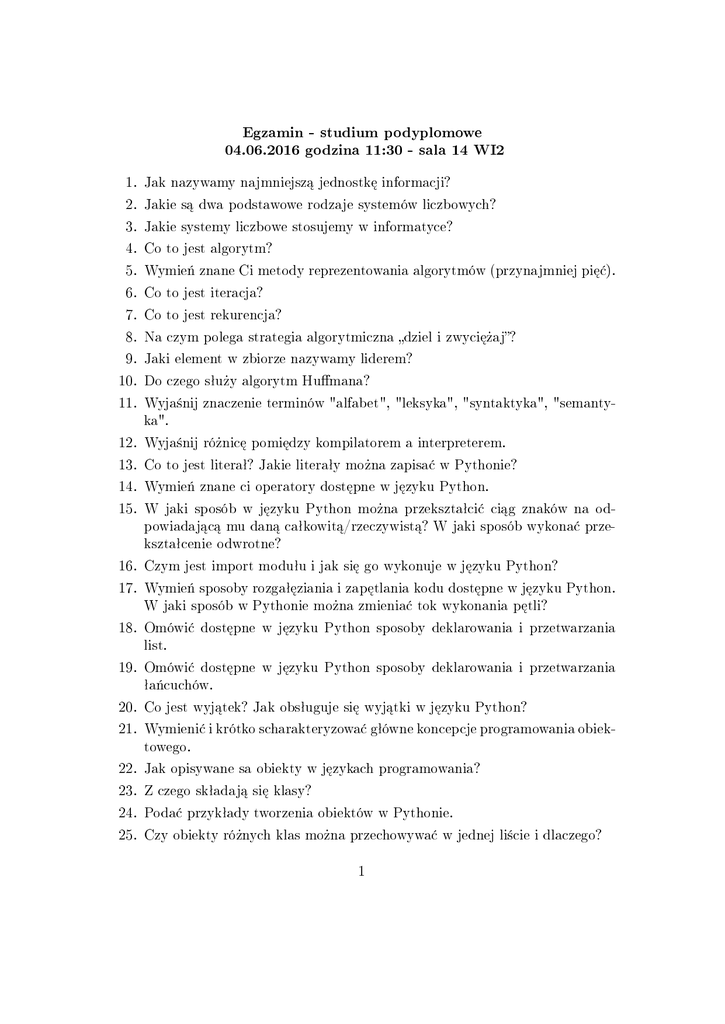 Egzamin - studium podyplomowe 04.06.2016 godzina 11:30 - sala 14 WI2 1. Jak nazywamy najmniejsz¡ jednostk¦ informacji? 2. Jakie s¡ dwa podstawowe rodzaje systemów liczbowych? 3. Jakie systemy liczbowe stosujemy w informatyce? 4. Co to jest algorytm? 5. Wymie« znane Ci metody reprezentowania algorytmów (przynajmniej pi¦¢). 6. Co to jest iteracja? 7. Co to jest rekurencja? 8. Na czym polega strategia algorytmiczna dziel i zwyci¦»aj? 9. Jaki element w zbiorze nazywamy liderem? 10. Do czego sªu»y algorytm Humana? 11. Wyja±nij znaczenie terminów "alfabet", "leksyka", "syntaktyka", "semantyka". 12. Wyja±nij ró»nic¦ pomi¦dzy kompilatorem a interpreterem. 13. Co to jest literaª? Jakie literaªy mo»na zapisa¢ w Pythonie? 14. Wymie« znane ci operatory dost¦pne w j¦zyku Python. 15. W jaki sposób w j¦zyku Python mo»na przeksztaªci¢ ci¡g znaków na odpowiadaj¡c¡ mu dan¡ caªkowit¡/rzeczywist¡? W jaki sposób wykona¢ przeksztaªcenie odwrotne? 16. Czym jest import moduªu i jak si¦ go wykonuje w j¦zyku Python? 17. Wymie« sposoby rozgaª¦ziania i zap¦tlania kodu dost¦pne w j¦zyku Python. W jaki sposób w Pythonie mo»na zmienia¢ tok wykonania p¦tli? 18. Omówi¢ dost¦pne w j¦zyku Python sposoby deklarowania i przetwarzania list. 19. Omówi¢ dost¦pne w j¦zyku Python sposoby deklarowania i przetwarzania ªa«cuchów. 20. Co jest wyj¡tek? Jak obsªuguje si¦ wyj¡tki w j¦zyku Python? 21. Wymieni¢ i krótko scharakteryzowa¢ gªówne koncepcje programowania obiektowego. 22. Jak opisywane sa obiekty w j¦zykach programowania? 23. Z czego skªadaj¡ si¦ klasy? 24. Poda¢ przykªady tworzenia obiektów w Pythonie. 25. Czy obiekty ró»nych klas mo»na przechowywa¢ w jednej li±cie i dlaczego? 1 26. Poda¢ kod przykªadowej klasy opisuj¡cej kwadrat. 27. Do czego sªu»y self w klasach? Czy jest to tylko konwencja? 28. Czy konieczna jest implementacja metody init w klasach i dlaczego? 29. Jak w pythonie mo»na dodawa¢ atrybuty z zewn¡trz klas i kiedy powinno sie to robi¢? 30. Jak nale»y w Pythonie umieszcza¢ klasy w moduªach? 31. Omówi¢ podstawy dziedziczenia w Pythonie. 32. Czy w Pythonie mo»liwe jest dziedziczenie wielobazowe i do czego je mo»na stosowa¢? 33. Omówi¢ podstawy polimorzmu w Pythonie. 34. Omówi¢ podstawy kompozycji i agregacji obiektów w Pythonie. 35. Jakich metod mo»na u»y¢ do rozmieszczania wid»etów na oknach w tkinter. 36. Wymieni¢ podstawowe wid»ety i sposoby ich dodawania do okna. 37. W jaki sposób w tkinter obsªugiwane s¡ zdarzenia? 38. Jak zró»nicowa¢ funkcje obsªugi zdarze« w zale»no±ci od pozycji myszy lub naci±ni¦tych klawiszy? 39. Do czego i jak mo»na podpinac funkcj¦ obsªugi zdarze«? 40. Jak mo»na rysowa¢ w oknie tkinter? 41. Czy mo»liwe jest utworzenie wªasnego typu wid»etu, je±li tak, to jak 42. Co to jest HTML? 43. Co to jest CSS? 44. Omów struktur¦ dokumentu HTML. 45. Jakie jest zadanie sekcji <head> </head> 46. Jakie jest zadanie sekcji <body> </body> 47. Jaki jest cel tworzenia kaskadowych arkuszy stylów? 48. Omów poj¦cie selektora. 49. Wymie« narz¦dzia pracy WebDevelopera, umo»liwiaj¡ce pisanie plików .html i .css 50. Omów wybrane znaczniki j¦zyka HTML? (<div> </div>, <span> </span>) 51. Do czego sªu»¡ odsyªacze (hiperª¡cza, linki, odno±niki hipertekstowe)? 52. Jak wstawi¢ link (odsyªacz, hiperª¡cze, odno±nik hipertekstowy) na stronie WWW? 53. Co to jest Twiter Bootstrap? 2