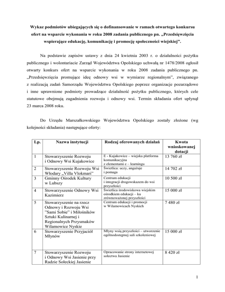 Wykaz podmiotów ubiegających się o dofinansowanie w ramach otwartego konkursu ofert na wsparcie wykonania w roku 2008 zadania publicznego pn. „Przedsięwzięcia wspierające edukację, komunikację i promocję społeczności wiejskiej”. Na podstawie zapisów ustawy z dnia 24 kwietnia 2003 r. o działalności poŜytku publicznego i wolontariacie Zarząd Województwa Opolskiego uchwałą nr 1478/2008 ogłosił otwarty konkurs ofert na wsparcie wykonania w roku 2008 zadania publicznego pn. „Przedsięwzięcia promujące ideę odnowy wsi w wymiarze regionalnym”, związanego z realizacją zadań Samorządu Województwa Opolskiego poprzez organizacje pozarządowe i inne uprawnione podmioty prowadzące działalność poŜytku publicznego, których cele statutowe obejmują zagadnienia rozwoju i odnowy wsi. Termin składania ofert upłynął 23 marca 2008 roku. Do Urzędu Marszałkowskiego Województwa Opolskiego zostały złoŜone (wg kolejności składania) następujące oferty: Lp. Nazwa instytucji Rodzaj oferowanych działań E - Kujakowice – wiejska platforma komunikacyjna z elementami e – learningu Świetlica: uczy, angaŜuje i pomaga Kwota wnioskowanej dotacji 13 760 zł 1 Stowarzyszenie Rozwoju i Odnowy Wsi Kujakowice 2 Stowarzyszenie Rozwoju Wsi Włodary „Villa Vlokmari” Centrum edukacji Gminny Ośrodek Kultury i integracji drogowskazem do wsi w Lubszy 14 702 zł 4 Stowarzyszenie Odnowy Wsi Kazimierz 15 000 zł 5 Stowarzyszenie na rzecz Odnowy i Rozwoju Wsi ”Sami Sobie” i Miłośników Sztuki Kulinarnej i Regionalnych Przysmaków Wilamowice Nyskie Stowarzyszenie Przyjaciół Młynów 3 6 7 Stowarzyszenie Rozwoju i Odnowy Wsi Jasienie przy Radzie Sołeckiej Jasienie przyszłości Świetlica środowiskowa wiejskim ośrodkiem edukacji – ku zrównowaŜonej przyszłości Centrum edukacji i promocji w Wilamowicach Nyskich 10 500 zł 7 480 zł Młyny wsią przyszłości – utworzenie ogólnodostępnej sali szkoleniowej 15 000 zł Opracowanie strony internetowej sołectwa Jasienie 8 420 zł 1 8 9 10 11 12 13 14 15 16 17 18 19 20 21 Stowarzyszenie Odnowy Wsi Zakrzów Stowarzyszenie „Sprawiedliwość Pokój i Integralność Stworzenia” Góra św. Anny Stowarzyszenie Odnowa Wsi Staniszcze Małe Towarzystwo Przyjaciół Wsi Dolna Stowarzyszenie Miłośników Karłowic i Kuźnicy Katowickiej im. ks. dr Jana DzierŜona Parafia Rzymskokatolicka Najświętszego Serca Pana Jezusa w Wawelnie Stowarzyszenie na Rzecz Rozwoju Wsi Gronowice Stowarzyszenie na Rzecz Wspierania Rozwoju Naczęsławic Nasza Wspólnota Stowarzyszenie w Jełowej Stowarzyszenie Przyjaciół Łubnian - CIS Stowarzyszenie na Rzecz Rozwoju Wsi Skorochów Stowarzyszenie na Rzecz Rozwoju Wsi Siemysłów Ochotnicza StraŜ PoŜarna w Nowej Wsi Głubczyckiej Stowarzyszenie Miłośników Lasowic Wielkich 22 Stowarzyszenie „Złota Góra” Jarnołtów 23 Stowarzyszenie na Rzecz Rozwoju Wsi „Dla Chudoby” Stowarzyszenie na Rzecz Rozwoju Wsi Kamionek 24 Z komputerem w Z@krzowie za pan brat 15 000 zł Stworzenie strony internetowej sołectwa i doposaŜenie klubu wiejskiego 15 000 zł Nasza świetlica – centrum edukacji 14 990 zł Zapewnienie mieszkańcom sołectwa dostępu do Internetu oraz opracowanie strony internetowej sołectwa, spełniającej funkcje platformy komunikacji pomiędzy mieszkańcami Strona www platformą komunikacji i promocji 5 700 zł Nasza e – świetlica – wyposaŜenie świetlicy w Wawelnie w sprzęt komputerowy 14 960 zł WyposaŜenie Sali spotkań w Gronowicach w sprzęt multimedialny oraz przystosowanie jej do pełnienia funkcji szkoleniowo - edukacyjnych Dostosowanie świetlicy wiejskiej w Naczęsłowicach do funkcji szkoleniowo – edukacyjnej. 6 900 zł Jełowa Wsią Przyszłości 14 879,75 zł Dostosowanie świetlicy wiejskiej do funkcji szkoleniowej i edukacyjnej 7 400,20 zł Centrum szkoleniowo-edukacyjne w świetlicy wiejskiej w Skorochowie 4 405 zł Wieś w centrum edukacji 14 877,50 zł Sala konferencyjno-szkoleniowa miejscem zdobywania nowej wiedzy 15 000 zł DoposaŜenie sali spotkań jako miejsca pełnienia funkcji szkoleniowo-edukacyjnej Centrum edukacji i promocji pod Złotą Górą 7 184 zł Chudoba bliŜej świata 14 339 zł Stworzenie ogólnodostępnej sali multimedialnej z Internetem 11 215 zł 6 871 zł 11 249 zł 14 372 zł 2 25 26 27 28 29 Stowarzyszenie Rozwoju Lokalnego „ Zielony Most” Skorogoszcz Stowarzyszenie „Rajska Dolina” Reńska Wieś Stowarzyszenie „ Wspólnota Rzymiańska” Rzymiany Stowarzyszenie Koło Gospodyń Wiejskich Odnowa Wsi Krzywiczyny Ochotnicza StraŜ PoŜarna w Wysokiej 30 Stowarzyszenie Rozwoju Jankowic Wielkich „Janko” 31 Gminny Zespół Oświaty, Kultury i Sportu w Baborowie Stowarzyszenie na Rzecz Rozwoju Wsi Skarbiszowice 32 33 Stowarzyszenie na Rzecz Wspierania Rozwoju Długomiłowic „ Nasze Jutro” 34 Stowarzyszenie Przyjaciół Wsi Ligota Oleska 35 Ochotnicza StraŜ PoŜarna w Ściborowicach 36 Gminny Ośrodek Kultury w Pokoju 37 Stowarzyszenie Odnowa Wsi Gracze 38 Stowarzyszenie na Rzecz Rozwoju Winowa Budujemy e - mosty 15 000 zł Klub MłodzieŜy Chrześcijańskiej w Reńskiej Wsi wiejskim centrum edukacji i nowoczesnych technologii informacyjnych Centrum komunikacji i Edukacji w Rzymianach 14 080 zł Przeszkolimy, ugościmy we wsi Krzywiczyny 15 000 zł Utworzenie centrum edukacyjnoszkoleniowego w Gminie Olesno Międzypokoleniowe Wiejskie Centrum Odnowy Wsi w Jankowicach Wielkich Multimedialna sala konferencyjna 12 850 zł Przygotowanie i wyposaŜenie świetlicy wiejskiej w sprzęt multimedialny PodwyŜszanie poziomu edukacji, komunikacji, aktywności zawodowej mieszkańców wsi przez uruchomienie powszechnie dostępnej Sali komputerowej z dostępem do Internetu, funkcją telepracy oraz opracowanie strony internetowej sołectwa Długomiłowice Stworzenie ogólnodostępnej pracowni komputerowej z zapewnieniem mieszkańcom sołectwa dostępu do Internetu Stworzenie ogólnodostępnej Sali dostosowanej i wykorzyst