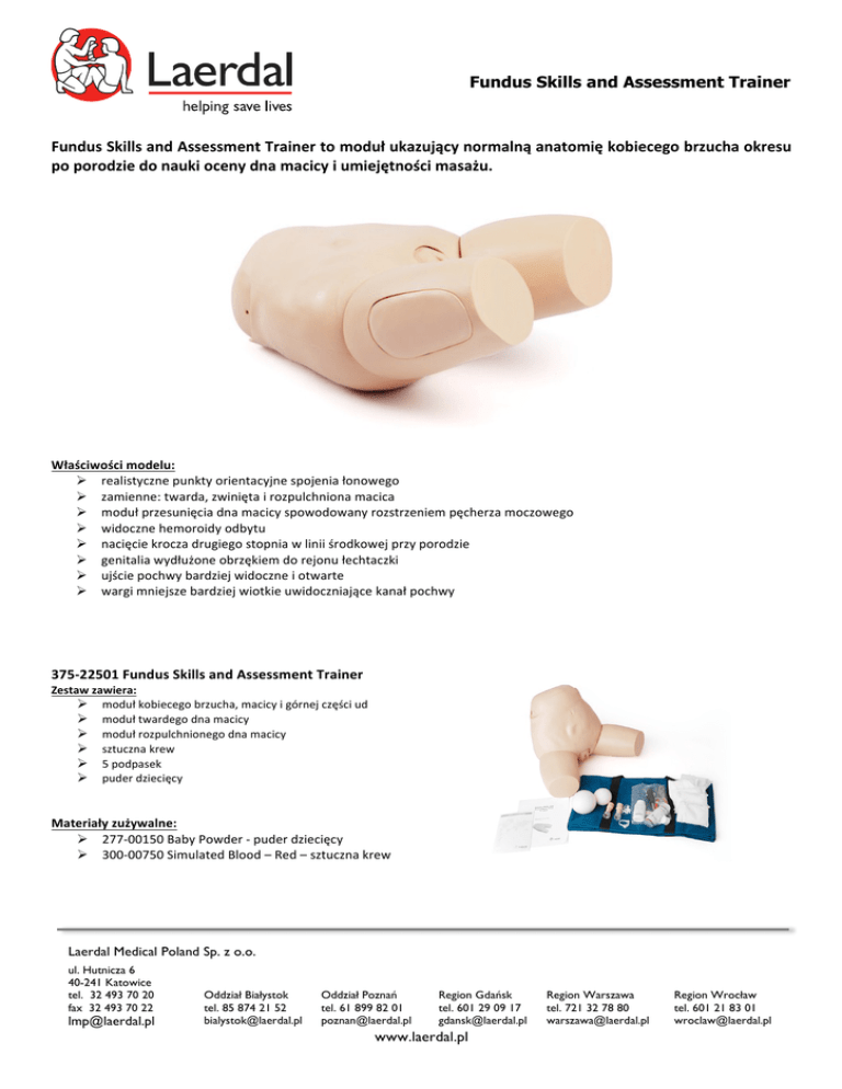 Fundus Skills and Assessment Trainer Fundus Skills and Assessment Trainer to moduł ukazujący normalną anatomię kobiecego brzucha okresu po porodzie do nauki oceny dna macicy i umiejętności masażu. Właściwości modelu: Ø realistyczne punkty orientacyjne spojenia łonowego Ø zamienne: twarda, zwinięta i rozpulchniona macica Ø moduł przesunięcia dna macicy spowodowany rozstrzeniem pęcherza moczowego Ø widoczne hemoroidy odbytu Ø nacięcie krocza drugiego stopnia w linii środkowej przy porodzie Ø genitalia wydłużone obrzękiem do rejonu łechtaczki Ø ujście pochwy bardziej widoczne i otwarte Ø wargi mniejsze bardziej wiotkie uwidoczniające kanał pochwy 375-‐22501 Fundus Skills and Assessment Trainer Zestaw zawiera: Ø moduł kobiecego brzucha, macicy i górnej części ud Ø moduł twardego dna macicy Ø moduł rozpulchnionego dna macicy Ø sztuczna krew Ø 5 podpasek Ø puder dziecięcy Materiały zużywalne: Ø 277-‐00150 Baby Powder -‐ puder dziecięcy Ø 300-‐00750 Simulated Blood – Red – sztuczna krew Laerdal Medical Poland Sp. z o.o. ul. Hutnicza 6 40-241 Katowice tel. 32 493 70 20 fax 32 493 70 22 [email protected] Oddział Białystok tel. 85 874 21 52 [email protected] Oddział Poznań tel. 61 899 82 01 [email protected] Region Gdańsk tel. 601 29 09 17 [email protected] www.laerdal.pl Region Warszawa tel. 721 32 78 80 [email protected] Region Wrocław tel. 601 21 83 01 [email protected]