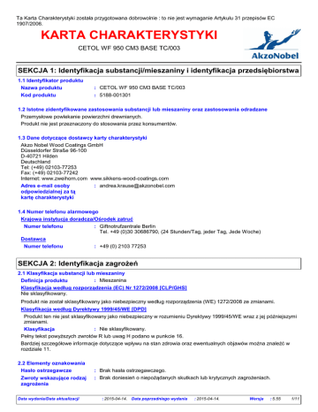 Ta Karta Charakterystyki została przygotowana dobrowolnie : to nie jest wymaganie Artykułu 31 przepisów EC 1907/2006. KARTA CHARAKTERYSTYKI CETOL WF 950 CM3 BASE TC/003 SEKCJA 1: Identyfikacja substancji/mieszaniny i identyfikacja przedsiębiorstwa 1.1 Identyfikator produktu Nazwa produktu : CETOL WF 950 CM3 BASE TC/003 Kod produktu : 5188-001301 1.2 Istotne zidentyfikowane zastosowania substancji lub mieszaniny oraz zastosowania odradzane Przemysłowe powlekanie powierzchni drewnianych. Produkt nie jest przeznaczony do stosowania przez konsumentów. 1.3 Dane dotyczące dostawcy karty charakterystyki Akzo Nobel Wood Coatings GmbH Düsseldorfer Straße 96-100 D-40721 Hilden Deutschland Tel: (+49) 02103-77253 Fax: (+49) 02103-77242 Internet: www.zweihorn.com www.sikkens-wood-coatings.com Adres e-mail osoby : [email protected] odpowiedzialnej za tą kartę charakterystyki 1.4 Numer telefonu alarmowego Krajowa instytucja doradcza/Ośrodek zatruć Numer telefonu : Giftnotrufzentrale Berlin Tel. +49 (0)30 30686790, (24 Stunden/Tag, jeder Tag, Jede Woche) Dostawca Numer telefonu : +49 (0) 2103 77253 SEKCJA 2: Identyfikacja zagrożeń 2.1 Klasyfikacja substancji lub mieszaniny : Mieszanina Definicja produktu Klasyfikacja według rozporządzenia (EC) Nr 1272/2008 [CLP/GHS] Nie sklasyfikowany. Produkt nie został sklasyfikowany jako niebezpieczny według rozporządzenia (WE) 1272/2008 ze zmianami. Klasyfikacja według Dyrektywy 1999/45/WE [DPD] Produkt ten nie jest sklasyfikowany jako niebezpieczny w rozumieniu Dyrektywy 1999/45/WE wraz z jej późniejszymi zmianami. Klasyfikacja : Nie sklasyfikowany. Pełny tekst powyższych zwrotów R lub uwag H podano w punkcie 16. Bardziej szczegółowe informacje dotyczące wpływu na stan zdrowia oraz ewentualnych objawów można znaleźć w rozdziale 11. 2.2 Elementy oznakowania Hasło ostrzegawcze Zwroty wskazujące rodzaj zagrożenia Data wydania/Data aktualizacji : Brak hasła ostrzegawczego. : Brak doniesień o niepożądanych skutkach lub krytycznych zagrożeniach. : 2015-04-14. Data poprzedniego wydania : 2015-04-14. Wersja : 5.55 1/11 Spełnia wymagania przepisów EC 1907/2006 (REACH), Załącznik II - Polska 5188-001301 CETOL WF 950 CM3 BASE TC/003 SEKCJA 2: Identyfikacja zagrożeń Zwroty wskazujące środki ostrożności Zapobieganie : Nie dotyczy. Reagowanie : Nie dotyczy. Przechowywanie Usuwanie Uzupełniające elementy etykiety Ograniczenia dotyczące produkcji, wprowadzania do obrotu i stosowania niektórych niebezpiecznych substancji, preparatów i wyrobów 2.3 Inne zagrożenia Inne zagrożenia nie odzwierciedlone w klasyfikacji : Nie dotyczy. : Nie dotyczy. : Zawiera 1,2-benzoizotiazol-3(2H)-on i mieszanina poreakcyjna: α-3-[3-(2Hbenzotriazol--2-ilo)-5-tert-butylo-4-hydroksyfenylo]-propionylo-ω-hydroksypoli( oksyetylenu) i α-3-[3-(2H-benzotriazol-2-ilo)--5-tert-butylo-4-hydroksyfenylo]propionylo-ω-3-[3-(2H-benzotriazol--2-ilo)-5-tert-butylo-4-hydroksyfenylo]propionyloksypoli(oksyetylenu). Może powodować wystąpienie reakcji alergicznej. Karta charakterystyki dostępna na żądanie. : Produkt przeznaczony wyłącznie do użytku zawodowego. : Brak dodatkowych informacji. SEKCJA 3: Skład/informacja o składnikach : Mieszanina 3.2 Mieszaniny Nie zawiera składników, które w świetle obecnej wiedzy dostawcy oraz w danym stężeniu są klasyfikowane jako niebezpieczne dla zdrowia lub otoczenia, klasyfikowane są jako PBT lub vPvB, lub którym przypisano ograniczenia co do występowania w środowisku pracy,nie ma więc wymogu wymieniania ich w niniejszym ustępie. SEKCJA 4: Środki pierwszej pomocy 4.1 Opis środków pierwszej pomocy : W razie jakichkolwiek wątpliwości, lub jeżeli objawy nie ustępują, należy zasięgnąć Ogólne pomocy lekarskiej. Nigdy nie podawać niczego doustnie osobie nieprzytomnej. W razie utraty przytomności, należy ułożyć w pozycji stabilizowanej (położenie na boku) i uzyskać pomoc lekarską. : Usunąć szkła kontaktowe jeżeli są. Natychmiast przemywać oczy bieżącą wodą, Kontakt z okiem przez co najmniej 15 minut przy otwartych powiekach. Należy natychmiast zwrócić się po pomoc lekarską. Wdychanie : Wynieść na świeże powietrze. Zapewnić osobie ciepło i spokój. Jeżeli osoba nie oddycha, oddycha nieregularnie lub gdy oddychanie ustało, wykwalifikowany personel powinien wykonać sztuczne oddychanie lub podać tlen. : Zdjąć skażoną odzież i buty. Skórę należy myć dokładnie wodą z mydłem lub Kontakt ze skórą stosować sprawdzony środek do mycia skóry. NIE wolno używać rozpuszczalników ani rozcieńczalników. : Po połknięciu skonsultować się natychmiast z lekarzem i pokazać opakowanie lub Spożycie etykietę. Zapewnić osobie ciepło i spokój. NIE wywoływać wymiotów. : Nie należy podejmować żadnych działań, które stwarzałyby ryzyko dla kogokolwiek Ochrona osób chyba, że jest się odpowiednio przeszkolonym. udzielających pierwszej pomocy 4.2 Najważniejsze ostre i opóźnione objawy oraz skutki narażenia Data wydania/Data aktualizacji : 2015-04-14. Data poprzedniego wydania : 2015-04-14. Wersja : 5.55 2/11 Spełnia wymagania przepisów EC 1907/2006 (REACH), Załącznik II - Polska 5188-001301 CETOL WF 950 CM3 BASE TC/003 SEKCJA 4: Środki pierwszej pomocy Nie ma dostępnych danych dotyczącej niniejszej mieszaniny. Preparat ten nie jest zaklasyfikowany jako niebezpieczny w rozumieniu Dyrektywy Unii Europejskiej 1999/45/EC z poprawkami. Płyn, który dostanie się do oka, może powodować podrażnienie i przejściowe uszkodzenia. Uwzględniono opóźnione i bezpośrednie działanie, a także działanie chroniczne składników przy krótkotrwałej i długotrwałej ekspozycji drogą pokarmową, przez wdychanie, przez kontakt ze skórą i z oczami, tam gdzie takie informacje są znane. Zawiera mieszanina poreakcyjna: α-3-[3-(2H-benzotriazol--2-ilo)-5-tert-butylo-4-hydroksyfenylo]-propionylo-ωhydroksypoli(oksyetylenu) i α-3-[3-(2H-benzotriazol-2-i