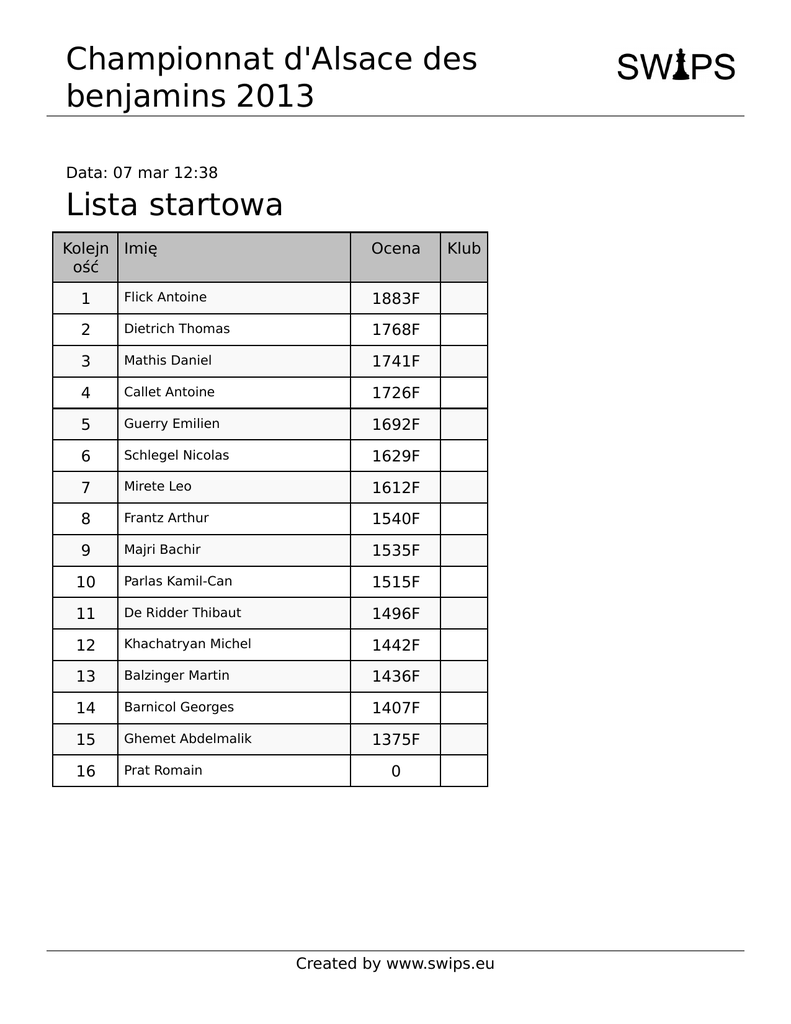 Championnat d'Alsace des benjamins 2013 Data: 07 mar 12:38 Lista startowa Kolejn Imię ość Ocena 1 Flick Antoine 1883F 2 Dietrich Thomas 1768F 3 Mathis Daniel 1741F 4 Callet Antoine 1726F 5 Guerry Emilien 1692F 6 Schlegel Nicolas 1629F 7 Mirete Leo 1612F 8 Frantz Arthur 1540F 9 Majri Bachir 1535F 10 Parlas Kamil-Can 1515F 11 De Ridder Thibaut 1496F 12 Khachatryan Michel 1442F 13 Balzinger Martin 1436F 14 Barnicol Georges 1407F 15 Ghemet Abdelmalik 1375F 16 Prat Romain Klub 0 Created by www.swips.eu