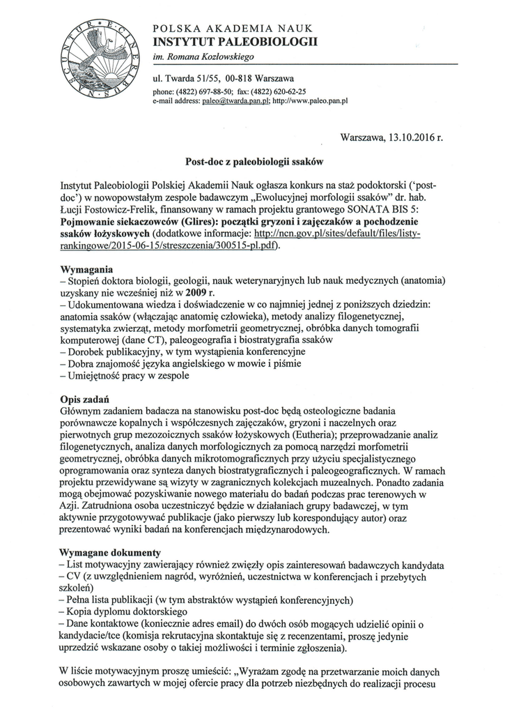 POLSKA AKADEMIA NAUK INSTYTUT PALEOBIOLOGII im. Romana Kozlowskiego ul. Twarda 51155, 00-818 Warszawa phone: (4822) 697-88-50; fax: (4822) 620-62-25 e-mail address: [email protected]; http://www.paleo.pan.pl Warszawa, 13.10.2016 r. Post-doc z paleobiologii ssakow Instytut Paleobiologii Polskiej Akademii Nauk oglasza konkurs na staZ podoktorski ('postdoc') w nowopowstalym zespole badawczym ,Ewolucyjnej morfologii ssak6w" dr. hab. Lucji Fostowicz-Frelik, finansowany w ramach projektu grantowego SONATA BIS 5: Pojmowanie siekaczowcow (Glires): pocz~tki gryzoni i zaj~czakow a pochodzenie ssakow lofyskowych (dodatkowe informacje: http://ncn.gov.pl/sites/default/files/listyrankingowe/20 15-06-15/streszczenia/300515-pl.pdf). Wymagania - Stopien doktora biologii, geologii, nauk weterynaryjnych lub nauk medycznych (anatomia) uzyskany nie wczesniej nii: w 2009 r. - Udokumentowana wiedza i doswiadczenie w co najmniej jednej z ponii:szych dziedzin: anatomia ssak6w (wlq_czajq_c anatomi~ czlowieka), metody analizy filogenetycznej, systematyka zwierzq_t, metody morfometrii geometrycznej, obr6bka danych tomografii komputerowej (dane CT), paleogeografia i biostratygrafia ssak6w - Dorobek publikacyjny, w tym wystcwienia konferencyjne -Dobra znajomos6 j~zyka angielskiego w mowie i pismie - Umiej~tnos6 pracy w zespole Opis zadan Gl6wnym zadaniem badacza na stanowisku post-doc b~dq_ osteologiczne badania por6wnawcze kopalnych i wsp6lczesnych zaj~czak6w, gryzoni i naczelnych oraz pierwotnych grup mezozoicznych ssak6w loi:yskowych (Eutheria); przeprowadzanie analiz filogenetycznych, analiza danych morfologicznych za pomocq_ narz~dzi morfometrii geometrycznej, obr6bka danych mikrotomograficznych przy ui:yciu specjalistycznego oprogramowania oraz synteza danych biostratygraficznych i paleogeograficznych. W ramach projektu przewidywane sq_ wizyty w zagranicznych kolekcjach muzealnych. Ponadto zadania mogq_ obejmowa6 pozyskiwanie nowego materialu do badan podczas prac terenowych w Azji. Zatrudniona osoba uczestniczy6 b~dzie w dzialaniach grupy badawczej, w tym aktywnie przygotowywa6 publikacje Gako pierwszy lub korespondujq_cy autor) oraz prezentowa6 wyniki badan na konferencjach mi~dzynarodowych. Wymagane dokumenty -List motywacyjny zawierajq_cy r6wniei: zwi~zly opis zainteresowan badawczych kandydata - CV (z uwzgl~dnieniem nagr6d, wyr6i:nien, uczestnictwa w konferencjach i przebytych szkolen) - Pelna lista publikacji (w tym abstrakt6w wystcwien konferencyjnych) - Kopia dyplomu doktorskiego - Dane kontaktowe (koniecznie adres email) do dw6ch os6b mogq_cych udzieli6 opinii o kandydacie/tce (komisja rekrutacyjna skontaktuje si~ z recenzentami, prosz~ jedynie uprzedzi6 wskazane osoby o takiej moi:liwosci i terminie zgloszenia). W liscie motywacyjnym prosz~ umiesci6: ,WyrC1Zam zgod~ na przetwarzanie moich danych osobowych zawartych w mojej ofercie pracy dla potrzeb niezb~dnych do realizacji procesu rekrutacji" (zgodnie z Ustawq o ochronie danych osobowych, Dz. U. 1997 Nr 133, poz. 883, z p6zn. zm.). Termin skladania dokument6w: 23 listopada 2016 godz. 23:59. Forma skladania dokument6w: Dokumenty w formie pojedynczego pliku pdf (nie przekraczaj'lcego 10 MB) nalezy przeslac drog'l elektroniczn'l do dr hab. Lucji FostowiczFrelik ([email protected]) z kopi'lna [email protected] Otrzymanie dokument6w zostanie potwierdzone drog'l elektroniczn'l przez odbiorc~. Warunki zatrudnienia Zatrudnienie na pelny etat na 1 rok z mozliwosci'lprzedluzenia na kolejny rok po pozytywnej ocenie. Przewidywany termin rozpocz~cia pracy: marzec 2017. Dodatkowych informacji udziela dr hab. Lucja Fostowicz-Frelik ([email protected]) lub dr hab. Andrzej Kaim ([email protected]; tel. 22 6978881). DYREKTOR lnstytutv Paleo iologii PAN "--..-/ .e,;...-.- F/--<-""-- ~(. dr hob. Jerzy Dzlk