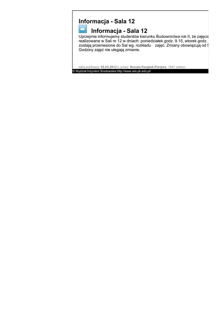 Informacja - Sala 12 Informacja - Sala 12 Uprzejmie informujemy studentów kierunku Budownictwa rok II, że zajęcia, które realizowane w Sali nr 12 w dniach: poniedziałek godz. 9.15, wtorek godz. 9.15, p zostają przeniesione do Sal wg. rozkładu zajęć. Zmiany obowiązują od 5 marc Godziny zajęć nie ulegają zmianie. data publikacji: 05.03.2012 r. przez: Renata Książek-Partyka, 1947 odsłon © Wydział Inżynierii Środowiska http://www.wis.pk.edu.pl/