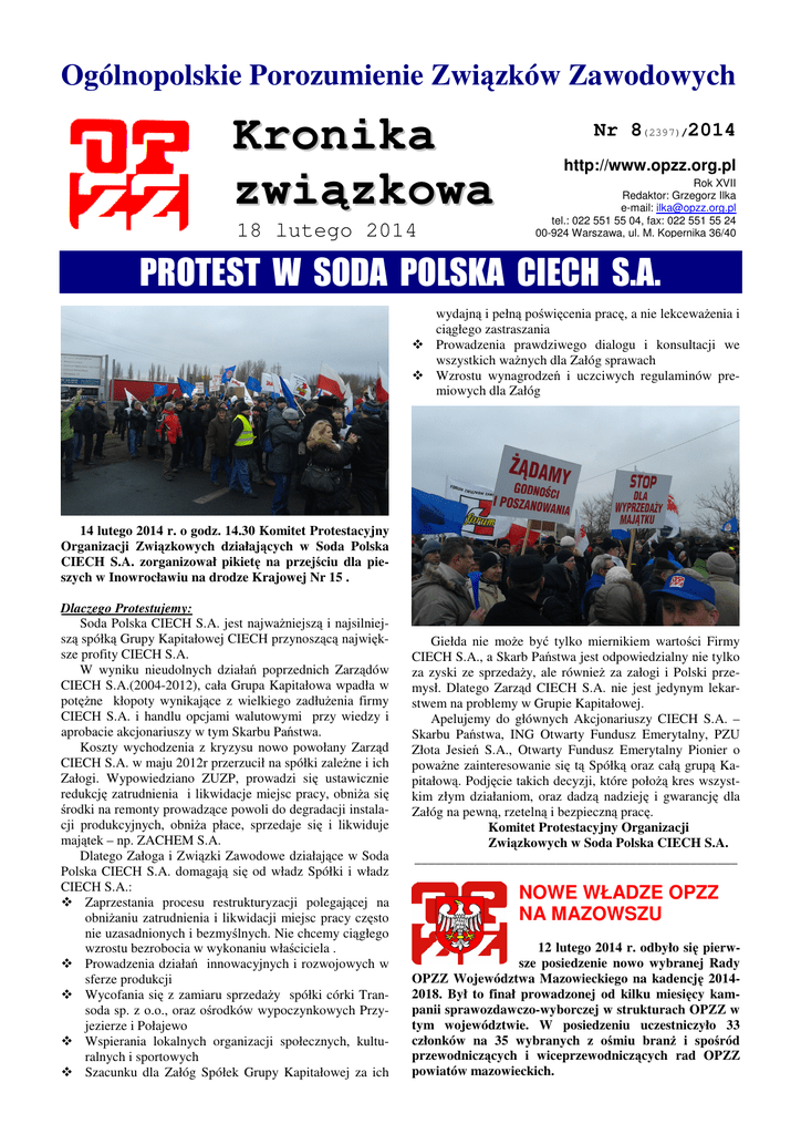Ogólnopolskie Porozumienie Związków Zawodowych Kronika związkowa 18 lutego 2014 Nr 8(2397)/2014 http://www.opzz.org.pl Rok XVII Redaktor: Grzegorz Ilka e-mail: [email protected] tel.: 022 551 55 04, fax: 022 551 55 24 00-924 Warszawa, ul. M. Kopernika 36/40 PROTEST W SODA POLSKA CIECH S.A. wydajną i pełną poświęcenia pracę, a nie lekceważenia i ciągłego zastraszania Prowadzenia prawdziwego dialogu i konsultacji we wszystkich ważnych dla Załóg sprawach Wzrostu wynagrodzeń i uczciwych regulaminów premiowych dla Załóg 14 lutego 2014 r. o godz. 14.30 Komitet Protestacyjny Organizacji Związkowych działających w Soda Polska CIECH S.A. zorganizował pikietę na przejściu dla pieszych w Inowrocławiu na drodze Krajowej Nr 15 . Dlaczego Protestujemy: Soda Polska CIECH S.A. jest najważniejszą i najsilniejszą spółką Grupy Kapitałowej CIECH przynoszącą największe profity CIECH S.A. W wyniku nieudolnych działań poprzednich Zarządów CIECH S.A.(2004-2012), cała Grupa Kapitałowa wpadła w potężne kłopoty wynikające z wielkiego zadłużenia firmy CIECH S.A. i handlu opcjami walutowymi przy wiedzy i aprobacie akcjonariuszy w tym Skarbu Państwa. Koszty wychodzenia z kryzysu nowo powołany Zarząd CIECH S.A. w maju 2012r przerzucił na spółki zależne i ich Załogi. Wypowiedziano ZUZP, prowadzi się ustawicznie redukcję zatrudnienia i likwidacje miejsc pracy, obniża się środki na remonty prowadzące powoli do degradacji instalacji produkcyjnych, obniża płace, sprzedaje się i likwiduje majątek – np. ZACHEM S.A. Dlatego Załoga i Związki Zawodowe działające w Soda Polska CIECH S.A. domagają się od władz Spółki i władz CIECH S.A.: Zaprzestania procesu restrukturyzacji polegającej na obniżaniu zatrudnienia i likwidacji miejsc pracy często nie uzasadnionych i bezmyślnych. Nie chcemy ciągłego wzrostu bezrobocia w wykonaniu właściciela . Prowadzenia działań innowacyjnych i rozwojowych w sferze produkcji Wycofania się z zamiaru sprzedaży spółki córki Transoda sp. z o.o., oraz ośrodków wypoczynkowych Przyjezierze i Połajewo Wspierania lokalnych organizacji społecznych, kulturalnych i sportowych Szacunku dla Załóg Spółek Grupy Kapitałowej za ich Giełda nie może być tylko miernikiem wartości Firmy CIECH S.A., a Skarb Państwa jest odpowiedzialny nie tylko za zyski ze sprzedaży, ale również za załogi i Polski przemysł. Dlatego Zarząd CIECH S.A. nie jest jedynym lekarstwem na problemy w Grupie Kapitałowej. Apelujemy do głównych Akcjonariuszy CIECH S.A. – Skarbu Państwa, ING Otwarty Fundusz Emerytalny, PZU Złota Jesień S.A., Otwarty Fundusz Emerytalny Pionier o poważne zainteresowanie się tą Spółką oraz całą grupą Kapitałową. Podjęcie takich decyzji, które położą kres wszystkim złym działaniom, oraz dadzą nadzieję i gwarancję dla Załóg na pewną, rzetelną i bezpieczną pracę. Komitet Protestacyjny Organizacji Związkowych w Soda Polska CIECH S.A. ________________________________________________ NOWE WŁADZE OPZZ NA MAZOWSZU 12 lutego 2014 r. odbyło się pierwsze posiedzenie nowo wybranej Rady OPZZ Województwa Mazowieckiego na kadencję 20142018. Był to finał prowadzonej od kilku miesięcy kampanii sprawozdawczo-wyborczej w strukturach OPZZ w tym województwie. W posiedzeniu uczestniczyło 33 członków na 35 wybranych z ośmiu branż i spośród przewodniczących i wiceprzewodniczących rad OPZZ powiatów mazowieckich. Kronika związkowa nr 8(2397)/2014 – strona 2 Posiedzenie otworzył przewodniczący Rady OPZZ województwa mazowieckiego Jerzy Wiśniewski. Na posiedzeniu uczestniczyli zaproszeni goście: Wiesława Taranowska – wiceprzewodnicząca OPZZ, Franciszek Bobrowski – wiceprzewodniczący OPZZ, którzy przedstawili i omówili bieżące działania OPZZ oraz Jarosław Czarnowski – przewodniczący Komisji Rewizyjnej OPZZ. Przewodnictwo obrad objęła Urszula Woźniak – prezes Zarządu Oddziału ZNP Warszawa Mokotów. Nowe władze W trakcie posiedzenia dokonano wyboru władzy Rady OPZZ województwa mazowieckiego. Na przewodniczącego Rady na kadencję 2014-2018 w wyborach tajnych ponownie wybrano Jerzego Wiśniewskiego (Oddział Zarządu ZNP Warszawa Śródmieście). Wiceprzewodniczącymi zostali: Tomasz Korczak (ZNP Oddział Radom), Michał Lewandowski (OPZZ Konfederacja Pracy), Krzysztof Ozdarski (OPZZ Konfederacja Pracy), Marzena Pyszczek (ZZ Pracowników ZUS Oddziałowa Organizacja Związkowa w Radomiu), Urszula Woźniak (ZNP Oddział Zarządu Warszawa Mokotów). Ponadto do Prezydium Rady zostali wybrani: Zenon Stolarski (Międzyzakładowy Związek Zawodowy Pracowników Energetyki w ENEA Wytwarzanie S.A.), Lech Latarski (ZZ Pracowników „Metalowcy” przy CNH Polska Sp. z o.o., Płock), Maciej Wójcik (ZNP Oddział Zarządu Wyszków), Maria Jolanta Janiszewska (ZZ Pracowników Ochrony Zdrowia Szpitala im. Marcina Kasprzaka w Płocku), Jan Kaczmarski (ZZ Pracowników Przemysłu Tytoniowego w Radomiu), Mirosław Mizerski (ZZ Pracowników Spółdzielni Mieszkaniowej „Ustronie” w Radomiu), Krzysztof Tomaszewski (ZZ Pracowników Komunikacji Miejskiej w Warszawie), Robert Zieliński (ZZ Pracowników Portu Lotniczego Warszawa Okęcie), Halina Poszytek (ZNP Zarząd Oddziału Garwolin). Rada przyjęła zakres programowy na kadencję 20142018. Główne problemy to: rynek pracy, prawo pracy, dialog społeczny, warunki pracy, wybory samorządowe, pozyskiwanie środków z funduszy unijnych. W sprawach organizacyjnych: szkolenia, wspieranie zakładowych organizacji związkowych, pozyskiwanie młodych działaczy, pomoc prawna. J.D. ________________________________________________ WYBORY W RADZIE POWIATOWEJ W KOZIENICACH 18 lutego 2014 r. Rada Powiatowa OPZZ rozpoczęła nową kadencję w Kozienicach. Do składu Rady weszli: Dariusz Krekora i Marcin Kujawiak z Międzyzakładowego Związku Zawodowego Energetyków w ENEA Wytwarzanie S.A. oraz Dorota Kurzawa i Wiesława Ku- charska z