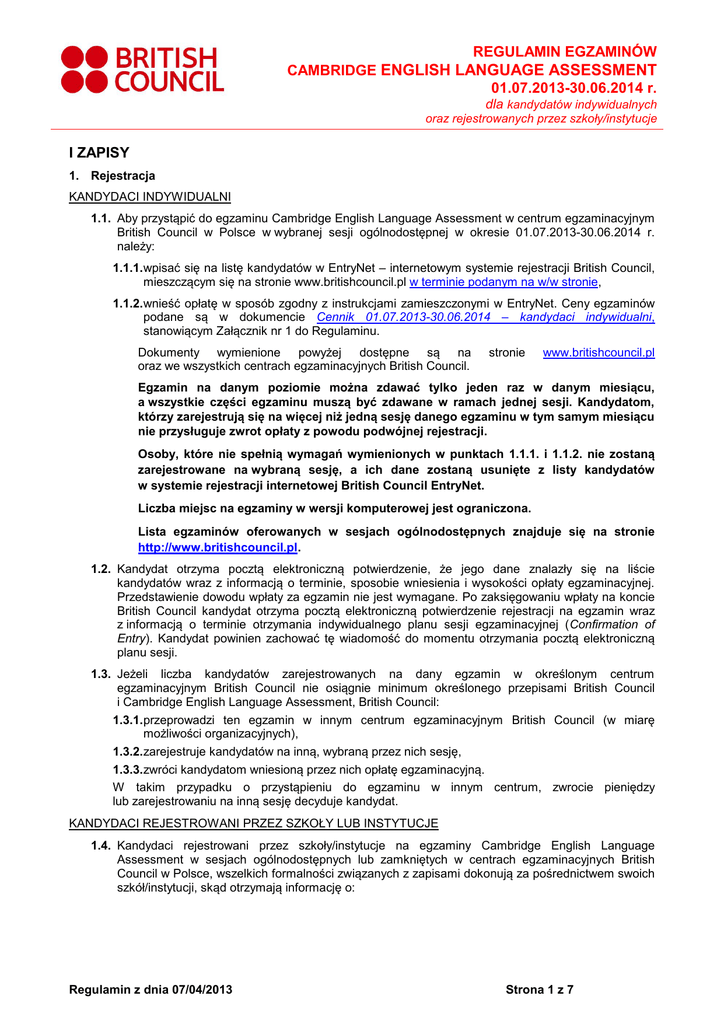 REGULAMIN EGZAMINÓW CAMBRIDGE ENGLISH LANGUAGE ASSESSMENT 01.07.2013-30.06.2014 r. dla kandydatów indywidualnych oraz rejestrowanych przez szkoły/instytucje I ZAPISY 1. Rejestracja KANDYDACI INDYWIDUALNI 1.1. Aby przystąpić do egzaminu Cambridge English Language Assessment w centrum egzaminacyjnym British Council w Polsce w wybranej sesji ogólnodostępnej w okresie 01.07.2013-30.06.2014 r. należy: 1.1.1. wpisać się na listę kandydatów w EntryNet – internetowym systemie rejestracji British Council, mieszczącym się na stronie www.britishcouncil.pl w terminie podanym na w/w stronie, 1.1.2. wnieść opłatę w sposób zgodny z instrukcjami zamieszczonymi w EntryNet. Ceny egzaminów podane są w dokumencie Cennik 01.07.2013-30.06.2014 – kandydaci indywidualni, stanowiącym Załącznik nr 1 do Regulaminu. Dokumenty wymienione powyżej dostępne są na oraz we wszystkich centrach egzaminacyjnych British Council. stronie www.britishcouncil.pl Egzamin na danym poziomie można zdawać tylko jeden raz w danym miesiącu, a wszystkie części egzaminu muszą być zdawane w ramach jednej sesji. Kandydatom, którzy zarejestrują się na więcej niż jedną sesję danego egzaminu w tym samym miesiącu nie przysługuje zwrot opłaty z powodu podwójnej rejestracji. Osoby, które nie spełnią wymagań wymienionych w punktach 1.1.1. i 1.1.2. nie zostaną zarejestrowane na wybraną sesję, a ich dane zostaną usunięte z listy kandydatów w systemie rejestracji internetowej British Council EntryNet. Liczba miejsc na egzaminy w wersji komputerowej jest ograniczona. Lista egzaminów oferowanych w sesjach ogólnodostępnych znajduje się na stronie http://www.britishcouncil.pl. 1.2. Kandydat otrzyma pocztą elektroniczną potwierdzenie, że jego dane znalazły się na liście kandydatów wraz z informacją o terminie, sposobie wniesienia i wysokości opłaty egzaminacyjnej. Przedstawienie dowodu wpłaty za egzamin nie jest wymagane. Po zaksięgowaniu wpłaty na koncie British Council kandydat otrzyma pocztą elektroniczną potwierdzenie rejestracji na egzamin wraz z informacją o terminie otrzymania indywidualnego planu sesji egzaminacyjnej (Confirmation of Entry). Kandydat powinien zachować tę wiadomość do momentu otrzymania pocztą elektroniczną planu sesji. 1.3. Jeżeli liczba kandydatów zarejestrowanych na dany egzamin w określonym centrum egzaminacyjnym British Council nie osiągnie minimum określonego przepisami British Council i Cambridge English Language Assessment, British Council: 1.3.1. przeprowadzi ten egzamin w innym centrum egzaminacyjnym British Council (w miarę możliwości organizacyjnych), 1.3.2. zarejestruje kandydatów na inną, wybraną przez nich sesję, 1.3.3. zwróci kandydatom wniesioną przez nich opłatę egzaminacyjną. W takim przypadku o przystąpieniu do egzaminu w innym centrum, zwrocie pieniędzy lub zarejestrowaniu na inną sesję decyduje kandydat. KANDYDACI REJESTROWANI PRZEZ SZKOŁY LUB INSTYTUCJE 1.4. Kandydaci rejestrowani przez szkoły/instytucje na egzaminy Cambridge English Language Assessment w sesjach ogólnodostępnych lub zamkniętych w centrach egzaminacyjnych British Council w Polsce, wszelkich formalności związanych z zapisami dokonują za pośrednictwem swoich szkół/instytucji, skąd otrzymają informację o: Regulamin z dnia 07/04/2013 Strona 1 z 7 REGULAMIN EGZAMINÓW CAMBRIDGE ENGLISH LANGUAGE ASSESSMENT 01.07.2013-30.06.2014 r. dla kandydatów indywidualnych oraz rejestrowanych przez szkoły/instytucje egzaminach brytyjskich oferowanych przez British Council, terminach rejestracji, wysokości i sposobie wnoszenia opłaty, szczegółowym planie sesji egzaminacyjnej (Confirmation of Entry). 1.5. Chęć zdawania egzaminu należy zgłosić osobie odpowiedzialnej za organizację egzaminów Cambridge English w szkole/instytucji rejestrującej grupę kandydatów w terminie podanym przez szkołę/instytucję. 1.6. Na egzaminy w wersji komputerowej można rejestrować się wyłącznie indywidualnie poprzez system EntryNet mieszczący się na stronie www.britishcouncil.pl 2. Opłaty egzaminacyjne Ceny egzaminów podane są w Załączniku nr 1 Cennik 01.07.2013-30.06.2014 – kandydaci indywidualni dostępnym na stronie www.britishcouncil.pl oraz we wszystkich centrach egzaminacyjnych British Council. II SZCZEGÓLNE UDOGODNIENIA British Council zapewnia równe szanse wszystkim zdającym, również osobom wymagającym specjalnych udogodnień. Kandydaci mogą je uzyskać przystępując do egzaminów Cambridge English w wersji papierowej, na zasadach wymienionych poniżej. Z przyczyn technicznych nie oferujemy szczególnych udogodnień na egzaminach w wersji komputerowej. 1. Osoby niepełnosprawne Osoby wymagające szczególnych udogodnień (np. niedowidzące, niedosłyszące) powinny zgłosić ten fakt w trakcie wpisywania się do systemu EntryNet lub na grupową listę kandydatów (Block Entry Form), jeżeli zapisują się przez szkołę/instytucję. Wymagane dokumenty z tym związane – zaświadczenie lekarskie oraz wypełniony i podpisany formularz - powinny być złożone w centrum egzaminacyjnym British Council najpóźniej w ostatnim dniu rejestracji lub dostarczone przedstawicielowi szkoły/instytucji przed złożeniem przez niego dokumentów rejestracyjnych w centrum egzaminacyjnym British Council. Instytucja zgłaszająca na egzamin grupę osób niepełnosprawnych powinna skontaktować się z centrum egzaminacyjnym dwa miesiące przed upływem terminu rejestracji na wybraną sesję w celu uzgodnienia szczegółów organizacji egzaminu. Zgłoszenie zapotrzebowania na szczególne udogodnienia dla niepełnosprawnych kandydatów w późniejszym terminie może skutkować niemożnością przeprowadzenia sesji w wybranym terminie lub brakiem możliwości zapewnienia odpowiednich warunków na egzaminie. 2. Osoby z dysleksją, dysgrafią lub dysortografią Osoby, które chcą ubiegać się o wydłużenie czasu egzaminów pisemnych z powod