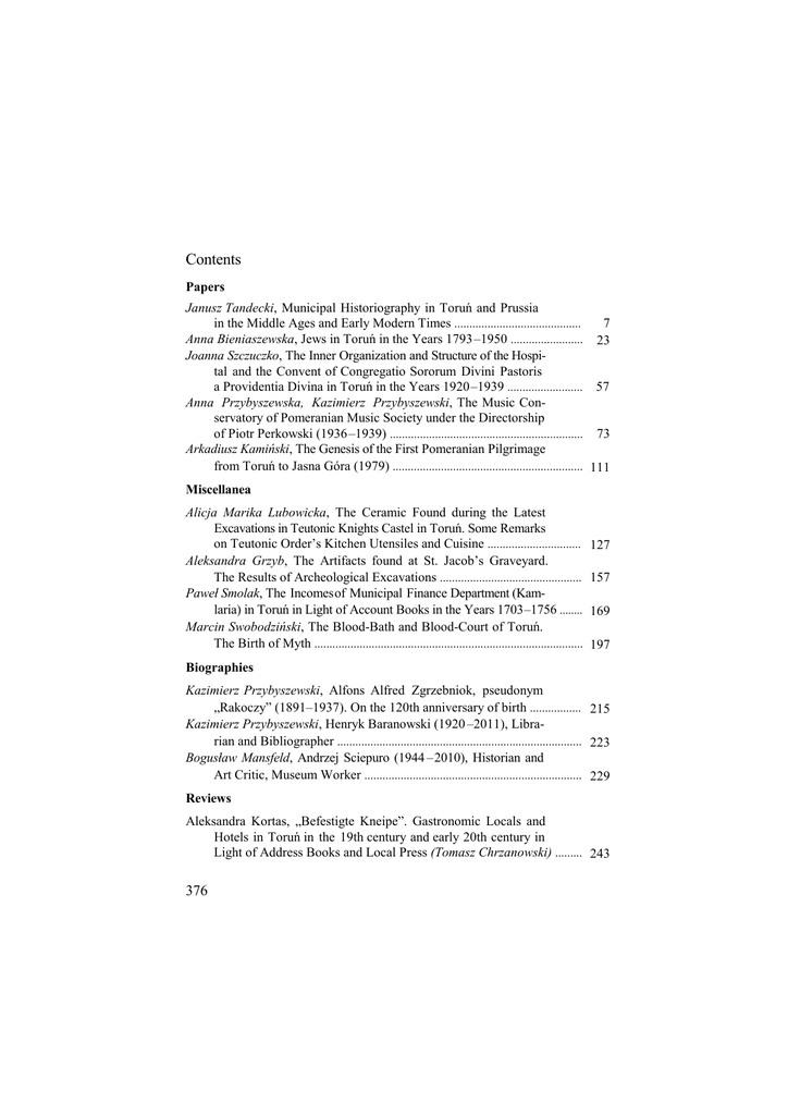 Contents Papers Janusz Tandecki, Municipal Historiography in Toruń and Prussia in the Middle Ages and Early Modern Times .......................................... 7 Anna Bieniaszewska, Jews in Toruń in the Years 1793 –1950 ........................ 23 Joanna Szczuczko, The Inner Organization and Structure of the Hospital and the Convent of Congregatio Sororum Divini Pastoris a Providentia Divina in Toruń in the Years 1920 –1939 ......................... 57 Anna Przybyszewska, Kazimierz Przybyszewski, The Music Conservatory of Pomeranian Music Society under the Directorship of Piotr Perkowski (1936 –1939) ................................................................ 73 Arkadiusz Kamiński, The Genesis of the First Pomeranian Pilgrimage from Toruń to Jasna Góra (1979) ............................................................... 111 Miscellanea Alicja Marika Lubowicka, The Ceramic Found during the Latest Excavations in Teutonic Knights Castel in Toruń. Some Remarks on Teutonic Order’s Kitchen Utensiles and Cuisine ............................... Aleksandra Grzyb, The Artifacts found at St. Jacob’s Graveyard. The Results of Archeological Excavations ............................................... Paweł Smolak, The Incomes of Municipal Finance Department (Kamlaria) in Toruń in Light of Account Books in the Years 1703 –1756 ........ Marcin Swobodziński, The Blood-Bath and Blood-Court of Toruń. The Birth of Myth ......................................................................................... 127 157 169 197 Biographies Kazimierz Przybyszewski, Alfons Alfred Zgrzebniok, pseudonym „Rakoczy” (1891–1937). On the 120th anniversary of birth ................. 215 Kazimierz Przybyszewski, Henryk Baranowski (1920 –2011), Librarian and Bibliographer ................................................................................. 223 Bogusław Mansfeld, Andrzej Sciepuro (1944 – 2010), Historian and Art Critic, Museum Worker ........................................................................ 229 Reviews Aleksandra Kortas, „Befestigte Kneipe”. Gastronomic Locals and Hotels in Toruń in the 19th century and early 20th century in Light of Address Books and Local Press (Tomasz Chrzanowski) ......... 243 376 Krzysztof Mastykarz, Free Time and Entertainment in Toruń, Chełmno, Grudziądz and Brodnica from the 14th to the 16th century (Cezary Kardasz) .................................................................................................... 246 St. Georg’s Graveyard, Military Graveyard, Jewish Graveyard, St. Jacob’s Graveyard (Wiesława DuŜy) ......................................................... 252 Piotr Kowalski, The Old Town Market and its Residents in the 19th century. The Socio-topographic Analysis (Agnieszka Zielińska) .......... 256 Notes by Anna Ziemlewska .................................................................................. 261 Reports Cecylia Iwaniszewska, The Activities of the Society of Toruń’s Lovers in the Period from 28th May 2010 to 23rd May 2011 .................... 267 Marlena Jabłońska, The 60. Anniversary of Archival Sciences in Toruń. The Inauguration .............................................................................. 277 *** Urszula Zaborska, A Bibliography of Toruń 2010 .......................................... 283 Inhaltsverzeichnis .................................................................................................. 377 Inhaltsverzeichnis Abhandlungen und Aufsätze Janusz Tandecki, Städtische Geschichtsschreibung in Thorn und Preußen im Spätmittelalter und in der Frühen Neuzeit ........................... 7 Anna Bieniaszewska, Die Juden in Thorn in den Jahren 1793 –1950 ............ 23 Joanna Szczuczko, Innere Organisation und Struktur des Krankenhauses und des Klosters von Congregatio Sororum Divini Pastoris a Providentia Divina in Thorn in den Jahren 1920 –1939 ...................... 57 Anna Przybyszewska, Kazimierz Przybyszewski, Das Konservatorium der Pommerschen Musikgesellschaft unter der Leitung von Piotr Perkowski (1936 –1939) .............................................................................. 73 Arkadiusz Kamiński, Die Genese von der ersten Pommerschen Pilgerfahrt von Thorn nach Tschenstochau (Heller Berg) (1979) ........ 111 Miscellanea Alicja Marika Lubowicka, Die Keramik, die in der Thorner Ordensburg in letzter Zeit gefunden worden. Anmerkungen über Küchengeschirr und Ordensküche ............................................................. 127 377 Aleksandra Grzyb, Die an dem St-Jakob-Friedhof gefundene Artefakte. Die Ergebnisse archäologischer Untersuchung ............................. 157 Paweł Smolak, Die Einnahme von Thorner Kämmerei im Lichte von Rechnungsbücher in den Jahren 1703–1756 ............................................ 169 Marcin Swobodziński, Das Thorner „Blutbad” und „Blutgericht”. Die Entstehung des Mythos ........................................................................ 197 Biographien Kazimierz Przybyszewski, Alfons Alfred Zgrzebniok, Pseudonym „Rakoczy” (1891–1937). Zum 120. Geburtstag ...................................... 215 Kazimierz Przybyszewski, Henryk Baranowski (1920 –2011), ein Bibliothekar und ein Bibliograf ..................................................................... 223 Bogusław Mansfeld, Andrzej Sciepuro (1944 – 2010), ein Historiker und ein Kunstkritiker, ein Museumsmitarbeiter ....................................... 229 Rezensionen Aleksandra Kortas, „Befestigte Kneipe”. Die Gastronomische Lokale und Hotels in Thorn im 19. Jh. und frühen 20 Jh. im Lichte von Adressbücher und Lokalpresse (Tomasz Chrzanowski) .................. Krzysztof Mastykarz, Die Freizeit und Belustigung in Thorn, Culm, Graudenz und Strasburg vom 14. bis zum 16. Jh. (Cezary Kardasz) ...... St.-Georgen-Friedhof, Militär Friedhof, Jüdische Friedhof, St.-JakobFriedhof (Wiesł