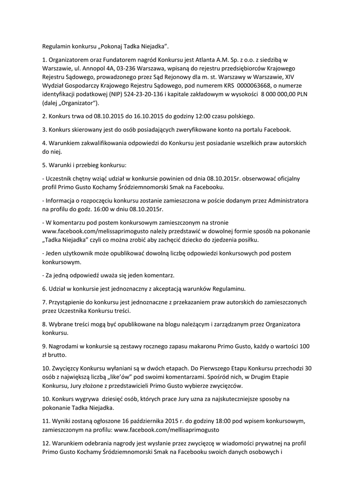 Regulamin konkursu „Pokonaj Tadka Niejadka”. 1. Organizatorem oraz Fundatorem nagród Konkursu jest Atlanta A.M. Sp. z o.o. z siedzibą w Warszawie, ul. Annopol 4A, 03-236 Warszawa, wpisaną do rejestru przedsiębiorców Krajowego Rejestru Sądowego, prowadzonego przez Sąd Rejonowy dla m. st. Warszawy w Warszawie, XIV Wydział Gospodarczy Krajowego Rejestru Sądowego, pod numerem KRS 0000063668, o numerze identyfikacji podatkowej (NIP) 524-23-20-136 i kapitale zakładowym w wysokości 8 000 000,00 PLN (dalej „Organizator“). 2. Konkurs trwa od 08.10.2015 do 16.10.2015 do godziny 12:00 czasu polskiego. 3. Konkurs skierowany jest do osób posiadających zweryfikowane konto na portalu Facebook. 4. Warunkiem zakwalifikowania odpowiedzi do Konkursu jest posiadanie wszelkich praw autorskich do niej. 5. Warunki i przebieg konkursu: - Uczestnik chętny wziąć udział w konkursie powinien od dnia 08.10.2015r. obserwować oficjalny profil Primo Gusto Kochamy Śródziemnomorski Smak na Facebooku. - Informacja o rozpoczęciu konkursu zostanie zamieszczona w poście dodanym przez Administratora na profilu do godz. 16:00 w dniu 08.10.2015r. - W komentarzu pod postem konkursowym zamieszczonym na stronie www.facebook.com/melissaprimogusto należy przedstawić w dowolnej formie sposób na pokonanie „Tadka Niejadka” czyli co można zrobić aby zachęcić dziecko do zjedzenia posiłku. - Jeden użytkownik może opublikować dowolną liczbę odpowiedzi konkursowych pod postem konkursowym. - Za jedną odpowiedź uważa się jeden komentarz. 6. Udział w konkursie jest jednoznaczny z akceptacją warunków Regulaminu. 7. Przystąpienie do konkursu jest jednoznaczne z przekazaniem praw autorskich do zamieszczonych przez Uczestnika Konkursu treści. 8. Wybrane treści mogą być opublikowane na blogu należącym i zarządzanym przez Organizatora konkursu. 9. Nagrodami w konkursie są zestawy rocznego zapasu makaronu Primo Gusto, każdy o wartości 100 zł brutto. 10. Zwycięzcy Konkursu wyłaniani są w dwóch etapach. Do Pierwszego Etapu Konkursu przechodzi 30 osób z największą liczbą „like’ów” pod swoimi komentarzami. Spośród nich, w Drugim Etapie Konkursu, Jury złożone z przedstawicieli Primo Gusto wybierze zwycięzców. 10. Konkurs wygrywa dziesięć osób, których prace Jury uzna za najskuteczniejsze sposoby na pokonanie Tadka Niejadka. 11. Wyniki zostaną ogłoszone 16 października 2015 r. do godziny 18:00 pod wpisem konkursowym, zamieszczonym na profilu: www.facebook.com/mellisaprimogusto 12. Warunkiem odebrania nagrody jest wysłanie przez zwycięzcę w wiadomości prywatnej na profil Primo Gusto Kochamy Śródziemnomorski Smak na Facebooku swoich danych osobowych i adresowych (w tym imię i nazwisko, adres do przesyłki, numer telefonu) do dnia 21.10.2015r. do godziny 10:00. 13. Nagrody zostaną wysłane do zwycięzców pocztą, w terminie do 14 dni roboczych od momentu otrzymania danych. 14. Udział w Konkursie jest całkowicie dobrowolny. Organizator oświadcza, iż dane osobowe zbierane i przetwarzane przez Organizatora, jako administratora danych osobowych, w związku z realizacją Konkursu, będą wykorzystywane wyłącznie w ramach i na potrzeby przeprowadzenia Konkursu (w szczególności wyłaniania zwycięzców oraz przyznawania i wysyłania nagród), zgodnie z ustawą z dnia 29 sierpnia 1997 r. o ochronie danych osobowych (Dz. U. z 2002 r. NR. 101,poz.926. z późn. zm.). 15. Uczestnik może zrzec się prawa do nagrody, jednakże nie może przenieść prawa do nagrody na osobę trzecią, bądź żądać zamiany nagrody na ekwiwalent pieniężny, ani na żadną inną formę rekompensaty. 16. Konkurs nie podlega przepisom Ustawy z dnia 29 lipca 1992 roku o grach i zakładach wzajemnych /Dz.U. z 2004 roku Nr 4, poz. 27 z późn. zm./ 17. Organizator w przypadku, gdy zaistnieje taki obowiązek zgodnie z art. 30 ust. 1 pkt 2 ustawy o podatku dochodowym od osób fizycznych z dnia 26 lipca 1991 roku (Dz. U. z 2000 r. Nr 14, poz. 176), przed wydaniem nagrody obliczy, pobierze i odprowadzi do właściwego Urzędu Skarbowego zryczałtowany podatek dochodowy w wysokości 11,11% wartości nagrody. 18. Organizator zastrzega sobie prawo do zmiany Regulaminu. 19. Informacja o zmianach zostanie opublikowana w taki sposób, w jaki był ogłaszany Regulamin. 20. Organizator nie ponosi odpowiedzialności za wpisanie przez uczestników Konkursu nieprawidłowych danych. 21. Organizatorowi przysługuje prawo wykluczenia ze skutkiem natychmiastowym uczestnika z udziału w Konkursie, jak również odmowy przyznania uczestnikowi nagrody w przypadku, gdy uczestnik podał nieprawdziwe lub niekompletne dane wymagane i niezbędne do przyznania nagrody, w przypadku niespełnienia postanowień Regulaminu, a także w przypadku powzięcia przez Organizatora informacji o działaniach uczestnika sprzecznych z postanowieniami Regulaminu. 22. Organizator zastrzega sobie prawo do nagłego odwołania/zamknięcia Konkursu. 23. Konkurs nie jest w żaden sposób sponsorowany, wspierany, administrowany ani bezpośrednio związany z serwisem społecznościowym Facebooka i jego właścicielem czy administratorem. Wszelkie pytania, komentarze oraz skargi i reklamacje związane z Konkursem powinny być kierowane do Organizatora,a w żadnym wypadku do właściciela czy administratora serwisu społecznościowego Facebook. Uczestnik zwalnia Facebook z odpowiedzialności za jakiekolwiek szkody poniesione w związku z Konkursem.