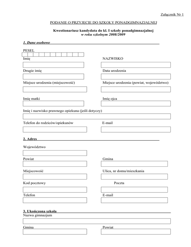 Załącznik Nr 1 PODANIE O PRZYJĘCIE DO SZKOŁY PONADGIMNAZJALNEJ Kwestionariusz kandydata do kl. I szkoły ponadgimnazjalnej w roku szkolnym 2008/2009 1. Dane osobowe PESEL Imię NAZWISKO Drugie imię Data urodzenia Miejsce urodzenia (miejscowość) Miejsce urodzenia (powiat, województwo) Imię matki Imię ojca Imię i nazwisko prawnego opiekuna (jeśli dotyczy) Telefon do rodziców/opiekunów E-mail 2. Adres Województwo Powiat Gmina Miejscowość Ulica, nr domu/mieszkania Kod pocztowy Telefon Poczta E-mail 3. Ukończona szkoła Nazwa gimnazjum Gmina Powiat 4. Kolejność wyboru szkoły lp Nazwa Zespołu Szkół Typ Szkoły (Liceum Ogólnokształcące, Liceum Profilowane, Liceum Plastyczne, Technikum, Zasadnicza Szkoła Zawodowa) 1. Przedmioty wiodące – profil - zawód Język obcy (kontynuacja z gimnazjum) 1. 2. 3. 4. 5. 6. 1. 2. 3. 4. 5. 6. 1. 2. 3. 4. 5. 6. 2. 3. Do podania załączam: 1. zaświadczenie lekarskie o braku przeciwwskazań do kształcenia w określonym zawodzie w przypadku ubiegania się o przyjęcie do szkoły prowadzącej kształcenie zawodowe, 2. zaświadczenie lekarskie o bardzo dobrym stanie zdrowia wydane przez lekarza specjalistę w dziedzinie medycyny sportowej oraz zgoda rodziców/opiekunów prawnych w przypadku kandydatów do IV LO w Zespole Szkół Ponadgimnazjalnych Nr 4 Wyrażam zgodę na przetwarzanie moich danych osobowych zawartych w podaniu dla potrzeb niezbędnych do przeprowadzenia rekrutacji (zgodnie z ustawą z dnia 29 sierpnia 1997 r. O ochronie danych osobowych Dz. U. z 2002 r. Nr 101, poz. 926) ___________________________________ Podpis rodziców/opiekunów prawnych _________________________ Podpis kandydata Miejscowość ________________________, dnia ______________________ Załącznik 2 ............................................................ ........................................................... (pieczęć szkoły ponadgimnazjalnej) (pieczęć gimnazjum) KARTA INFORMACYJNA POTWIERDZENIE PRZYJĘCIA UCZNIA DO SZKOŁY PONADGIMNAZJALNEJ Informuję, że ................................................................................................................................... (imię i nazwisko ucznia) Urodzony(a) ............................................ ... w ............................................................................... (dzień-miesiąc-rok) (miejscowość) Imiona Rodziców ...................................................................................................................... Adres zamieszkania ....................................................................................................................... (kod-miejscowość-ulica-nr-domu-nr mieszkania) Gmina ............................................................... Został(a) przyjęty(a) na rok szkolny 2008/2009 do klasy pierwszej ......................................... (typ szkoły ponadgimnazjalnej) w ................................................................................................................................................... (nazwa zespołu, miejscowość) .......................................................... (miejscowość, data) ......................................................................... (podpis i pieczęć dyrektora szkoły ponadgimnazjalnej) Pouczenie: 1. 2. 3. 4. Potwierdzenie przyjęcia ucznia objętego obowiązkiem nauki do szkoły ponadgimnazjalnej służy kontroli obowiązku nauki, o którym mowa w art. 19 ust. 1 ustawy z dnia 7 września 1991 r. o systemie oświaty (Dz. U. z 2004 r. Nr 256, poz. 2572 z późn. zm.). Dane osobowe ucznia (imię i nazwisko, datę i miejsce urodzenia, adres zamieszkania) oraz adres Urzędu Gminy właściwy ze względu na miejsce zamieszkania ucznia wypełnia wychowawca lub inny upoważniony pracownik gimnazjum. Uczeń składa „Kartę informacyjną” w jednym egzemplarzu, razem z oryginałem świadectwa ukończenia gimnazjum i oryginałem zaświadczenia o wyniku egzaminu gimnazjalnego w tej szkole, w której potwierdził wolę podjęcia nauki. W terminie do 15 września 2008 r. szkoła ponadgimnazjalna przekazuje potwierdzenie przyjęcia ucznia do Urzędu Gminy właściwego ze względu na miejsce zamieszkania ucznia, co stanowi wypełnienie przepisu § 3 ust. 4 rozporządzenia MENiS z dnia 19 lutego 2002 r. w sprawie sposobu prowadzenia przez publiczne przedszkola, szkoły i placówki dokumentacji przebiegu nauczania, działalności wychowawczej i opiekuńczej oraz rodzajów tej dokumentacji (Dz. U. Nr 23, poz. 225; z 2003 r. Nr 107 poz. 1003). Adres Urzędu Gminy właściwy ze względu na miejsce zamieszkania ucznia: Urząd* ……………….……........ w ul. kod pocztowy, miejscowość (*) Gminy, Miasta, Miasta i Gminy Załącznik nr 3 ------------------------------------------Nazwisko i imię kandydata Malbork, dnia ........................................... ------------------------------------------Adres ------------------------------------------Ukończone Gimnazjum Nr ............. Miejscowość ................................... Oświadczenie Na podstawie §9 ust.3 i rozporządzenia MENiS z dnia 20 lutego 2004 r. w sprawie warunków i trybu przyjmowania uczniów do szkół publicznych oraz przechodzenia z jednych typów szkół do innych (Dz. U. Nr 26, poz.232) potwierdzam wolę podjęcia nauki w ............................................................................................................................................... wpisać szkołę (np. Liceum Ogólnokształcące, Liceum Profilowane, Liceum Plastyczne, Technikum, Zasadnicza Szkoła Zawodowa) a) * w klasie realizującej następujące przedmioty w zakresie rozszerzonym ............................ .................................................................................................................................................. b) ** w klasie o profilu ..............................................................................................