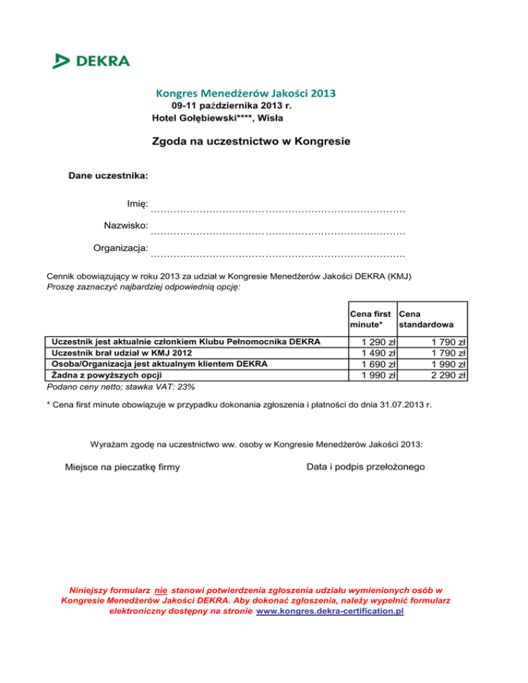 09-11 października 2013 Hotel Gołębiewski**** - Wisła Kongres Menedżerów Jakości 2013 09-11 października 2013 r. Hotel Gołębiewski****, Wisła Zgoda na uczestnictwo w Kongresie Dane uczestnika: Imię: ……………………………………. ……………………………………. Nazwisko: ……………………………………. ……………………………………. Organizacja: ……………………………………. ……………………………………. Cennik obowiązujący w roku 2013 za udział w Kongresie MenedŜerów Jakości DEKRA (KMJ) Proszę zaznaczyć najbardziej odpowiednią opcję: Cena first Cena minute* standardowa Uczestnik jest aktualnie członkiem Klubu Pełnomocnika DEKRA Uczestnik brał udział w KMJ 2012 Osoba/Organizacja jest aktualnym klientem DEKRA śadna z powyŜszych opcji Podano ceny netto; stawka VAT: 23% 1 290 zł 1 490 zł 1 690 zł 1 990 zł 1 790 zł 1 790 zł 1 990 zł 2 290 zł * Cena first minute obowiązuje w przypadku dokonania zgłoszenia i płatności do dnia 31.07.2013 r. WyraŜam zgodę na uczestnictwo ww. osoby w Kongresie MenedŜerów Jakości 2013: Miejsce na pieczatkę firmy Data i podpis przełoŜonego Niniejszy formularz nie stanowi potwierdzenia zgłoszenia udziału wymienionych osób w Kongresie MenedŜerów Jakości DEKRA. Aby dokonać zgłoszenia, naleŜy wypełnić formularz elektroniczny dostępny na stronie www.kongres.dekra-certification.pl Kongres Menedżerów Jakości 2013 – Harmonogram 09-11 października 2013 Hotel Gołębiewski****, Wisła 09.10.2013 r. godz. 14:00 15:00 16:15 16:30 18:00 21:00 Temat Zameldowanie w hotelu. Obiad. Rejestracja na KMJ. Rewolucja! Kierunki zmian w rozwoju norm ISO 9001:2015 i ISO 14001:2015. (Leszek Krawczyk) Przerwa kawowa Komunikacja perswazyjna i obrona przed manipulacjami, czyli jak efektywnie wykorzystywać techniki wpływu społecznego. (Aleksander Binsztok) Czas wolny Kolacja 10.10.2013 r. godz. 07:00 Temat Śniadanie WARSZTATY wg GRUP BRANśOWYCH BranŜa Produkcyjna BranŜa Handel/Usługi BranŜa Medyczna Komunikacja perswazyjna i Świadome zarządzanie Jakość w SłuŜbie Zdrowia. obrona przed manipulacjami, energią. Recepta na kryzys Europejski standard jakości EN czyli jak efektywnie - opcja na Rozwój... (Anna 15224 w praktyce. (Arletta 10:00 wykorzystywać techniki wpływu Rybaczuk) Peplińska) społecznego. (Aleksander Binsztok) 11:30 Przerwa kawowa Optymalizacja procesu Komunikacja Świadome zarządzanie energią. biznesowego - od poziomu meta perswazyjna i obrona Recepta na kryzys - opcja na przed manipulacjami, czyli Rozwój... (Anna Rybaczuk) do operacyjnego. (Tomasz 11:45 Jasiukiewicz) jak efektywnie wykorzystywać techniki wpływu społecznego. (Aleksander Binsztok) 13:30 Obiad Świadome zarządzanie Optymalizacja procesu Komunikacja perswazyjna i energią. Recepta na kryzys biznesowego - od poziomu obrona przed manipulacjami, 14:30 opcja na Rozwój... (Anna meta do operacyjnego. czyli jak efektywnie wykorzystywać Rybaczuk) (Tomasz Jasiukiewicz) techniki wpływu społecznego. (Aleksander Binsztok) 16:00 Czas wolny 16:15 Auditor Wewnętrzny Systemu Zarządzania Środowiskowego – egzamin (dla chętnych*) 20:00 Kolacja *Szczegóły: www.kongres.dekra-certification.pl 11.10.2013 r. godz. Temat 07:00 Śniadanie Pełnomocnik Zarządu ds. Zarządzania Energią – egzamin (dla chętnych*) 09:00 Tajemnicza DEKRA...? (Aleksandra Wilk, Aleksandra ŚliŜewska) 10:30 do 12:00 Wymeldowanie z hotelu *Szczegóły: www.kongres.dekra-certification.pl