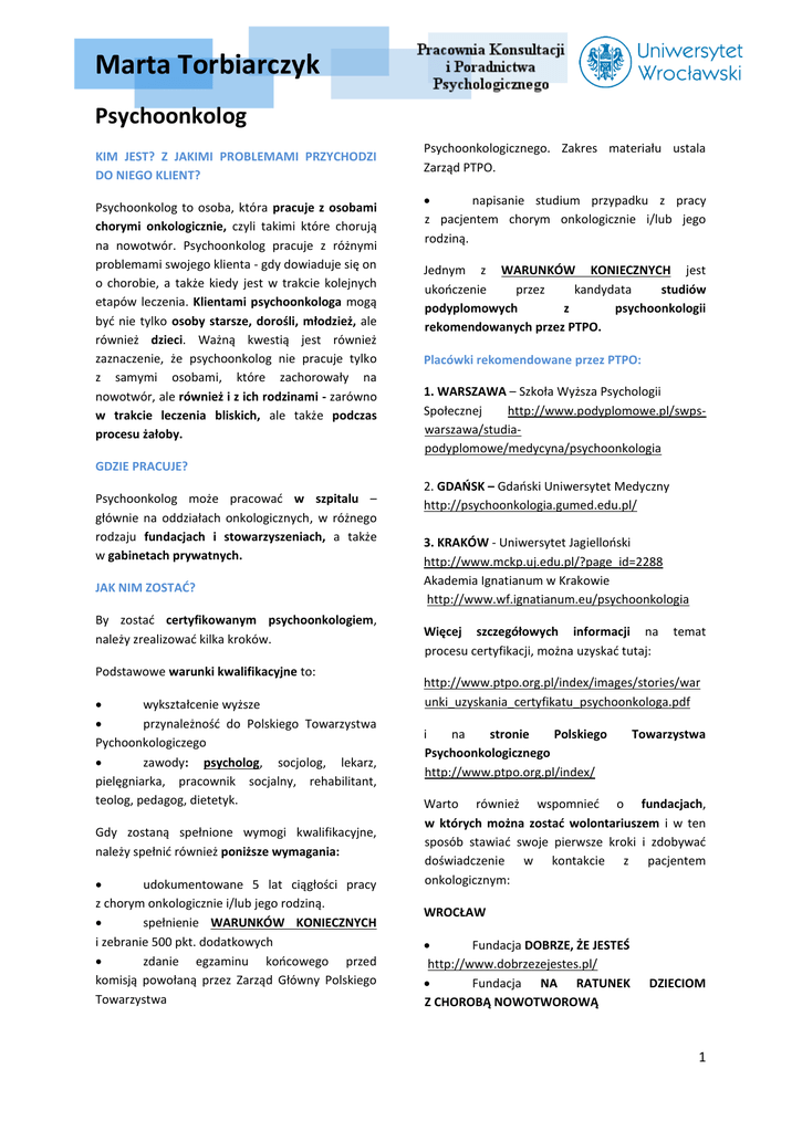 Marta Torbiarczyk Psychoonkolog KIM JEST? Z JAKIMI PROBLEMAMI PRZYCHODZI DO NIEGO KLIENT? Psychoonkolog to osoba, która pracuje z osobami chorymi onkologicznie, czyli takimi które chorują na nowotwór. Psychoonkolog pracuje z różnymi problemami swojego klienta - gdy dowiaduje się on o chorobie, a także kiedy jest w trakcie kolejnych etapów leczenia. Klientami psychoonkologa mogą być nie tylko osoby starsze, dorośli, młodzież, ale również dzieci. Ważną kwestią jest również zaznaczenie, że psychoonkolog nie pracuje tylko z samymi osobami, które zachorowały na nowotwór, ale również i z ich rodzinami - zarówno w trakcie leczenia bliskich, ale także podczas procesu żałoby. Psychoonkologicznego. Zakres materiału ustala Zarząd PTPO. napisanie studium przypadku z pracy z pacjentem chorym onkologicznie i/lub jego rodziną. Jednym z WARUNKÓW KONIECZNYCH jest ukończenie przez kandydata studiów podyplomowych z psychoonkologii rekomendowanych przez PTPO. Placówki rekomendowane przez PTPO: 1. WARSZAWA – Szkoła Wyższa Psychologii Społecznej http://www.podyplomowe.pl/swpswarszawa/studiapodyplomowe/medycyna/psychoonkologia GDZIE PRACUJE? Psychoonkolog może pracować w szpitalu – głównie na oddziałach onkologicznych, w różnego rodzaju fundacjach i stowarzyszeniach, a także w gabinetach prywatnych. JAK NIM ZOSTAĆ? By zostać certyfikowanym psychoonkologiem, należy zrealizować kilka kroków. Podstawowe warunki kwalifikacyjne to: wykształcenie wyższe przynależność do Polskiego Towarzystwa Pychoonkologiczego zawody: psycholog, socjolog, lekarz, pielęgniarka, pracownik socjalny, rehabilitant, teolog, pedagog, dietetyk. Gdy zostaną spełnione wymogi kwalifikacyjne, należy spełnić również poniższe wymagania: udokumentowane 5 lat ciągłości pracy z chorym onkologicznie i/lub jego rodziną. spełnienie WARUNKÓW KONIECZNYCH i zebranie 500 pkt. dodatkowych zdanie egzaminu końcowego przed komisją powołaną przez Zarząd Główny Polskiego Towarzystwa 2. GDAŃSK – Gdański Uniwersytet Medyczny http://psychoonkologia.gumed.edu.pl/ 3. KRAKÓW - Uniwersytet Jagielloński http://www.mckp.uj.edu.pl/?page_id=2288 Akademia Ignatianum w Krakowie http://www.wf.ignatianum.eu/psychoonkologia Więcej szczegółowych informacji na procesu certyfikacji, można uzyskać tutaj: temat http://www.ptpo.org.pl/index/images/stories/war unki_uzyskania_certyfikatu_psychoonkologa.pdf i na stronie Polskiego Psychoonkologicznego http://www.ptpo.org.pl/index/ Towarzystwa Warto również wspomnieć o fundacjach, w których można zostać wolontariuszem i w ten sposób stawiać swoje pierwsze kroki i zdobywać doświadczenie w kontakcie z pacjentem onkologicznym: WROCŁAW Fundacja DOBRZE, ŻE JESTEŚ http://www.dobrzezejestes.pl/ Fundacja NA RATUNEK Z CHOROBĄ NOWOTWOROWĄ DZIECIOM 1 http://naratunek.org/zostanwolontariuszem/zostan-wolontariuszem/ KONKRETNE ADRESY WE WROCŁAWIU, DLA OSÓB, KTÓRE SZUKAJĄ POMOCY: We Wrocławiu w ramach działań Fundacji Dolnośląskie Centrum Psychoonkologii i Rehabilitacji http://dcpir.pl/ od pięciu lat odbywa się Akademia Walki z Rakiem http://www.awzr.pl/~wroclaw/. Jest to całoroczny program pomocy psychoonkologicznej (z elementami terapii Simontona), szeroko pojętej rehabilitacji oraz edukacji dietetycznej skierowany do chorych na raka mieszkańców Wrocławia oraz ich rodzin. Istnieje również Stowarzyszenie Pomocy Chorym Onkologicznie Różowe Okulary http://www.rozoweokulary.y0.pl/ Stowarzyszenie Amazonek Femina Fenix http://www.amazonki.wroclaw.pl/index.php?optio n=com_content&view=article&id=31&Itemid=39 Warto zaznaczyć, że psychoonkologia jest dziedziną rozwijającą się. Niestety wzrost zachorowań na nowotwory jest nieunikniony, zatem można prognozować, że wzrośnie również zapotrzebowanie na pomoc psychologiczną osobom chorym i ich rodzinom. Warto zastanowić się, czy być może ten obszar jest tym, w którym młodzi psychologowie powinni się rozwijać i wybierać właśnie psychoonkologię jako swoją specjalizację. 2