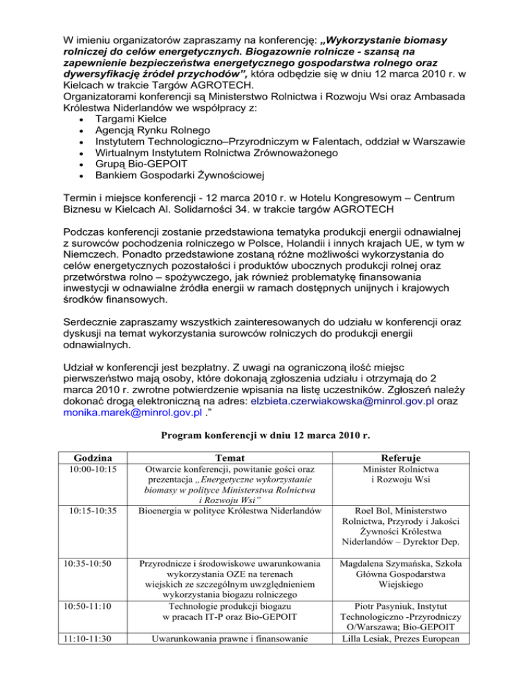 W imieniu organizatorów zapraszamy na konferencję: „Wykorzystanie biomasy rolniczej do celów energetycznych. Biogazownie rolnicze - szansą na zapewnienie bezpieczeństwa energetycznego gospodarstwa rolnego oraz dywersyfikację źródeł przychodów”, która odbędzie się w dniu 12 marca 2010 r. w Kielcach w trakcie Targów AGROTECH. Organizatorami konferencji są Ministerstwo Rolnictwa i Rozwoju Wsi oraz Ambasada Królestwa Niderlandów we współpracy z: • Targami Kielce • Agencją Rynku Rolnego • Instytutem Technologiczno–Przyrodniczym w Falentach, oddział w Warszawie • Wirtualnym Instytutem Rolnictwa Zrównoważonego • Grupą Bio-GEPOIT • Bankiem Gospodarki Żywnościowej Termin i miejsce konferencji - 12 marca 2010 r. w Hotelu Kongresowym – Centrum Biznesu w Kielcach Al. Solidarności 34. w trakcie targów AGROTECH Podczas konferencji zostanie przedstawiona tematyka produkcji energii odnawialnej z surowców pochodzenia rolniczego w Polsce, Holandii i innych krajach UE, w tym w Niemczech. Ponadto przedstawione zostaną różne możliwości wykorzystania do celów energetycznych pozostałości i produktów ubocznych produkcji rolnej oraz przetwórstwa rolno – spożywczego, jak również problematykę finansowania inwestycji w odnawialne źródła energii w ramach dostępnych unijnych i krajowych środków finansowych. Serdecznie zapraszamy wszystkich zainteresowanych do udziału w konferencji oraz dyskusji na temat wykorzystania surowców rolniczych do produkcji energii odnawialnych. Udział w konferencji jest bezpłatny. Z uwagi na ograniczoną ilość miejsc pierwszeństwo mają osoby, które dokonają zgłoszenia udziału i otrzymają do 2 marca 2010 r. zwrotne potwierdzenie wpisania na listę uczestników. Zgłoszeń należy dokonać drogą elektroniczną na adres: [email protected] oraz [email protected] .” Program konferencji w dniu 12 marca 2010 r. Godzina Temat Referuje 10:00-10:15 Otwarcie konferencji, powitanie gości oraz prezentacja „Energetyczne wykorzystanie biomasy w polityce Ministerstwa Rolnictwa i Rozwoju Wsi” Bioenergia w polityce Królestwa Niderlandów Minister Rolnictwa i Rozwoju Wsi 10:15-10:35 10:35-10:50 10:50-11:10 11:10-11:30 Przyrodnicze i środowiskowe uwarunkowania wykorzystania OZE na terenach wiejskich ze szczególnym uwzględnieniem wykorzystania biogazu rolniczego Technologie produkcji biogazu w pracach IT-P oraz Bio-GEPOIT Uwarunkowania prawne i finansowanie Roel Bol, Ministerstwo Rolnictwa, Przyrody i Jakości Żywności Królestwa Niderlandów – Dyrektor Dep. Magdalena Szymańska, Szkoła Główna Gospodarstwa Wiejskiego Piotr Pasyniuk, Instytut Technologiczno -Przyrodniczy O/Warszawa; Bio-GEPOIT Lilla Lesiak, Prezes European 11:30-11:50 elektroenergetyki w Polsce Institute for Enviromental Energy Kierunki rozwoju energetyki odnawialnej w Holandii Kees W. Kwant, Nl Agency 11:50-12:20 Dyskusja 12:20-12:50 Przerwa kawowa 12:50-13:10 Biogazownie rolnicze w Polsce – doświadczenia z wdrażania i eksploatacji instalacji Lech Ciurzyński, Substancja pofermentacyjna jako nawóz Alina Kowalczyk-Juśko, Uniwersytet Przyrodniczy w Lublinie 13:30-13:50 Technologia pozyskiwania biogazu z odpadów organicznych i produkcja energii odnawialnej w instalacjach rolniczych i przemysłowych Przemysław Zakrzewski, Ferox Energy Systems 13:50-14:10 Wysokotemperaturowe zgazowanie biomasy rolniczej oraz biokarbon Roman Borecki 14:10-14:30 Model i zasady finansowania projektów biogazowych Dawid Galus, Maciej Majewski, Bank Gospodarki Żywnościowej 14:30-14:50 Wykorzystanie biogazu jako paliwa transportowego Tadeusz Zakrzewski, Krajowa Izba Biopaliw 14:50-15:10 Podsumowanie i zakończenie konferencji Kazimierz Żmuda, Zastępca Dyrektora Departamentu Rynków Rolnych MRiRW Raymond Tans, Radca ds. Rolnictwa, Przyrody i Jakości Żywności, Ambasada Królestwa Niderlandów 15:10-16:00 Poczęstunek dla uczestników konferencji 13:10-13:30 * organizatorzy zastrzegają sobie możliwość zmiany programu