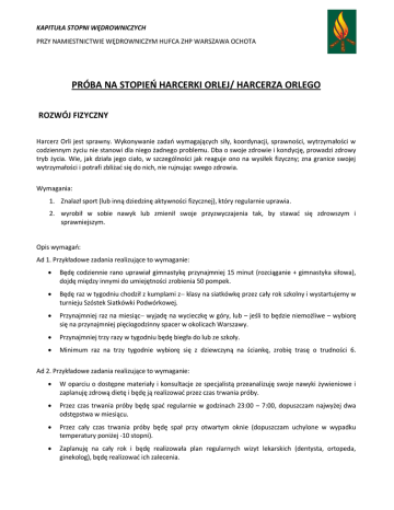 KAPITUŁA STOPNI WĘDROWNICZYCH PRZY NAMIESTNICTWIE WĘDROWNICZYM HUFCA ZHP WARSZAWA OCHOTA PRÓBA NA STOPIEŃ HARCERKI ORLEJ/ HARCERZA ORLEGO ROZWÓJ FIZYCZNY Harcerz Orli jest sprawny. Wykonywanie zadao wymagających siły, koordynacji, sprawności, wytrzymałości w codziennym życiu nie stanowi dla niego żadnego problemu. Dba o swoje zdrowie i kondycję, prowadzi zdrowy tryb życia. Wie, jak działa jego ciało, w szczególności jak reaguje ono na wysiłek fizyczny; zna granice swojej wytrzymałości i potrafi zbliżad się do nich, nie rujnując swego zdrowia. Wymagania: 1. Znalazł sport (lub inną dziedzinę aktywności fizycznej), który regularnie uprawia. 2. wyrobił w sobie nawyk lub zmienił swoje przyzwyczajenia tak, by stawad się zdrowszym i sprawniejszym. Opis wymagao: Ad 1. Przykładowe zadania realizujące to wymaganie: Będę codziennie rano uprawiał gimnastykę przynajmniej 15 minut (rozciąganie + gimnastyka siłowa), dojdę między innymi do umiejętności zrobienia 50 pompek. Będę raz w tygodniu chodził z kumplami z klasy na siatkówkę przez cały rok szkolny i wystartujemy w turnieju Szóstek Siatkówki Podwórkowej. Przynajmniej raz na miesiąc wyjadę na wycieczkę w góry, lub – jeśli to będzie niemożliwe – wybiorę się na przynajmniej pięciogodzinny spacer w okolicach Warszawy. Przynajmniej trzy razy w tygodniu będę biegła do lub ze szkoły. Minimum raz na trzy tygodnie wybiorę się z dziewczyną na ściankę, zrobię trasę o trudności 6. Ad 2. Przykładowe zadania realizujące to wymaganie: W oparciu o dostępne materiały i konsultacje ze specjalistą przeanalizuję swoje nawyki żywieniowe i zaplanuję zdrową dietę i będę ją realizowad przez czas trwania próby. Przez czas trwania próby będę spad regularnie w godzinach 23:00 – 7:00, dopuszczam najwyżej dwa odstępstwa w miesiącu. Przez cały czas trwania próby będę spał przy otwartym oknie (dopuszczam uchylone w wypadku temperatury poniżej -10 stopni). Zaplanuję na cały rok i będę realizowała plan regularnych wizyt lekarskich (dentysta, ortopeda, ginekolog), będę realizowad ich zalecenia. KAPITUŁA STOPNI WĘDROWNICZYCH PRZY NAMIESTNICTWIE WĘDROWNICZYM HUFCA ZHP WARSZAWA OCHOTA Wyrobię w sobie nawyk siedzenia prosto i będę regularnie chodził na rehabilitację kręgosłupa tak długo, jak będzie to potrzebne. ROWÓJ EMOCJONALNY Harcerz Orli świadomie pracuje nad swoim charakterem. Chce byd lepszym człowiekiem. Jest świadom swoich emocji. Stara się rozumied innych ludzi i ich odczucia – umie też radzid sobie w sytuacjach konfliktowych. Planuje swój czas, godzi obowiązki, nie zaniedbując swoich marzeo i chęci. Wymagania próby: 1. Rozwinie lub zmieni wybrany aspekt swojego charakteru. 2. Realizuje swoje marzenia i chęci – zrobi coś dla siebie. Opis wymagao: Ad 1. Jedną z najważniejszych części próby jest praca nad własnym charakterem. Warto wybrad cechę charakteru, nad którą chce się trochę popracowad. Czasem warto zapytad przyjaciół i starszych mądrych kolegów, co to mogło by byd. Najważniejsza jest świadomośd co i jakimi sposobami chce się osiągnąd. Dobrze jest jeśli zadanie rozwija stronę emocjonalną człowieka – w tym cechy ułatwiające relacje z innymi ludźmi. W tym zadaniu warto też zastanowid się nad związkiem uznawanych wartości ze swoim życiem. Ważną częścią tego zadania jest początkowa analiza. Przykładowe zadania: Opracuję najskuteczniejsze dla mnie metody walki ze stresem: przeczytam o tym książkę i wypróbuję metody, będę chodzid z przyjaciółmi do sauny i na basen (raz na dwa tygodnie). Nauczę się nie przerywad, gdy inni mówią i dyskutowad zamiast kłócid się: podwiczę używanie komunikatu ,,ja'', przeanalizuję sobie w myślach każdą odbytą rozmowę i wyciągnę wnioski - nauczę się prowadzid rozmowę – umówię się specjalnie, żeby pogadad pięd razy z różnymi ludźmi, przeanalizuję rozmowy i wynajdę ich aspekty, które sprawiały mi trudności, w kolejnej rozmowie spróbuję je pokonad. Przez miesiąc nie będę się spóźniad. Ad 2. Bodaj najprzyjemniejsza rzecz w próbie. Miejsce do realizacji jakiegoś niewielkiego chociażby marzenia. Coś co zawsze się chciało zrobid, ale nie było na to czasu lub wystarczającego zdeterminowania. Coś, co poprawia humor. Po prostu coś dla siebie, chod to może nie jest najlepsza nazwa, bo cała próba jest „dla siebie". Przykładowe zadania: Wyjadę z przyjaciółmi na sylwestra w góry. Pójdę na kurs masażu. Pójdę na maraton filmów latynoamerykaoskich. KAPITUŁA STOPNI WĘDROWNICZYCH PRZY NAMIESTNICTWIE WĘDROWNICZYM HUFCA ZHP WARSZAWA OCHOTA Przeczytam wszystkie zaległe książki Pratchetta. Zdobędę patent żeglarski. ROZWÓJ DUCHOWY Harcerz Orli świadomie pracuje nad swoim systemem wartości. Chce byd człowiekiem dobrym i uczciwym, zastanawia się, co to znaczy i konfrontuje swoje ideały ze swoim zachowaniem w życiu codziennym i w trudnych sytuacjach. Swoje ideały wciela w życie. Szuka odpowiedzi na trudne i ważne pytania w rozmowie z innymi, w kulturze, w przemyśleniach. W swoim życiu jest nakierowany na dobro drugiego człowieka w takim samym stopniu, co na swoje. Wymagania próby: 1. Pełni zorganizowaną służbę, świadomie pracując nad tym, by to, co robi było dobre i pożyteczne. 2. Odszukał materiał, mogący byd dla niego podstawą do rozwinięcia swojej duchowości, zgłębił go i przemyślał. 3. W trakcie trwania próby zauważył konkretną potrzebę drugiego człowieka i odpowiedział na nią, wkładając w to czas i zaangażowanie. Opis wymagao: Ad 1. Służba ma także wziąd pod uwagę rozwój społeczny, zdobycie umiejętności życia we wspólnocie, poznawanie mechanizmów i struktur życia społecznego, znajdowanie miejsca, gdzie będę światu potrzebny. W tym zadaniu kluczowe jest pełnienie służby w sposób świadomy – zrozumienie, że to, co robię jest służb
