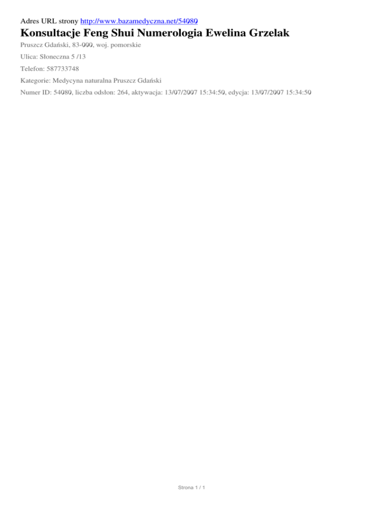 Adres URL strony http://www.bazamedyczna.net/54080 Konsultacje Feng Shui Numerologia Ewelina Grzelak Pruszcz Gdański, 83-000, woj. pomorskie Ulica: Słoneczna 5 /13 Telefon: 587733748 Kategorie: Medycyna naturalna Pruszcz Gdański Numer ID: 54080, liczba odsłon: 264, aktywacja: 13/07/2007 15:34:50, edycja: 13/07/2007 15:34:50 Strona 1 / 1