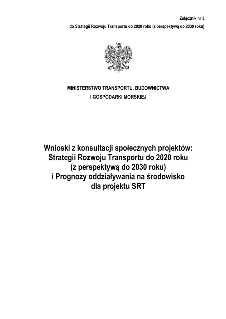 Załącznik nr 3 do Strategii Rozwoju Transportu do 2020 roku (z perspektywą do 2030 roku) MINISTERSTWO TRANSPORTU, BUDOWNICTWA I GOSPODARKI MORSKIEJ Wnioski z konsultacji społecznych projektów: Strategii Rozwoju Transportu do 2020 roku (z perspektywą do 2030 roku) i Prognozy oddziaływania na środowisko dla projektu SRT Spis treści 1. WPROWADZENIE .........................................................................................................................................................3 2. ORGANIZACJA I PRZEBIEG KONSULTACJI SPOŁECZNYCH .................................................................................4 2.1. Podstawa prawna.......................................................................................................................................................4 2.2. Podmioty odpowiedzialne za organizację oraz nadzór nad konsultacjami społecznymi ...................................4 2.3. Porządek oraz forma organizacji konsultacji społecznych....................................................................................4 Forma i sposób informowania społeczeństwa..........................................................................................................5 Forma zgłaszania oraz zbierania uwag....................................................................................................................5 Harmonogram spotkań konsultacyjnych...................................................................................................................6 Przebieg spotkań konsultacyjnych ...........................................................................................................................8 3. PODSUMOWANIE KONSULTACJI SPOŁECZNYCH, WNIOSKI I NAJWAŻNIEJSZE ZAGADNIENIA PORUSZONE W UWAGACH ........................................................................................................................................9 3.1. Podsumowanie konsultacji społecznych ................................................................................................................9 3.2. Wnioski i najważniejsze zagadnienia poruszone w uwagach..............................................................................12 Uwagi do projektu Strategii Rozwoju Transportu do 2020 roku (z perspektywą do 2030 roku) .............................12 Uwagi do projektu Prognozy oddziaływania na środowisko projektu Strategii .......................................................19 -1- Wykaz użytych akronimów oraz skrótów MI Ministerstwo Infrastruktury1) MTBiGM Ministerstwo Transportu, Budownictwa i Gospodarki Morskiej2) SOOŚ Strategiczna Ocena Oddziaływania na Środowisko SRT Strategia Rozwoju Transportu do 2020 roku (z perspektywą do 2030 roku) POŚ SRT Prognoza oddziaływania na środowisko projektu Strategii Ustawa OOŚ Ustawa z dnia 3 października 2008 r. o udostępnianiu informacji o środowisku i jego ochronie, udziale społeczeństwa w ochronie środowiska oraz o ocenach oddziaływania na środowisko (Dz.U. Nr 199, poz. 1227, z późn. zm.) Strategia Strategia Rozwoju Transportu do 2020 roku (z perspektywą do 2030 roku) Prognoza Prognoza oddziaływania na środowisko projektu Strategii 1) Z uwagi na fakt, iż postępowanie opisane w niniejszym załączniku przeprowadziło Ministerstwo Infrastruktury (MI), przekształcone na mocy rozporządzenia Rady Ministrów z dnia 21 listopada 2011r. (Dz. U. z 2011r. Nr 250, poz. 1503) w Ministerstwo Transportu, Budownictwa i Gospodarki Morskiej (MTBiGM), w odniesieniu do działań zrealizowanych przed dniem 21 listopada 2011r., w tekście załącznika stosuje się nazwę „Ministerstwo Infrastruktury” 2) Utworzone na mocy rozporządzenia Rady Ministrów z dnia 21 listopada 2011r. w sprawie utworzenia Ministerstwa Transportu, Budownictwa i Gospodarki Morskiej (Dz. U. Nr 250, poz. 1503) w drodze przekształcenia dotychczasowego Ministerstwa Infrastruktury. -2- 1. Wprowadzenie Podstawowym celem niniejszego opracowania jest przedstawienie przebiegu i wniosków z przeprowadzonej na przełomie kwietnia i maja 2011 r. kampanii informacyjnej oraz konsultacji społecznych projektów dokumentów: Strategia Rozwoju Transportu do 2020 roku (z perspektywą do 2030 roku) oraz Prognoza oddziaływania na środowisko projektu Strategii. W procedurze opiniowania przez społeczeństwo wskazanych wyżej dokumentów oraz w zorganizowanych spotkaniach konsultacyjnych udział wzięli przedstawiciele samorządu terytorialnego różnych szczebli, reprezentanci instytucji społeczno-gospodarczych oraz osoby prywatne. Wnioski z konsultacji społecznych oraz wynikające z nich rekomendacje zostały w znacznej części wykorzystane do uzupełnienia i korekty przygotowanych przez Ministerstwo Infrastruktury (obecnie: Ministerstwo Transportu, Budownictwa i Gospodarki Morskiej) projektów SRT oraz Prognozy w celu uzyskania możliwie szerokiej aprobaty społeczeństwa, zainteresowanych podmiotów gospodarczych oraz organów wykonawczych odpowiedzialnych w przyszłości za wdrażanie postanowień Strategii. Oficjalne rozpoczęcie konsultacji społecznych miało miejsce w dniu 10 maja 2011 r. w drodze publikacji na stronie internetowej Ministerstwa Infrastruktury projektów SRT oraz POŚ SRT wraz z informacją o przewidzianej formie oraz terminie zgłaszania uwag, jak również o planowanych regionalnych spotkaniach konsultacyjnych. Pierwsze spotkanie konsultacyjne odbyło się w Krakowie w dniu 16 maja 2011 r. w siedzibie Małopolskiego Urzędu Wojewódzkiego. Cykl 4 spotkań regionalnych zamknęła konferencja podsumowująca w Warszawie zorganizowana dnia 1 czerwca 2011 r. w siedzibie Mazowieckiego Urzędu Wojewódzkiego. Dzień 1 czerwca 2011 r. był dniem zamykającym okres składania uwag do wskazanych wyżej dokumentów. Uwagi napływały do MI do dnia 8 czerwca 2011 r. włącznie. MI podjęło decyzję o ich włączeniu do prezentowanego w niniejszym opracowaniu stanowiska. Szczeg