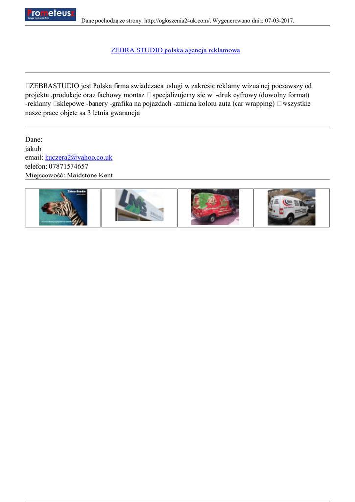 Dane pochodzą ze strony: http://ogloszenia24uk.com/. Wygenerowano dnia: 07-03-2017. ZEBRA STUDIO polska agencja reklamowa ZEBRASTUDIO jest Polska firma swiadczaca uslugi w zakresie reklamy wizualnej poczawszy od projektu ,produkcje oraz fachowy montaz specjalizujemy sie w: -druk cyfrowy (dowolny format) -reklamy sklepowe -banery -grafika na pojazdach -zmiana koloru auta (car wrapping) wszystkie nasze prace objete sa 3 letnia gwarancja Dane: jakub email: [email protected] telefon: 07871574657 Miejscowość: Maidstone Kent