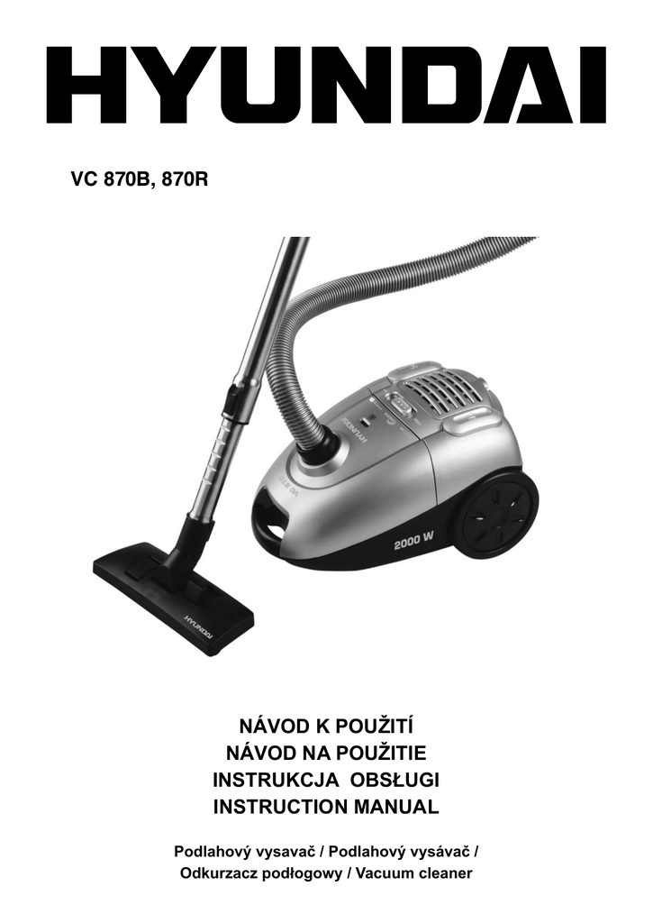 VC 870B, 870R NÁVOD K POUŽITÍ NÁVOD NA POUŽITIE INSTRUKCJA OBSŁUGI INSTRUCTION MANUAL Podlahový vysavač / Podlahový vysávač / Odkurzacz podłogowy / Vacuum cleaner Vážený zákazníku, děkujeme Vám za zakoupení našeho produktu. Před uvedením tohoto přístroje do provozu si velmi pozorně přečtěte návod k obsluze a tento návod spolu se záručním listem, pokladním dokladem a podle možností i s obalem a vnitřním obsahem obalu dobře uschovejte. Všeobecné bezpečnostní pokyny • Používejte tento přístroj výlučně pro soukromou potřebu a pro stanovené účely. Tento přístroj není určen pro komerční použití. • Nepoužívejte spotřebič v otevřeném prostoru. Chraňte jej před horkem, přímým slunečním zářením, vlhkostí (v žádném případě jej neponořujte do kapalin) a stykem s ostrými hranami. Nepoužívejte přístroj v případě, že máte vlhké ruce. Jestliže dojde k navlhčení nebo namočení přístroje, okamžitě vytáhněte zástrčku ze zásuvky. Vyvarujte se styku s vodou. • Přístroj vypněte a vždy vytáhněte zástrčku ze zásuvky (tahejte jen za zástrčku, nikdy ne za kabel), jestliže nebudete přístroj používat, chcete-li namontovat příslušenství, přístroj vyčistit nebo v případě poruchy. • Přístroj nesmí zůstat v provozu bez dozoru. Jestliže musíte pracoviště opustit, vždy přístroj vypněte, resp. vytáhněte zástrčku ze zásuvky (vždy tahejte za zástrčku, nikdy ne za kabel). • Abyste ochránili děti před riziky spojenými s elektrickými přístroji, postarejte se o to, aby kabel nevisel dolů a děti na přístroj nedosáhly. • Pravidelně kontrolujte přístroj a přívodní kabel z hlediska poškození. Jestliže přístroj vykazuje nějakou závadu, neuvádějte jej do provozu. • Neopravujte přístroj vlastními silami, vyhledejte autorizovaný servis. • Používejte jen originální příslušenství. • Respektujte, prosím, následující „Speciální bezpečnostní pokyny pro tento přístroj“. Speciální bezpečnostní pokyny pro tento přístroj • Před použitím zkontrolujte, že je napětí v místní elektrické síti stejné jako uvedené na štítku přístroje. • Před čistěním vždy odpojte přístroj ze zásuvky. • Nepoužívejte jej nadměrně (například pro vysávání cementu, omítky), jelikož může dojít ke snížení životnosti nebo dokonce poškození. • Vysavač nikdy nepoužívejte bez filtru a prachového vaku nebo sáčku. Zkontrolujte, zda je filtr a vak vložen správně! • Nikdy nevysávejte nic hořícího nebo kouřícího, jako jsou cigarety, zápalky nebo horký popel! • Nevysávejte kapaliny! • Nepoužívejte přístroj když sací výkon slábne. Důvodem je plný prachový vak nebo zanesené filtry. Vyčistěte je nebo vyměňte jej za nové. • Než začnete vysavač používat, zcela jej sestavte. • Zařízení za kabel netahejte ani nezvedejte, nepoužívejte kabel jako rukojeť, nepřivírejte kabel do dveří, ani jej neobtáčejte kolem ostrých hran nebo rohů. Nepřejíždějte spotřebičem přes kabel. Zabraňte kontaktu kabelu s horkými povrchy. • Do otvorů nevkládejte žádné předměty. Nepoužívejte, je-li některý otvor ucpaný. Udržujte zařízení bez prachu, chuchvalců, vlasů a jiných nečistot, které by mohly snížit proudění vzduchu. • Před odpojením ze zásuvky vypněte spotřebič. • Nepřibližujte otvory zařízení k obličeji a tělu. • Při čištění schodů buďte opatrní. • Nepoužívejte k úklidu hořlavých nebo výbušných tekutin, jako je benzín, a nepoužívejte v oblastech, kde by se takové látky mohly vyskytovat. • Děti by měli být vždy pod dohledem, aby se zamezilo jejich hraní s tímto přístrojem. CZ - CZ • Tento spotřebič není určen pro používání osobami (včetně dětí), jimž fyzická, smyslová, nebo mentální neschopnost či nedostatek zkušeností a znalostí zabraňuje v bezpečném používání spotřebiče, pokud na ně nebude dohlíženo nebo pokud nebyly instruovány ohledně použití spotřebiče osobou zodpovědnou za jejich bezpečnost. Popis ovládacích prvků P1 P2 P3 P4 P5 P6 P7 P8 P9 P10 P11 P12 Podlahová hubice Teleskopická trubice Připojení sací hadice Sací hadice Tlačítko pro uvolnění sací hadice Madlo pro přenášení vysavače Spínač navíjení kabelu Indikátor plného sáčku Hlavní spínač zapnuto/vypnuto (ON/OFF) Ovladač výkonu Kartáčová a štěrbinová hubice Polštářová hubice CZ - Příslušenství Váš vysavač je vybaven třemi nástavci k různému použití. Každý nástavec může být nasazen na teleskopickou trubici nebo přímo na rukojeť hadice. Podlahová hubice S podlahovou hubicí budete pravděpodobně pracovat nejčastěji. Je vhodná pro úklid velkých ploch. Podlahová hubice je vybavena praktickým otočným kloubem o 360 °. To zaručuje, že se snadno dostanete to všech rohů. - Čištění koberců bez použití kartáče. Sešlápněte klapku se symbolem koberce a dojde k zasunutí kartáčků. - Hladké podlahy jako je PVC, parkety nebo dlažba se nejlépe udržují s použitím kartáčků. Sešlápněte klapku se symbolem hladké podlahy a dojde k jejich vysunutí. Kartáčová a štěrbinová hubice Kartáčovou hubici použít pro odstraňování prachu z knih nebo jemných předmětù jako jsou rámy obrazů atd. Štěrbinovou sací hubici múžete použít na štěrbiny a hrany čalouněného nábytku, rohy zdí a okenní rámy. Polštářová hubice Polštářová hubice je vhodná pro péči o čalouněný nábytek, matrace, polstrování, závěsy atd. CZ - CZ Pokyny k použití Způsob sestavení a rozebírání Spojení hadice s vysavačem. Vsuňte hadici do otvoru pro nasávání vzduchu, stlačte ji a až uslyšíte zacvaknutí, znamená to, že je patřičně upevněna v pozici. Odpojení hadice P