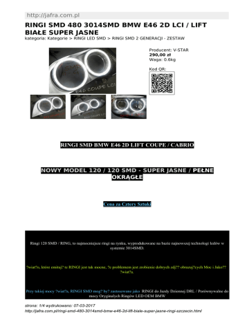 http://jafra.com.pl RINGI SMD 480 3014SMD BMW E46 2D LCI / LIFT BIAŁE SUPER JASNE kategoria: Kategorie > RINGI LED SMD > RINGI SMD 2 GENERACJI - ZESTAW Producent: V-STAR 290,00 zł Waga: 0.6kg Kod QR: RINGI SMD BMW E46 2D LIFT COUPE / CABRIO NOWY MODEL 120 / 120 SMD - SUPER JASNE / PEŁNE OKRĄGŁE Cena za Cztery Sztuki Ringi 120 SMD / RING, to najmocniejsze ringi na rynku, wyprodukowane na bazie najnowszej technologi ledów w systemie 3014SMD. ?wiat?o, które emituj? te RINGI jest tak mocne, ?e problemem jest zrobienie dobrych zdj?? obrazuj?cych Moc i Jako?? ?wiat?a. Przy takiej mocy ?wiat?a, RINGI SMD mog? by? zastosowane jako RINGI do Jazdy Dziennej DRL / Porównywalne do mocy Oryginalych Ringów LED OEM BMW strona: 1/4 wydrukowano: 07-03-2017 http://jafra.com.pl/ringi-smd-480-3014smd-bmw-e46-2d-lift-biale-super-jasne-ringi-szczecin.html ZASTOSOWANIE - RINGI SMD: BMW E46 2D LCI - LIFT COUPE / CABRIO 2003 - 2006 / RINGI C+C - PE?NE OKR?G?E UWAGA WA?NE OPCJE DO RINGÓW SMD - opis przyk?adów Opis Opcji Ring SMD sprzedawane s? bez wi?zki steruj?cej. Za oryginaln? wi?zk? z przeka?nikiem, do Ringów nale?y doliczyc 30z?. Oryginalna wi?zka jest opcjonalna, gdy? nowe modu?y DRL maj? swoj? oryginaln? wi?zk? monta?ow?. Przyk?adowa konfiguracja - zestaw z wi?zk? z przeka?nikiem: Ringi SMD II Generacji 290 + 30 = 320z? Przyk?adowa konfiguracja - zestaw z modu?em DRL + opcje: Ringi SMD II Generacji 290 + 140 = 430z? - Modu? DRL AJ-RL3/3-3 z wi?zk? monta?ow? PR Filtry EMC 5-6W - 45z? ??czna kwota za zestaw 475z? - plus koszty wysy?ki Rodzaje modu?ów - opis funkcji - ceny - poni?ej Oferowany Towar jest Nowy, Fabrycznie Zapakowany !!! Asortyment dostępny od ręki !!! SPECYFIKACJA TECHNICZNA - RINGI 120 SMD BMW: Ringi SMD nie pokazuj? b??dów na komputerze - 4 Pe?ne okr?g?e Ringi jednakowej wielko?ci ?ród?o ?wiat?a Ledy 3014SMD EPISTAR 4/C x 120szt / 480szt ?wiat?o k?t ?wiat?a 180 o High Output 10000mcd LEDs Obudowa PoliCarbon UV strona: 2/4 wydrukowano: 07-03-2017 http://jafra.com.pl/ringi-smd-480-3014smd-bmw-e46-2d-lift-biale-super-jasne-ringi-szczecin.html Zasilanie 12V - bez przetwornic Zabezpieczenie wi?zka monta?owa Prosty monta?- RINGI SMD montuje si? tak samo, jak znane juz wszystkim ringi RINGI CCFL ZESTAW RINGÓW SMD - Zawiera: Cztery ringi SMD C - Cztery pe?ne okr?g?e / Zestaw na dwa reflektory CC - Lewy + CC - Prawy Ta?ma dwustronna w kawa?kach Wi?zka monta?owa z przeka?nikiem - opcja do dokupienia + 30z? Modu? DRL z wi?zk? monta?ow? - opcja do dokupienia 130 - 140z? - Zalecane Oryginalne opakowanie producenta Gwarancja: 12m-cy rzetelnej gwarancji licz?c od daty zakupu - wystawiana i rozpatrywana przez nasz? Firm? z siedzib? w Szczecinie Uwagi: Ringi SMD nie mog? by? w ?aden sposób napi?te, mocowane na wcisk - odkszta?cone, Ringi powinnny by? obsadzony swobodnie, a nast?pnie przyklejone - mocowane na sta?e w reflektorze. Z?y monta? Ringów SMD plus temepratura pracy, powoduje odkszta?cenia i nadmierne napi?cia ringów, co prowadzi do uszkodze? mechanicznych typu: odklejanie si? LED Chip, oraz innych uszkodze? po??cze? w ringach POD??CZENIE - RINGI SMD: Ringi SMD mo?na pod??czy? przez oryginaln? wi?zk? steruj?c? z przeka?nikiem lub prze modu? DRL z wi?zk?: strona: 3/4 wydrukowano: 07-03-2017 http://jafra.com.pl/ringi-smd-480-3014smd-bmw-e46-2d-lift-biale-super-jasne-ringi-szczecin.html Ringi SMD I i II Generacji zalecamy pod??cza? i konfigurowa? z modu?ami DRL, które stworzyli?my specjalnie do tych ringów. Dzi?ki modu?om zyskujemy pe?n? funkcjonalno?? ringów jak: ?wiat?a dzienne, pozycja - ringi w funkcji przygaszenia, pozycja bez kluczyka w stacyjce - ringi w funkcji przygaszenia, funkcja CLH - Coming Leaving Home. Taka funkcjonalno?? ringów wyst?puje w najnowszych modelach BMW, np BMW F10, F20 F30 X5 X6 etc. Rodzaje i konfiguracje modu?ów DRL: MODU? ?WIATE? DO JAZDY DZIENNEJ DRL AJ-RL3/3-2 RINGI SMD - DRL + POZYCJA + POZYCJA BEZ KLUCZYKA MODU? ?WIATE? DO JAZDY DZIENNEJ DRL AJ-RL3/3-3 RINGI SMD - DRL + POZYCJA + POZYCJA BEZ KLUCZYKA + COMING LEAVING HOME Przy ?wiat?ach dziennych, nie uruchamia si? ?adne inne o?wietlenie samochodu. Opcjonalnie mo?na w??czy? ?wiat?a pozycyjne przy z?ej pogodzie, aby poprawi? widoczno?? samochodu z ty?u. Ringi SMD maj? bardzo du?? jasno?? - moc ?wiat?a, bez konfiguracji z modu?em DRL nie zalecamy aby u?ywa? ringów wieczorem oraz w nocy. Przy pe?nej mocy ?wiat?a - bez przygaszenia, ringi b?d? o?lepia?y kierowców jad?cych z naprzeciwka, mo?na te? narazi? si? na utrat? dowodu rejestracyjnego trafiaj?c na Policj?. UWAGA WA?NE - przy pod??czeniu wi?zki oraz wi?zki z modu?em DRL, konieczne jest, aby kabel minusowy mia? dobry kontakt z mas? samochodu. Brak dobrego styku powoduje z?? prac? uk?adu, oraz mo?e doprowadzi? do uszkodzenia modu?u, w szczególnych przypadkach równie? ringów. strona: 4/4 wydrukowano: 07-03-2017 http://jafra.com.pl/ringi-smd-480-3014smd-bmw-e46-2d-lift-biale-super-jasne-ringi-szczecin.html