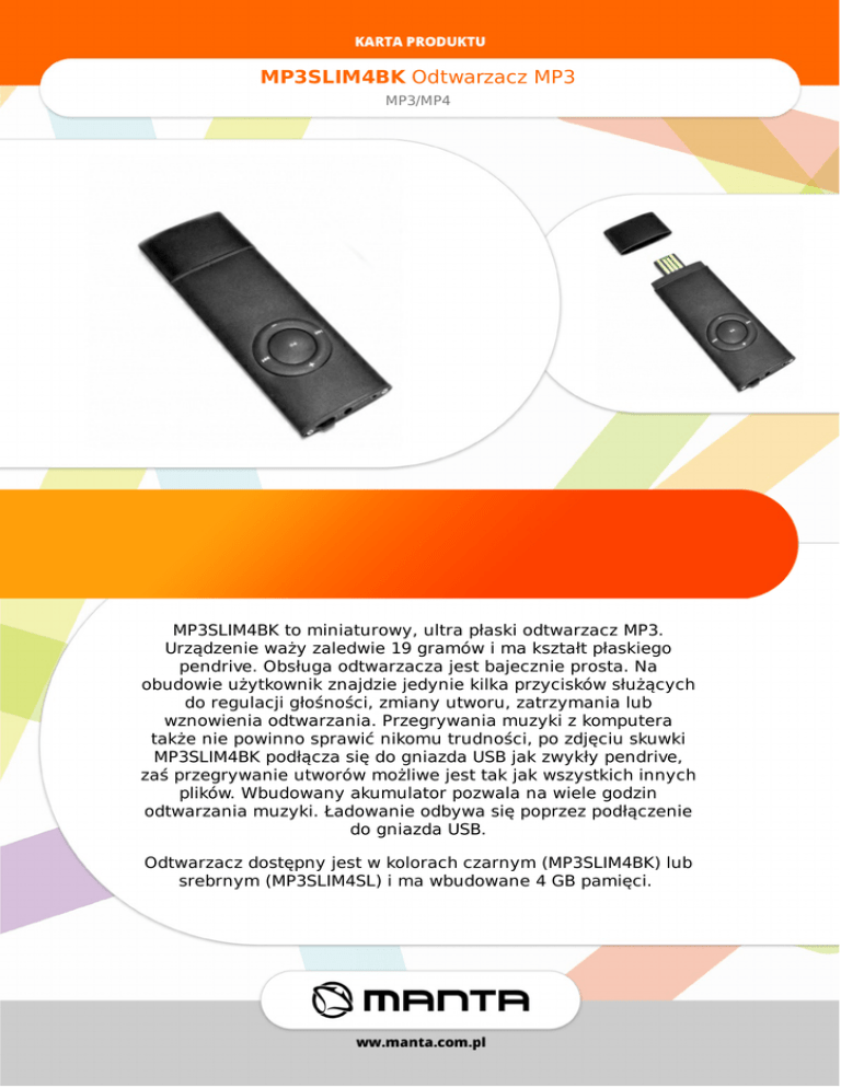 MP3SLIM4BKOdtwarzaczMP3 MP3/MP4 MP3SLIM4BKtominiaturowy,ultrapłaskiodtwarzaczMP3. Urządzenieważyzaledwie19gramówimakształtpłaskiego pendrive.Obsługaodtwarzaczajestbajecznieprosta.Na obudowieużytkownikznajdziejedyniekilkaprzyciskówsłużących doregulacjigłośności,zmianyutworu,zatrzymanialub wznowieniaodtwarzania.Przegrywaniamuzykizkomputera takżeniepowinnosprawićnikomutrudności,pozdjęciuskuwki MP3SLIM4BKpodłączasiędogniazdaUSBjakzwykłypendrive, zaśprzegrywanieutworówmożliwejesttakjakwszystkichinnych plików.Wbudowanyakumulatorpozwalanawielegodzin odtwarzaniamuzyki.Ładowanieodbywasiępoprzezpodłączenie dogniazdaUSB. Odtwarzaczdostępnyjestwkolorachczarnym(MP3SLIM4BK)lub srebrnym(MP3SLIM4SL)imawbudowane4GBpamięci. MP3SLIM4BKOdtwarzaczMP3 MP3/MP4 Specyfikacja Zasilanie wbudowanyakumulator Wymiary(SxWxG) 80x20x12mm Waga 19g Wyposażenie słuchawki FLASH 4GB OdtwarzaneplikiAudio MP3,WMA,WAV http://www.manta.com.pl/pl/mp3slim4bk EAN:5902510602222