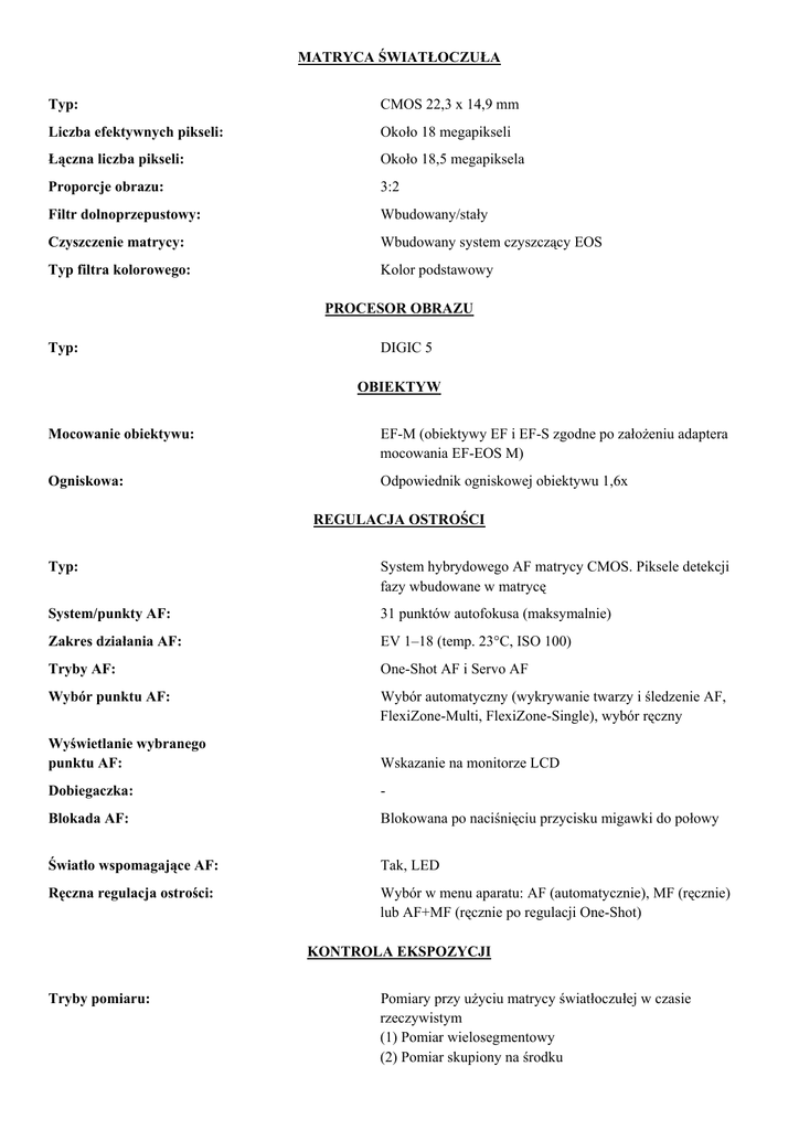 MATRYCA ŚWIATŁOCZUŁA Typ: CMOS 22,3 x 14,9 mm Liczba efektywnych pikseli: Około 18 megapikseli Łączna liczba pikseli: Około 18,5 megapiksela Proporcje obrazu: 3:2 Filtr dolnoprzepustowy: Wbudowany/stały Czyszczenie matrycy: Wbudowany system czyszczący EOS Typ filtra kolorowego: Kolor podstawowy PROCESOR OBRAZU Typ: DIGIC 5 OBIEKTYW Mocowanie obiektywu: EF-M (obiektywy EF i EF-S zgodne po założeniu adaptera mocowania EF-EOS M) Ogniskowa: Odpowiednik ogniskowej obiektywu 1,6x REGULACJA OSTROŚCI Typ: System hybrydowego AF matrycy CMOS. Piksele detekcji fazy wbudowane w matrycę System/punkty AF: 31 punktów autofokusa (maksymalnie) Zakres działania AF: EV 1–18 (temp. 23°C, ISO 100) Tryby AF: One-Shot AF i Servo AF Wybór punktu AF: Wybór automatyczny (wykrywanie twarzy i śledzenie AF, FlexiZone-Multi, FlexiZone-Single), wybór ręczny Wyświetlanie wybranego punktu AF: Wskazanie na monitorze LCD Dobiegaczka: - Blokada AF: Blokowana po naciśnięciu przycisku migawki do połowy Światło wspomagające AF: Tak, LED Ręczna regulacja ostrości: Wybór w menu aparatu: AF (automatycznie), MF (ręcznie) lub AF+MF (ręcznie po regulacji One-Shot) KONTROLA EKSPOZYCJI Tryby pomiaru: Pomiary przy użyciu matrycy światłoczułej w czasie rzeczywistym (1) Pomiar wielosegmentowy (2) Pomiar skupiony na środku (3) Pomiar punktowy (4) Pomiar centralnie ważony uśredniony Zakres pomiaru: EV 1–20 (temp. 23°C, obiektyw EF-M 22 mm f/2 STM ISO100) Blokada AE: Automatyczna: w trybie jednokrotnego AF z pomiarem wielosegmentowym ekspozycji blokowanym po ustawieniu ostrości Ręczna: uruchamiana przyciskiem blokady AE w trybach strefy artystycznej Kompensacja ekspozycji: +/-3 EV z przyrostem co 1/3 lub 1/2 stopnia (możliwość połączenia z automatyczną sekwencją naświetlania). AEB: 3 zdjęcia +/-2 EV z przyrostem co 1/2 lub 1/3 stopnia Czułość ISO (zalecany indeks ekspozycji): Automatycznie (100–6400), 100–12800 z przyrostem co 1 stopień. Czułość ISO można rozszerzyć do H: 25600 MIGAWKA Typ: Migawka z elektroniczną pierwszą kurtyną i mechaniczną drugą kurtyną Czas otwarcia: 30–1/4000 s (z dokładnością do 1/2 lub 1/3 stopnia), tryb Bulb (pełny zakres czasów otwarcia migawki; dostępny zakres zmienny w zależności od trybu fotografowania) BALANS BIELI Typ: Automatyczny balans bieli ustawiany przez matrycę Ustawienia: Automatyczny balans bieli, światło dzienne, miejsca ocienione, pochmurny dzień, światło żarówek, białe światło fluorescencyjne, lampa błyskowa, nastawa własna Korekcja balansu bieli: 1. Niebieski/bursztynowy +/-9 2. Purpurowy/zielony +/-9 Niestandardowy balans bieli: Tak, możliwy zapis 1 ustawienia Sekwencja nastaw balansu bieli: +/-3 poziomy z przyrostem co 1 poziom 3 zdjęcia na każde zwolnienie migawki. Wybór korekcji: niebieski/bursztynowy lub purpurowy/zielony. EKRAN LCD Typ: 3-calowy (7,7 cm) ekran dotykowy Clear View LCD II, współczynnik proporcji obrazu 3:2, około 1,04 mln punktów Pole widzenia: Około 100% Kąt widzenia (poziomo/pionowo): Około 170° Powłoka: Zapobiegająca plamom Regulacja jasności: Siedem poziomów regulacji Opcje wyświetlania: (1) Ekran szybkich nastaw (2) Obraz Live View, bez informacji (3) Obraz Live View, pełne informacje (4) Obraz Live View, podstawowe informacje LAMPA BŁYSKOWA Liczba przewodnia wbudowanej lampy (ISO 100, metry): Brak Synchronizacja X-sync: 1/200 s Kompensacja ekspozycji lampy błyskowej: +/- 2 EV, z dokładnością do 1/2 lub 1/3 stopnia Sekwencja nastaw ekspozycji lampy błyskowej: Tak, w przypadku zgodnej zewnętrznej lampy błyskow Blokada ekspozycji lampy błyskowej: Tak Synchronizacja błysku z drugą kurtyną: Tak Stopka HotShoe/złącze PC: Tak/Nie Zgodność z zewnętrznymi lampami błyskowymi: E-TTL II z lampą błyskową Speedlite serii EX, bezprzewodowa obsługa wielu lamp błyskowych Sterowanie zewnętrzną lampą błyskową: Za pomocą menu aparatu FOTOGRAFOWANIE Tryby: Automatyczny tryb inteligentnej sceny Tryb zdjęć (kreatywna automatyka, portrety, krajobraz, zbliżenie, sport, nocny portret, nocne ujęcie z ręki, regulacja podświetlenia HDR, programowa AE, AE z preselekcją migawki, AE z preselekcją przysłony, ręcznie) Tryb filmów (tryb automatycznej ekspozycji, tryb ręcznej ekspozycji) Style obrazu (Picture Style): Auto, standardowy, portret, krajobraz, neutralny, dokładny, monochromatyczny, zdefiniowany przez użytkownika (x3) Przestrzeń kolorów: sRGB i Adobe RGB Przetwarzanie obrazu: Tryb priorytetu jasnych partii obrazu Automatyczny optymalizator jasności (4 ustawienia) Redukcja zakłóceń przy długim naświetlaniu Redukcja zakłóceń przy wysokiej czułości ISO (4 ustawienia) Redukcja szumów zdjęć seryjnych Automatyczna korekcja jasności brzegów obiektywu i aberracji chromatycznej Basic+ (zdjęcia wg wyboru otoczenia, zdjęcia wg rodzaju oświetlenia lub scenerii) Filtry kreatywne (artystyczny uwydatniony, akwarela, czarnobiały ziarnisty, rozmycie ostrości, aparat-zabawka, efekt miniatury, rybie oko) Tryby migawki: Pojedyncze, ciągłe, samowyzwalacz (2 s,10 s + zdalne, 10 s + seria zdjęć 2–10) Fotografowanie w trybie ciągłym: Maks. Około 4,3 kl./s dla około 17 zdjęć w formacie JPEG¹, 6 zdjęć w formacie RAW²³ TYP PLIKÓW Typ zdjęć: JPEG: niska kompresja, standardowa kompresja (zgodny z Exif 2.30) / zgodny ze standardem DCF (2.0), RAW: RAW (14-bitowy, oryginalny Canon RAW wersja 2) Zgodna ze standardem Digital Print Order Format [DPOF] wersja 1.1 Jednoczesny zapis plików RAW i JPEG: Tak (tylko format RAW + duży JPEG) Rozmiar obrazów: JPEG 3:2: (L) 5184x3456, (M) 3456x2304, (S1) 2592x1728, (S2) 1920x1280, (S3) 720x480 JPEG 4:3: (L) 4608x3456, (M) 3072x2304, (S1) 2304x1728, (S2) 1696x1280, (S3) 640x480 JPEG 16:9: (L) 5184x2912, (M) 3456x1944, (S1) 2592x1456 (S2) 1920x1080, (S3) 720x400 JPEG 1:1: (L) 3456x3456, (M) 2304x2304, (S1) 1728x1728, (S2) 1280x1280, (S3) 480x480 RAW: (RAW) 5184 x 3456 Typ filmu: MOV (wide