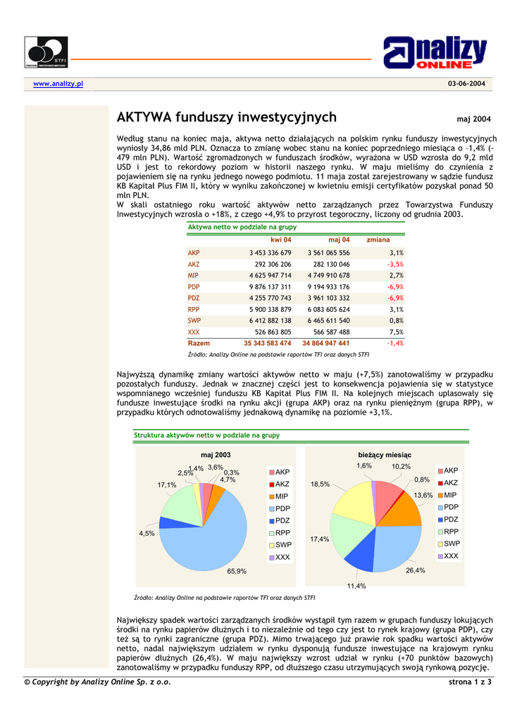www.analizy.pl 03-06-2004 AKTYWA funduszy inwestycyjnych maj 2004 Według stanu na koniec maja, aktywa netto działających na polskim rynku funduszy inwestycyjnych wyniosły 34,86 mld PLN. Oznacza to zmianę wobec stanu na koniec poprzedniego miesiąca o –1,4% (479 mln PLN). Wartość zgromadzonych w funduszach środków, wyrażona w USD wzrosła do 9,2 mld USD i jest to rekordowy poziom w historii naszego rynku. W maju mieliśmy do czynienia z pojawieniem się na rynku jednego nowego podmiotu. 11 maja został zarejestrowany w sądzie fundusz KB Kapitał Plus FIM II, który w wyniku zakończonej w kwietniu emisji certyfikatów pozyskał ponad 50 mln PLN. W skali ostatniego roku wartość aktywów netto zarządzanych przez Towarzystwa Funduszy Inwestycyjnych wzrosła o +18%, z czego +4,9% to przyrost tegoroczny, liczony od grudnia 2003. Aktywa netto w podziale na grupy kwi 04 maj 04 AKP 3 453 336 679 3 561 065 556 3,1% AKZ 292 306 206 282 130 046 -3,5% MIP 4 625 947 714 4 749 910 678 2,7% PDP 9 876 137 311 9 194 933 176 -6,9% PDZ 4 255 770 743 3 961 103 332 -6,9% RPP 5 900 338 879 6 083 605 624 3,1% SWP 6 412 882 138 6 465 611 540 0,8% XXX 526 863 805 566 587 488 7,5% 35 343 583 474 34 864 947 441 -1,4% Razem zmiana Źródło: Analizy Online na podstawie raportów TFI oraz danych STFI Najwyższą dynamikę zmiany wartości aktywów netto w maju (+7,5%) zanotowaliśmy w przypadku pozostałych funduszy. Jednak w znacznej części jest to konsekwencja pojawienia się w statystyce wspomnianego wcześniej funduszu KB Kapitał Plus FIM II. Na kolejnych miejscach uplasowały się fundusze inwestujące środki na rynku akcji (grupa AKP) oraz na rynku pieniężnym (grupa RPP), w przypadku których odnotowaliśmy jednakową dynamikę na poziomie +3,1%. Struktura aktywów netto w podziale na grupy maj 2003 17,1% 1,4% 3,6% 0,3% 2,5% 4,7% bieżący miesiąc 1,6% AKP AKZ 18,5% MIP AKP 0,8% AKZ 13,6% MIP PDP PDP PDZ PDZ RPP 4,5% 10,2% SWP RPP 17,4% SWP XXX XXX 26,4% 65,9% 11,4% Źródło: Analizy Online na podstawie raportów TFI oraz danych STFI Największy spadek wartości zarządzanych środków wystąpił tym razem w grupach funduszy lokujących środki na rynku papierów dłużnych i to niezależnie od tego czy jest to rynek krajowy (grupa PDP), czy też są to rynki zagraniczne (grupa PDZ). Mimo trwającego już prawie rok spadku wartości aktywów netto, nadal największym udziałem w rynku dysponują fundusze inwestujące na krajowym rynku papierów dłużnych (26,4%). W maju największy wzrost udział w rynku (+70 punktów bazowych) zanotowaliśmy w przypadku funduszy RPP, od dłuższego czasu utrzymujących swoją rynkową pozycję. © Copyright by Analizy Online Sp. z o.o. strona 1 z 3 www.analizy.pl 03-06-2004 W maju po raz drugi z rzędu mieliśmy do czynienie ze zbilansowaniem popytu i podaży. Szacujemy, że w ostatnim miesiącu klienci powierzyli funduszom niemalże tyle samo środków ile z nich wycofali, a saldo napływu środków wyniosło –20,4 mln PLN (–18,8 mln PLN przed miesiącem). Oczywiście wymieniona kwota zawiera ponad 50 mln PLN pozyskanych przez nowy fundusz należący do TFI Kredyt Banku. Porównanie miesięcznej zmiany wartości aktywów netto z napływem środków do funduszy jednoznacznie wskazuje na wyniki zarządzania, jako główną przyczynę spadku poziomu środków, zgromadzonych w funduszach inwestycyjnych. maj 04 sty 04 wrz 03 maj 03 sty 03 wrz 02 maj 02 sty 02 3 000 2 500 2 000 1 500 1 000 500 0 -500 -1 000 -1 500 wrz 01 Oczywiście miesięczne saldo wpłat i umorzeń było jak zwykle zróżnicowane w poszczególnych grupach funduszy. W maju, mimo dwukrotnie niższego wyniku niż przed miesiącem, najlepiej wypadły fundusze stosujące mieszaną politykę inwestycyjną (grupa MIP), do których trafiło prawie 200 mln PLN. Nieznacznie gorzej wypadły fundusze inwestujące środki na polskim rynku akcji: 21 podmiotów z grupy AKP pozyskało 175 mln PLN, a przewagę podaży nad popytem zanotowaliśmy zaledwie w jednym przypadku. Na zbliżonym poziomie zakończyły miesiąc fundusze inwestujące zebrane środki w instrumenty rynku pieniężnego, dla których poprzednie 3 miesiące, pod tym względem nie należały do zbyt udanych. Saldo wpłat i umorzeń (mln PLN) maj 01 W okresie ostatnich 12 miesięcy inwestorzy wpłacili do funduszy (netto) 4 mld PLN, z czego nieco ponad ¼ została zainwestowana w bieżącym roku. Źródło: Szacunki własne na podstawie informacji z TFI Struktura napływu środków do funduszy inwestycyjnych 600 000 000 400 000 000 AKZ AKP 200 000 000 MIP 0 -200 000 000 mar 04 kwi 04 maj 04 SWP PDZ PDP Po raz pierwszy od wielu miesięcy maj -400 000 000 RPP przyniósł całkowite wyhamowanie -600 000 000 napływu środków do funduszy XXX zagranicznych papierów dłużnych. W -800 000 000 tym przypadku przewaga wpłat nad umorzeniami przyjęła symboliczny -1 000 000 000 wymiar 11 mln PLN ze wskazaniem na popyt. To najgorszy wynik od lipca 2002 Źródło: Szacunki własne na podstawie informacji z TFI roku. Inwestorzy nadal wycofują środki z funduszy polskich papierów dłużnych. Co prawda w maju przewaga umorzeń nad wpłatami zmniejszyła się o 7%, ale dodatnie saldo wystąpiło zaledwie w dwóch przypadkach. Łącznie w ciągu miesiąca saldo wpłat i umorzeń w grupie PDP wyniosło niespełna -700 mln PLN. Tomasz Publicewicz © Copyright by Analizy Online Sp. z o.o. [email protected] strona 2 z 3 www.analizy.pl 03-06-2004 Niniejszy raport został przygotowany przy współpracy ze Stowarzyszeniem Towarzystw Funduszy Inwestycyjnych w Polsce. Spółka Analizy Online jest niezależną firmą analityczną zajmującą się monitoringiem rynku polskich i zagranicznych funduszy inwestycyjnych i emerytalnych oraz analizą rynku polskich papierów dłużnych. W zakres analiz rynku funduszy wchodzą między innymi rankingi funduszy, ocena efektywności działań zarządzających oraz analiza ich wpływu na polski rynek finansowy. Niniejsz