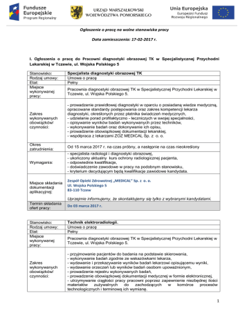 1 Ogłoszenie o pracę na wolne stanowiska pracy Data zamieszczenia