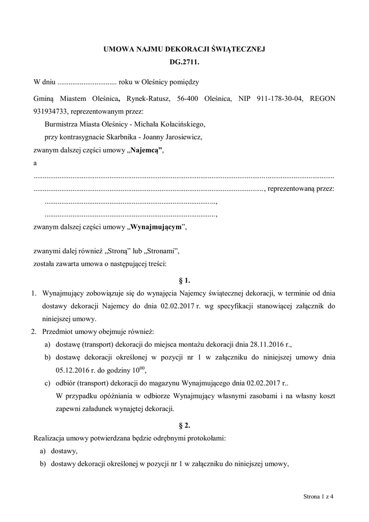 UMOWA NAJMU DEKORACJI ŚWIĄTECZNEJ DG.2711. W dniu ................................ roku w Oleśnicy pomiędzy Gminą Miastem Oleśnica, Rynek-Ratusz, 56-400 Oleśnica, NIP 911-178-30-04, REGON 931934733, reprezentowanym przez: Burmistrza Miasta Oleśnicy - Michała Kołacińskiego, przy kontrasygnacie Skarbnika - Joanny Jarosiewicz, zwanym dalszej części umowy „Najemcą”, a .................................................................................................................................................................. ............................................................................................................................, reprezentowaną przez: ............................................................................................, ............................................................................................, zwanym dalszej części umowy „Wynajmującym”, zwanymi dalej również „Stroną” lub „Stronami”, została zawarta umowa o następującej treści: § 1. 1. Wynajmujący zobowiązuje się do wynajęcia Najemcy świątecznej dekoracji, w terminie od dnia dostawy dekoracji Najemcy do dnia 02.02.2017 r. wg specyfikacji stanowiącej załącznik do niniejszej umowy. 2. Przedmiot umowy obejmuje również: a) dostawę (transport) dekoracji do miejsca montażu dekoracji dnia 28.11.2016 r., b) dostawę dekoracji określonej w pozycji nr 1 w załączniku do niniejszej umowy dnia 05.12.2016 r. do godziny 1000, c) odbiór (transport) dekoracji do magazynu Wynajmującego dnia 02.02.2017 r.. W przypadku opóźniania w odbiorze Wynajmujący własnymi zasobami i na własny koszt zapewni załadunek wynajętej dekoracji. § 2. Realizacja umowy potwierdzana będzie odrębnymi protokołami: a) dostawy, b) dostawy dekoracji określonej w pozycji nr 1 w załączniku do niniejszej umowy, Strona 1 z 4 c) odbioru, - zawierającymi specyfikację dekoracji i jej poszczególnych elementów, miejsce odbioru i datę przekazania dekoracji, ewentualne uwagi Wynajmującego i Najemcy oraz podpisy upoważnionych przedstawicieli każdej ze Stron. § 3. 1. Z tytułu wynajęcia dekoracji Najemca zapłaci Wynajmującemu wynagrodzenie w łącznej kwocie ....................... zł brutto (słownie: ..................................................................... zł .../100) uwzględniając w tym podatek VAT w wysokości ......... %. 2. Wynagrodzenie brutto Wynajmującego obejmuje ewentualną zmianę stawki podatku VAT. 3. Wynajmujący wystawi fakturę VAT na kwotę, o której mowa w § 3 ust. 1 niniejszej umowy na podstawie podpisanych przez Strony umowy protokołów, o których mowa w § 2 lit. a i lit. b. Fakturę należy złożyć w siedzibie Najmującego najpóźniej w terminie do 16 grudnia 2016 r. 4. Należności za wynajem dekoracji świątecznej zostaną zapłacone w terminie 30 dni od daty wystawienia przez Wynajmującego prawidłowej faktury, pod warunkiem, że faktura wpłynie do Najemcy nie później niż 14 dni przed upływem terminu płatności. W przypadku opóźnień w dostarczaniu do Najemcy wystawionej faktury, termin płatności ulegnie przesunięciu o liczbę dni opóźnienia. Za dzień zapłaty przyjmuje się dzień obciążenia rachunku bankowego. 5. Wynagrodzenie za wykonanie przedmiotu umowy zostanie wypłacone Wynajmującemu przelewem na jego rachunek bankowy wskazany w fakturze VAT. 6. Za datę zapłaty uznaje się datę obciążenia rachunku bankowego Najemcy. 7. Faktura VAT powinna być wystawiona na: Gminę Miasto Oleśnica, Rynek-Ratusz, 56-400 Oleśnica NIP 911-178-30-04. § 4. 1. Wynajmujący oświadcza, iż przedmiot umowy będzie wykonany zgodnie z przedłożonymi zdjęciami i opisem technicznym dekoracji świątecznej. 2. Wynajmujący gwarantuje niewadliwe i bezusterkowe działanie dekoracji przez cały okres trwania najmu. 3. W przypadku stwierdzenia wad lub usterek dekoracji (w tym wynikających z normalnego zużycia poszczególnych elementów) Wynajmujący zobowiązuje się do wymiany elementów dekoracyjnych w terminie 3 dni roboczych od daty otrzymania pisemnego lub emailowego zgłoszenia usterki. Strona 2 z 4 4. Warunkiem uzyskania przez Najemcę uprawnień, o których mowa w ust. 1, jest wykonany montaż dekoracji przez Wynajmującego firmy posiadające wymagane uprawnienia i doświadczenie w tego typu realizacjach. 5. Wynajmujący oświadcza, że posiada ubezpieczenie OC z tytułu wykonywanej działalności. § 5. 1. W przypadku zawinionej przez Wynajmującego zwłoki w dostarczeniu elementów dekoracji, Wynajmujący zapłaci Najemcy karę umowną w wysokości 0,5 % kwoty wynagrodzenia brutto za dany element dekoracji określonego w załączniku do niniejszej umowy za każdy dzień zwłoki. Wyjątek stanowi dekoracja określona w pozycji nr 1 w załączniku do niniejszej umowy, za zwłokę w jej dostarczeniu Wynajmujący zapłaci karę umowną w wysokości 5 % kwoty wynagrodzenia brutto określonego w załączniku za każdy dzień zwłoki, z tym że zrealizowanie dostawy po godzinie 1000 dnia 05.12.2016 r. uznaje się za dzień następny. 2. W przypadku protokolarnie stwierdzonej niezgodności opisu technicznego dekoracji ze stanem rzeczywistym wynajętych elementów składających się na Przedmiot umowy – kara umowna wynosi 1000 zł za każdy stwierdzony przypadek niezgodności. 3. W przypadku bezskutecznego upływu terminu określonego § 4 ust. 1 Najemcy przysługuje prawo do obciążenia Wynajmującego karą umowną w postaci zwrotu wartości brutto wynajmu danego elementu dekoracji w wysokości określonej w załączniku do niniejszej umowy. 4. W przypadku odstąpienia przez Wynajmującego od niniejszej umowy lub jej rozwiązania z winy Wynajmującego lub w przypadku odstąpienia przez Najemcę od niniejszej umowy z winy Wynajmującego, Wynajmujący zapłaci Najemcy karę umowną w wysokości 10 % wynagrodzenia brutto, o którym mowa w § 3 ust. 1, w terminie 3 dni od daty otrzymania noty obci