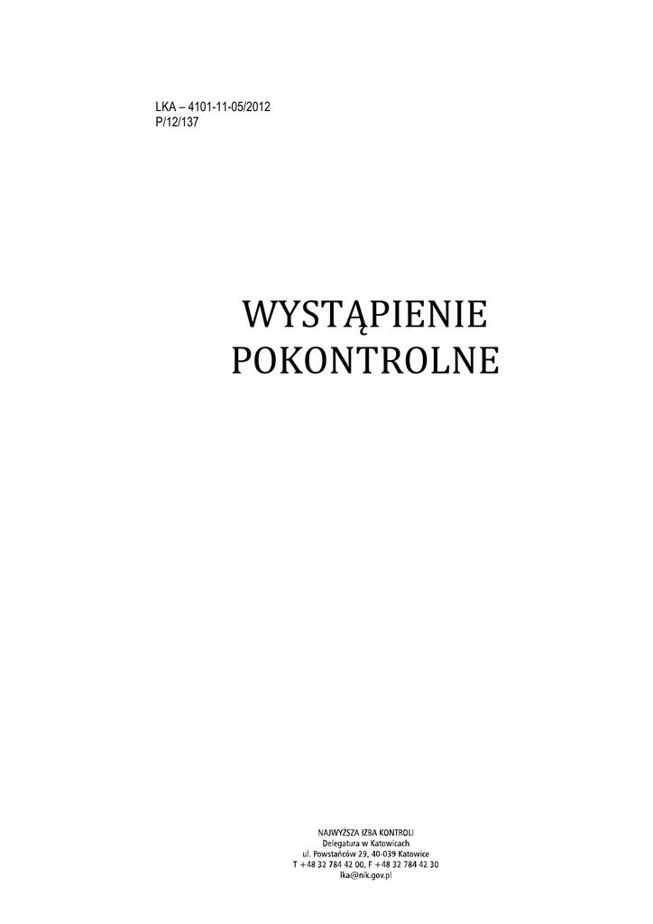LKA – 4101-11-05/2012 P/12/137 WYSTĄPIENIE POKONTROLNE I. Dane identyfikacyjne kontroli Numer i tytuł kontroli P/12/137 – Realizacja przepisów ustawy o ochronie zdrowia przed następstwami uŜywania tytoniu i wyrobów tytoniowych1. Jednostka przeprowadzająca kontrolę NajwyŜsza Izba Kontroli Delegatura w Katowicach Kontroler Artur Stekla, główny specjalista kontroli państwowej, upowaŜnienie do kontroli nr 82758 z dnia 16 sierpnia 2012 r. (dowód: akta kontroli str. 1-2) Jednostka kontrolowana Komenda Powiatowa Policji w Pszczynie2, ul. Bogedaina 18, 43-200 Pszczyna Kierownik jednostki kontrolowanej inspektor Dariusz Polis, Komendant Powiatowy Policji w Pszczynie3 od dnia 16 września 2006 r. Zastępcą Komendanta jest od dnia 16 kwietnia 2003 r. młodszy inspektor Janusz Wilczek. (dowód: akta kontroli str. 3) II. Ocena kontrolowanej działalności NajwyŜsza Izba Kontroli ocenia pozytywnie mimo stwierdzonych nieprawidłowości4 działalność kontrolowanej jednostki w zbadanym zakresie. Ocena ogólna W obiekcie Komendy w widocznych miejscach zamieszczono informacje o zakazie palenia tytoniu w budynku, a zakaz ten w pomieszczeniach oraz przylegających terenach był przestrzegany. Nie odnotowano równieŜ skarg związanych z naruszeniem ww. ustawy antynikotynowej, ani teŜ nie stwierdzono przypadków jej naruszania. Uzasadnienie oceny ogólnej W Komendzie nieprawidłowo realizowano przepisy rozporządzenia Ministra Spraw Wewnętrznych i Administracji z dnia 11 maja 2011 r. w sprawie szczegółowych warunków uŜywania wyrobów tytoniowych na terenie obiektów oraz w środkach przewozu osób podlegających ministrowi właściwemu do spraw wewnętrznych5 poniewaŜ w zajmowanym obiekcie oraz w oznakowanych środkach przewozu brakowało oznaczeń o treści zgodnej z § 2 tego rozporządzenia. 1 Dz. U. z 1996 r. Nr 10, poz. 55 ze zm. (dalej: ustawa antynikotynowa) dalej: Komenda dalej: Komendant 4 NajwyŜsza Izba Kontroli stosuje 3-stopniową skalę ocen: pozytywna, pozytywna mimo stwierdzonych nieprawidłowości, negatywna. 2 3 5 Dz. U. z 2011 r., Nr 97, poz. 564 (dalej: rozporządzenie MSWiA) 2 III. Opis ustalonego stanu faktycznego 1. Ocena przestrzegania zakazu palenia w obiektach i środkach przewozu osób. 1.1. Oznakowanie obiektów i środków przewozu osób. Opis stanu faktycznego Siedziba Komendy znajduje się w budynku administracyjnym zlokalizowanym na terenie połoŜonym w Pszczynie przy ul. Ks. Biskupa Bogedaina 18, trwale odgrodzonym od sąsiednich nieruchomości gruntowych. Na terenie tym znajdują się równieŜ budynki garaŜowe, warsztatowe, kojce dla psów słuŜbowych oraz wewnętrzne place i wybiegi dla psów. Do budynku administracyjnego, będącego obiektem w rozumieniu rozporządzenia MSWiA prowadziły dwa wejścia, z których jedno było głównym wejściem ogólnodostępnym, a drugie było wejściem gospodarczym (do kondygnacji piwnicznej) dostępnym wyłącznie dla przewodników psów oraz pracowników gospodarczych. (dowód: akta kontroli str. 10) Ustalone nieprawidłowości W działalności kontrolowanej jednostki w przedstawionym wyŜej zakresie stwierdzono następujące nieprawidłowości: 1. Według stanu na dzień rozpoczęcia kontroli (21 sierpnia 2012 r.) oznaczenia zawierające informacje graficzne i słowne o zakazie palenia tytoniu na terenie całego obiektu, umieszczone w ogólnodostępnym wejściu do budynku administracyjnego oraz wewnątrz tego budynku były zgodne z art. 5 ust. 1a ustawy antynikotynowej, jednakŜe nie spełniały wymogów informacyjnych wynikających z § 2 powyŜszego rozporządzenia MSWiA, zgodnie z którym kierownicy obiektów podlegających MSWiA umieszczają w widocznych miejscach informację słowną i graficzną o zakazie uŜywania wyrobów tytoniowych w tych obiektach oraz w oznakowanych środkach przewozu osób. 2. Oględzinom poddano równieŜ siedem oznakowanych środków przewozu osób (radiowozów Komendy), z których pięć w dniu 21 sierpnia 2012 r. nie było oznaczonych informacjami (umieszczonymi przy wejściach do tych pojazdów) informującymi o zakazie uŜywania wyrobów tytoniowych. Stanowiło to naruszenie § 2 ww. rozporządzenia MSWiA. W pozostałych dwóch skontrolowanych pojazdach naklejki zawierające informację graficzną o zakazie palenia były umieszczone w słabo widocznym miejscu bądź na elemencie wyposaŜenia przenośnego, co zdaniem NIK równieŜ nie spełniało wymogów § 2 tego rozporządzenia. Przyczyną stwierdzonych nieprawidłowości oraz uchybień w zakresie oznaczenia budynku administracyjnego było przeoczenie zapisów obowiązującego rozporządzenia MSWiA przez pracownika Komendy odpowiedzialnego m.in. za sprawy bezpieczeństwa i higieny pracy, a zajmującego się w imieniu Komendanta zagadnieniami związanymi z realizacją postanowień ustawy antynikotynowej. Natomiast zgodnie z wyjaśnieniami ww. osoby za dystrybucję uzyskanych przez Komendę naklejek słuŜących do oznaczenia pojazdów odpowiadał Zespół Zaopatrzenia i Finansów Komendy. (dowód: akta kontroli str. 4-6, 25-26) Ocena cząstkowa NajwyŜsza Izba Kontroli ocenia pozytywnie, mimo stwierdzonych nieprawidłowości, działalność kontrolowanej jednostki w zbadanym obszarze. 3 1.2. Spełnianie wymogów ustawowych przez palarnie wyznaczone na terenie obiektów jednostki Opis stanu faktycznego Na terenie obiektu i terenu Komendy nie wyznaczono palarni jak równieŜ nie wyznaczono miejsca, w którym uŜywanie wyrobów tytoniowych jest dozwolone, spełniającego wymogi określone w § 3 ust. 2 rozporządzenia MSWiA. PowyŜsze ustalono w wyniku przeprowadzonych oględzin obiektów i terenów Komendy. (dowód: akta kontroli str. 4-6, 19) 1.3. Przestrzeganie zakazu palenia na terenie jednostki. Opis stanu faktycznego W wyniku oględzin przeprowadzonych w dniu 21 sierpnia 2012 r. 30 z 62 pomieszczeń, pięciu ciągów komunikacyjnych (korytarzy), sanitariatów i dostępnych pomieszczeń piwnicznych znajdujących si