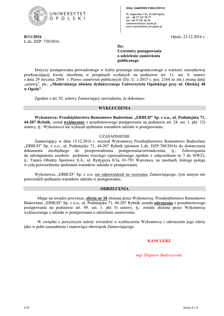 DZIAŁ ZAMÓWIEŃ PUBLICZNYCH Pl. Kopernika 11A, 45–040 Opole tel. +48 77 541 59 77 fax +48 77 541 60 26 [email protected] www.zamowienia.uni.opole.pl B/11/2016 L.dz. DZP: 730/2016 Opole, 23.12.2016 r. Do: Uczestnicy postępowania o udzielenie zamówienia publicznego Dotyczy postępowania prowadzonego w trybie przetargu nieograniczonego o wartości szacunkowej przekraczającej kwotę określoną w przepisach wydanych na podstawie art. 11. ust. 8. ustawy z dnia 29 stycznia 2004 r. Prawo zamówień publicznych (Dz. U. z 2015 r. poz. 2164 ze zm.) zwaną dalej „ustawą”, pn.: „Modernizacja obiektu dydaktycznego Uniwersytetu Opolskiego przy ul. Oleskiej 48 w Opolu”. Zgodnie z art. 92. ustawy Zamawiający zawiadamia, że dokonano: WYKLUCZENIA Wykonawca: Przedsiębiorstwo Remontowo Budowlane „ERBUD” Sp. z o.o., ul. Podmiejska 71, 44-207 Rybnik, został wykluczony z przedmiotowego postępowania na podstawie art. 24. ust. 1. pkt. 12) ustawy, tj.: Wykonawca nie wykazał spełniania warunków udziału w postępowaniu. UZASADNIENIE Zamawiający w dniu 15.12.2016 r. wezwał Wykonawcę Przedsiębiorstwo Remontowo Budowlane „ERBUD” Sp. z o.o., ul. Podmiejska 71, 44-207 Rybnik (pismem L.dz. DZP:708/2016) do dostarczenia dokumentu niezbędnego do przeprowadzenia postępowania/oświadczenia, tj.: Zobowiązania do udostępnienia zasobów podmiotu trzeciego (sporządzonego zgodnie z załącznikiem nr 7 do SIWZ), tj.: Tamex Obiekty Sportowe S.A., ul. Rydygiera 8/3a, 01-793 Warszawa, na zasobach, którego polega w celu potwierdzenia spełniania warunków udziału w postępowaniu. Wykonawca „ERBUD” Sp. z o.o. nie odpowiedział na wezwanie Zamawiającego, tym samym nie potwierdził spełniania warunków udziału w postępowaniu. ODRZUCENIA Mając na uwadze powyższe, oferta nr 10 złożona przez Wykonawcę: Przedsiębiorstwo Remontowo Budowlane „ERBUD” Sp. z o.o., ul. Podmiejska 71, 44-207 Rybnik została odrzucona z przedmiotowego postępowania na podstawie art. 89. ust. 1. pkt 5) ustawy, tj.: została złożona przez Wykonawcę wykluczonego z udziału w postępowaniu o udzielenie zamówienia. W związku z powyższym należy stwierdzić o wykluczeniu Wykonawcy i odrzuceniu jego oferty jako w pełni uzasadnione i stanowiące obowiązek Zamawiającego. KANCLERZ mgr Zbigniew Budziszewski E.W. Strona 1 z 1